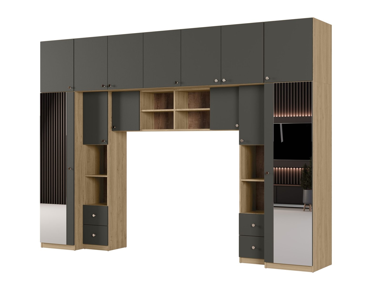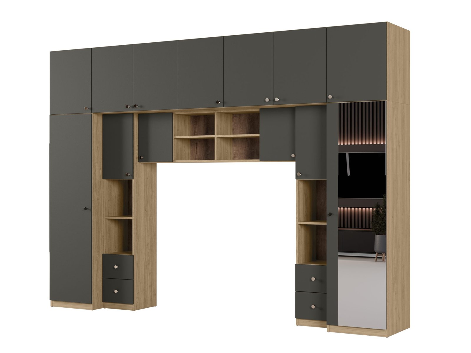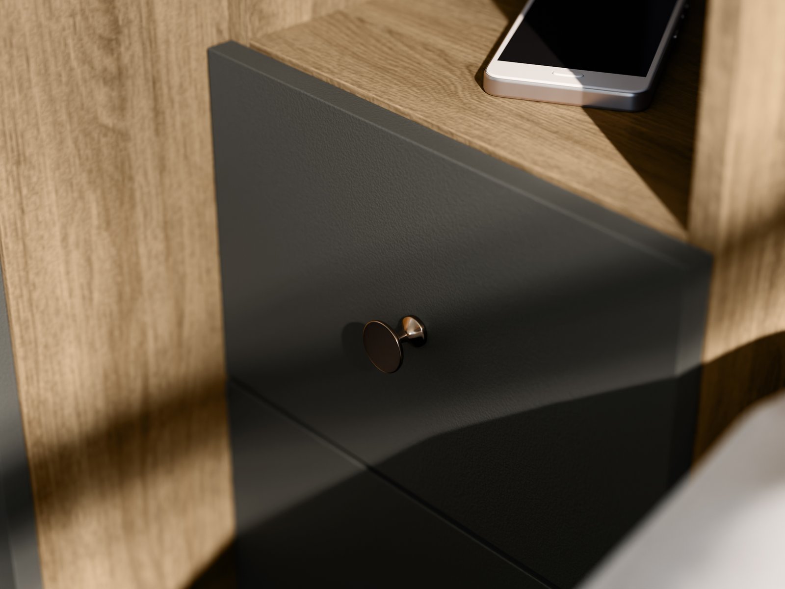Baldai pagaminti iš aukščiausios kokybės, 18 mm storio, dvipusės laminuotos „Woodeco“ (anksčiau „Pfleiderer“) plokštės.Visi elementai, įskaitant ir apatinę pusę prie grindų, yra klijuoti itin patvariu 0,8 mm storio PVC kraštu. Tai suteikia papildomą apsaugą nuo drėgmės valant grindis. Galinės sienelės pagamintos iš 3 mm storio HDF plokštės, viena pusė lakuota (spalva, panaši į baldo korpuso). Ši parinktis suteikia galimybę rinktis standartinę arba aukščiausios kokybės furnitūrą. Spalva: carpenter grafit. Kaina nurodyta be veidrodžių.