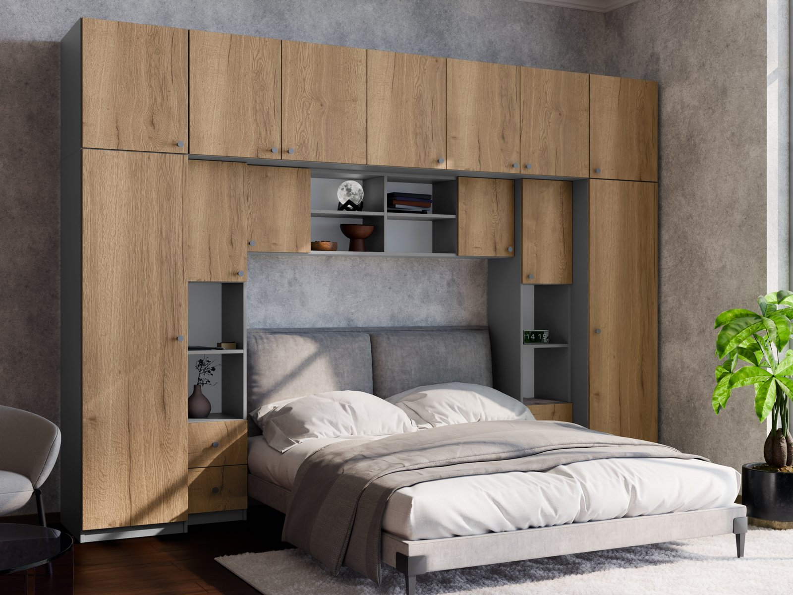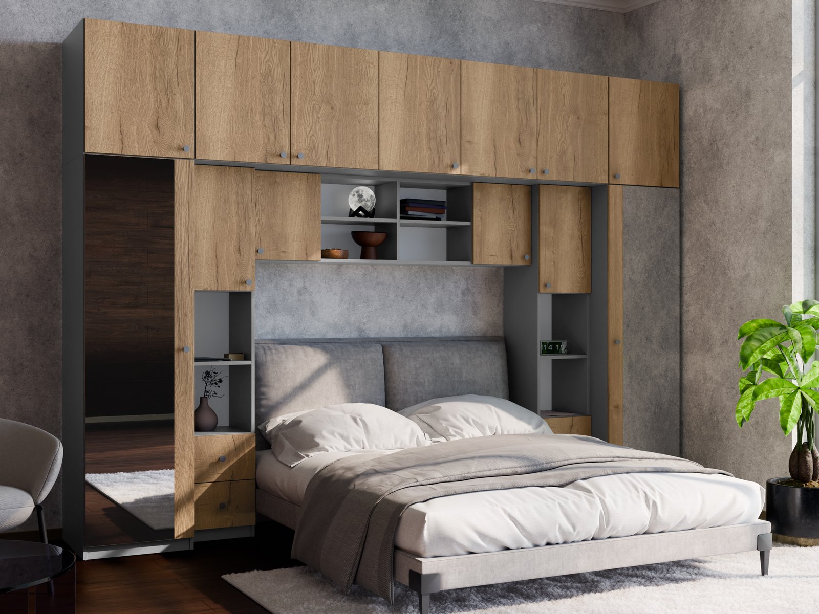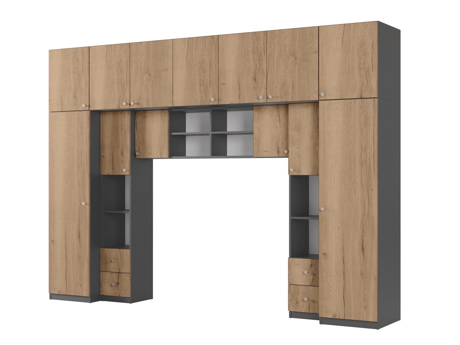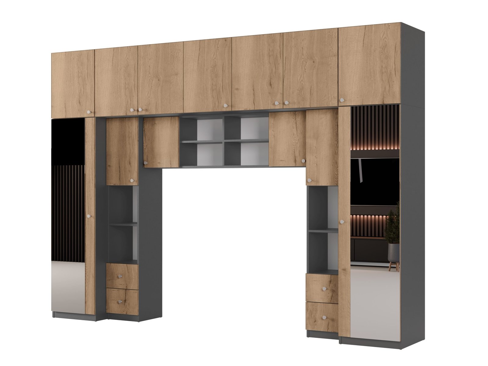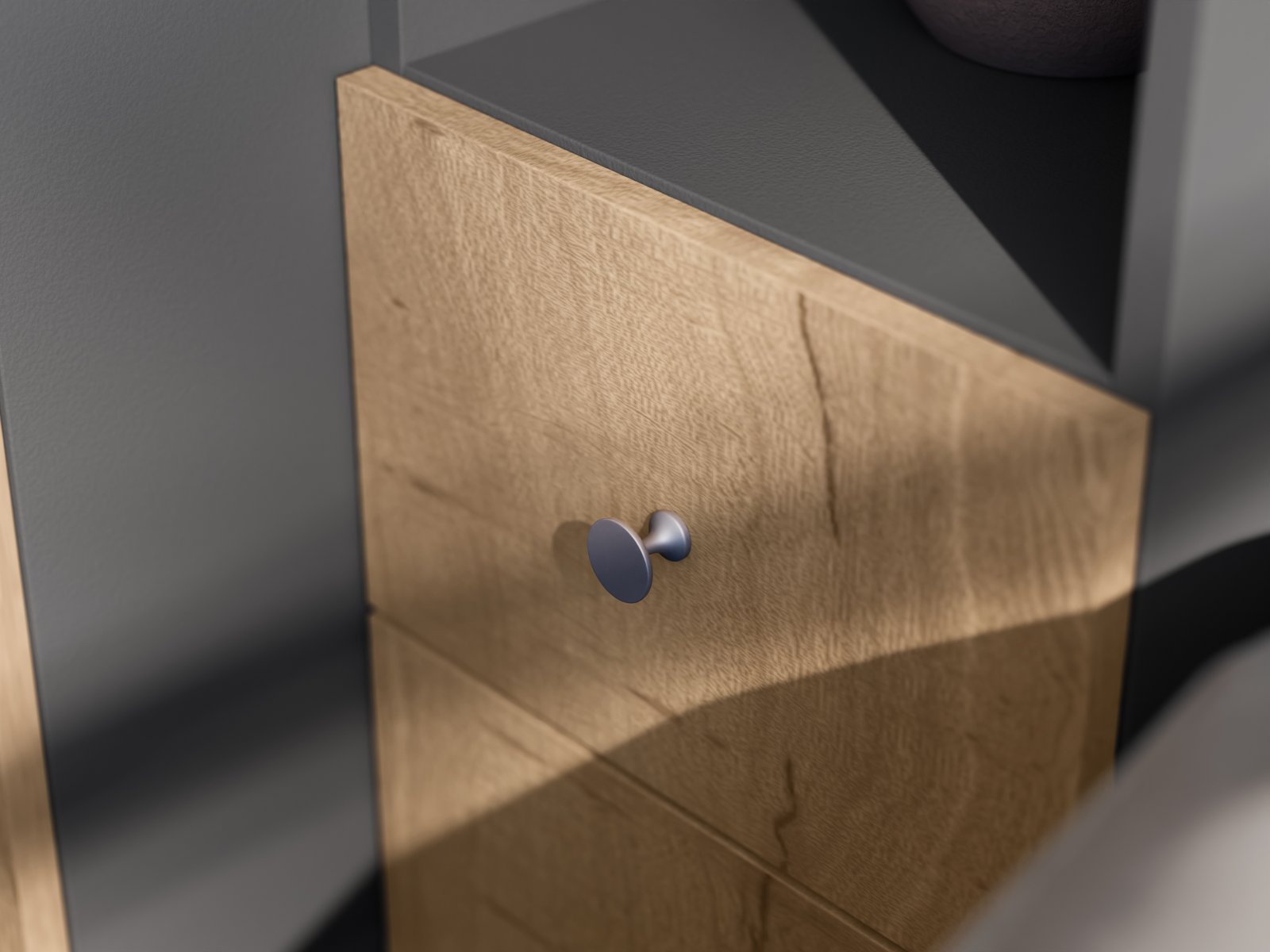Baldai pagaminti iš aukščiausios kokybės, 18 mm storio, dvipusės laminuotos „Woodeco“ (anksčiau „Pfleiderer“) plokštės.Visi elementai, įskaitant ir apatinę pusę prie grindų, yra klijuoti itin patvariu 0,8 mm storio PVC kraštu. Tai suteikia papildomą apsaugą nuo drėgmės valant grindis. Galinės sienelės pagamintos iš 3 mm storio HDF plokštės, viena pusė lakuota (spalva, panaši į baldo korpuso). Ši parinktis suteikia galimybę rinktis standartinę arba aukščiausios kokybės furnitūrą. Spalva: dab halifax- pilka. Kaina nurodyta be veidrodžių.