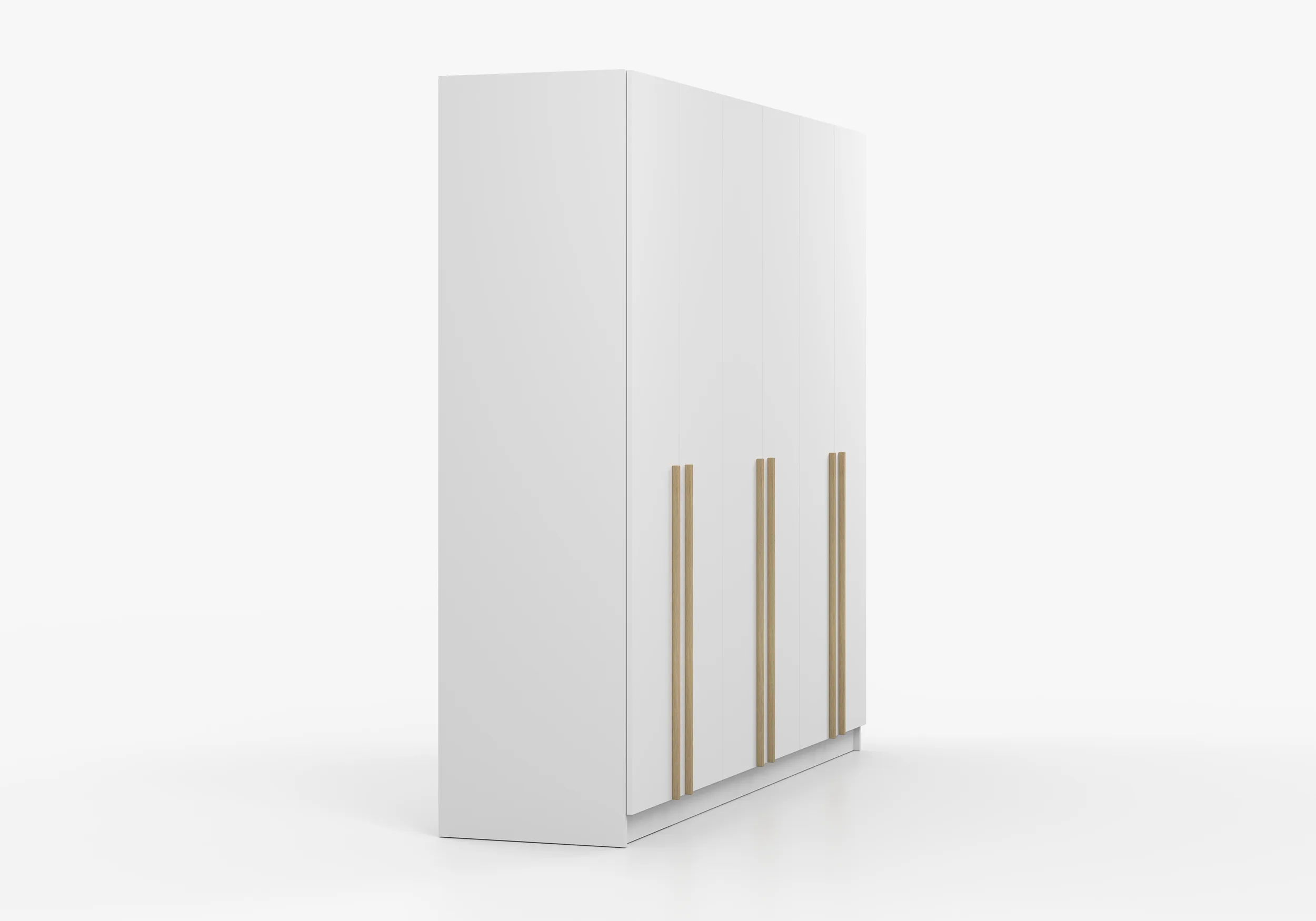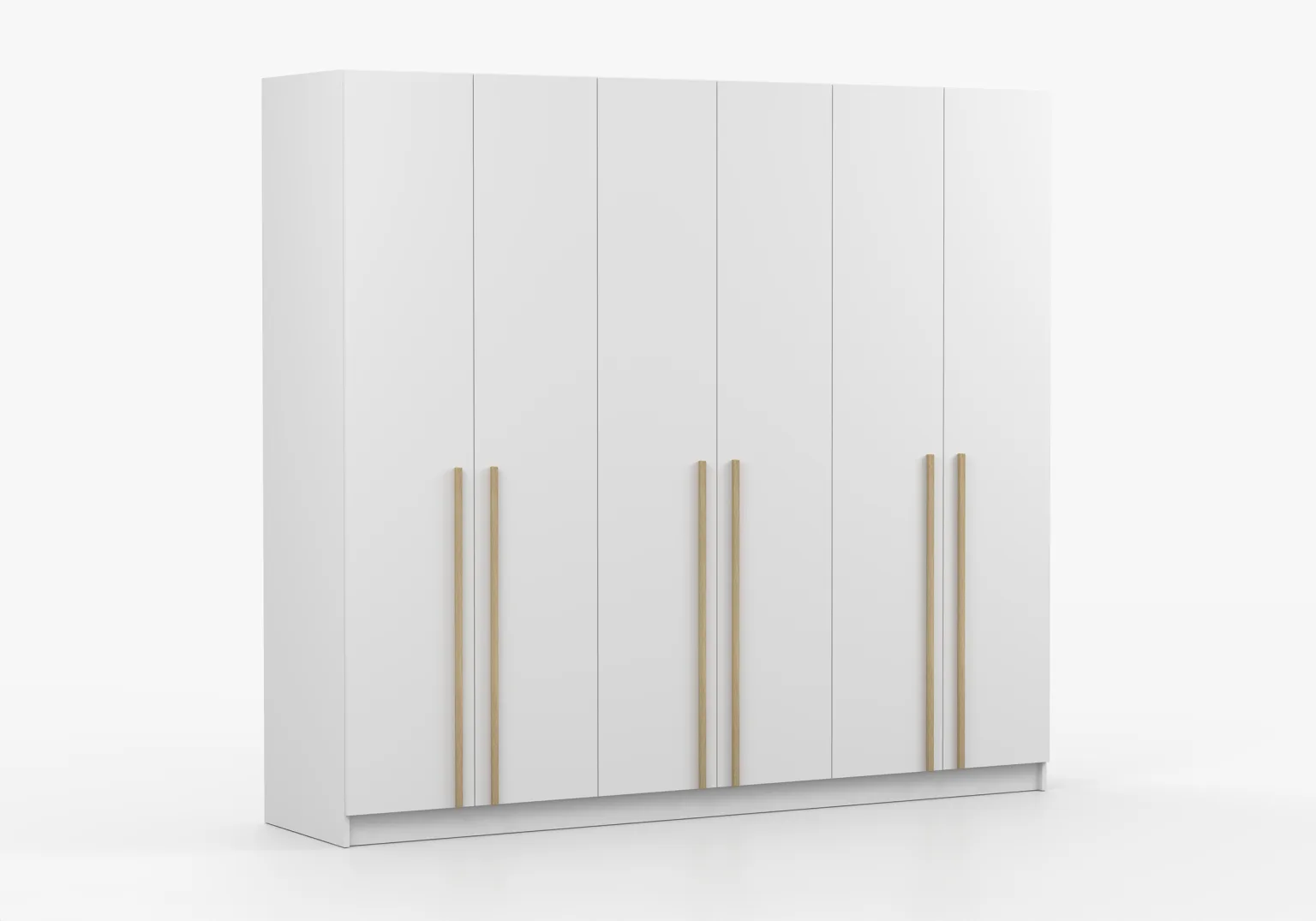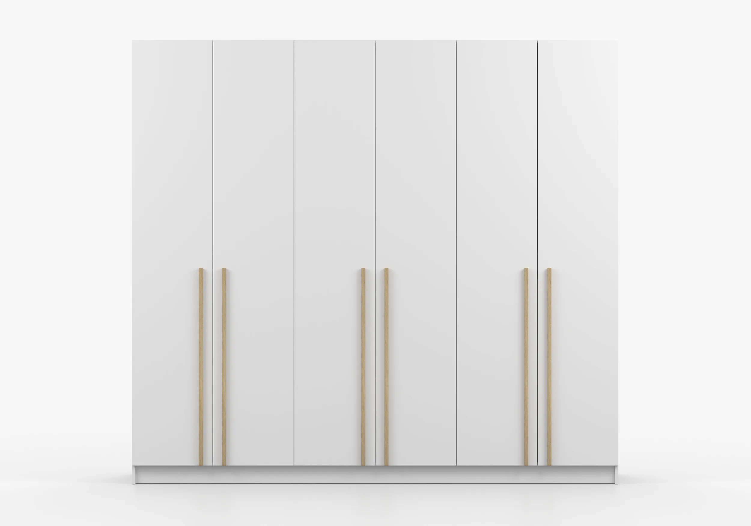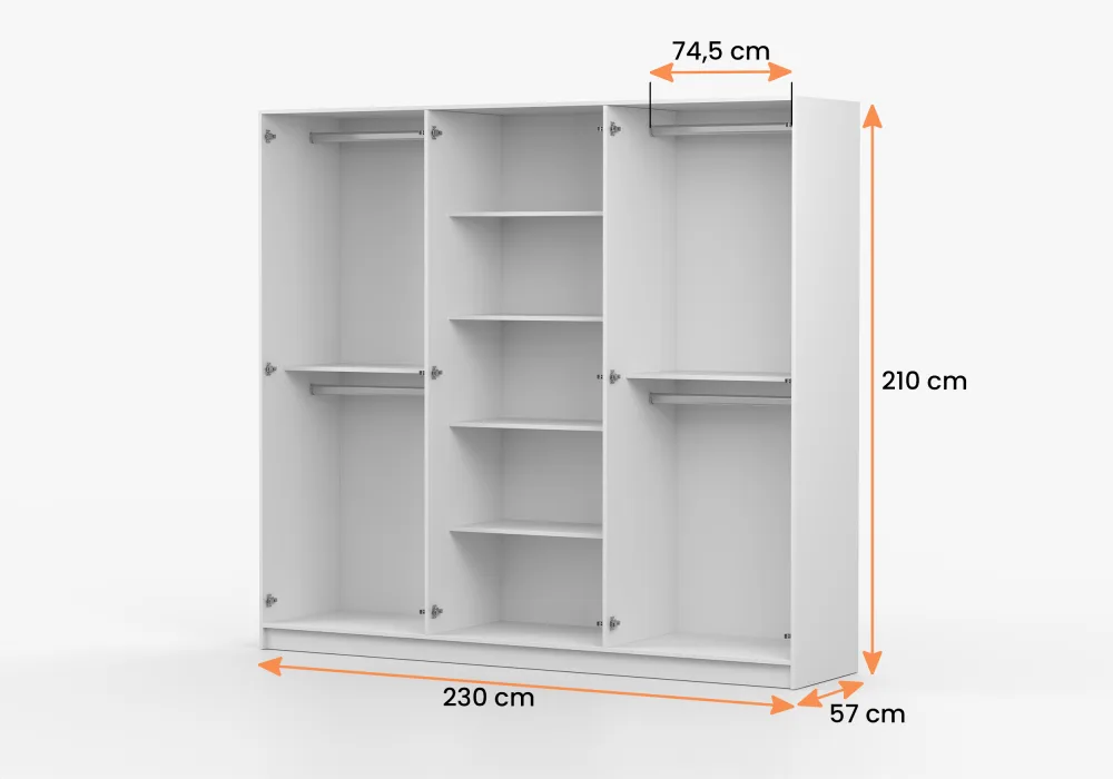 Tradiciškai atidaromos durys užtikrina patogią prieigą prie vidaus, kuriame yra keturi praktiški pakabos bėgeliai ir funkcionalios lentynos. Šešių durų spinta su tradiciniu atidarymu ,16 mm storio laminuota baldų plokštė.Pakabos  (4 vnt.) Kraštai pilnai apdailinti ABS fanera .Erdvios lentynos (5 vnt.)Spalva-balta matinė.