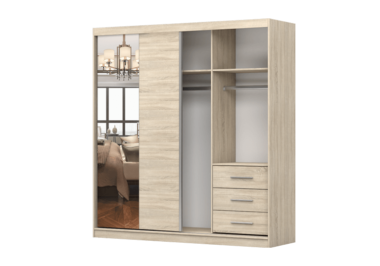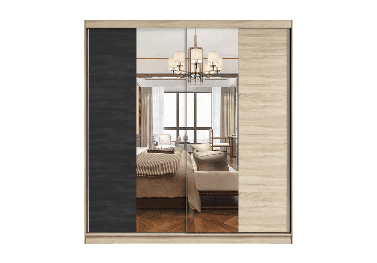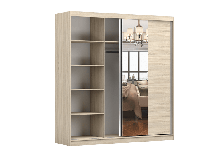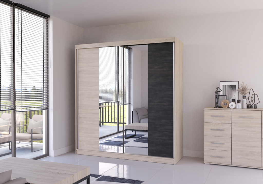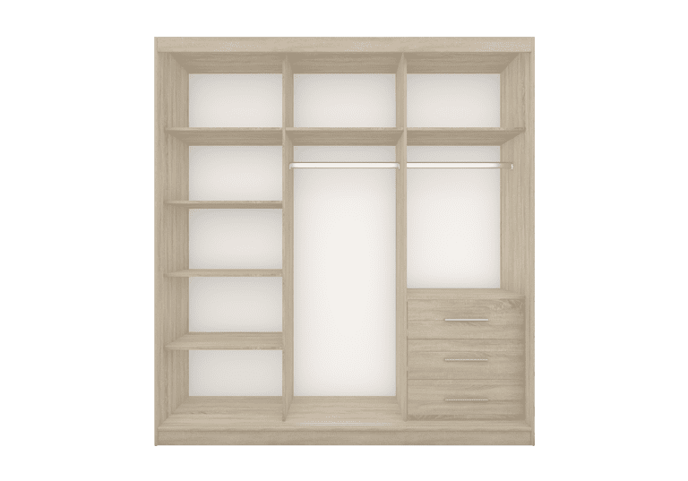 Dviejų durų su veidrodžiu miegamojo spinta vidaus išplanavimas: spinta vertikaliai padalinta į tris dalis, vidurinėje dalyje yra rūbų kabykla, virš jos yra lentyna; dešinėje pusėje yra rūbų kabykla marškiniams, viršuje yra lentyna, o apačioje yra stalčiai; dešinėje spintos pusėje yra stalčių blokas.