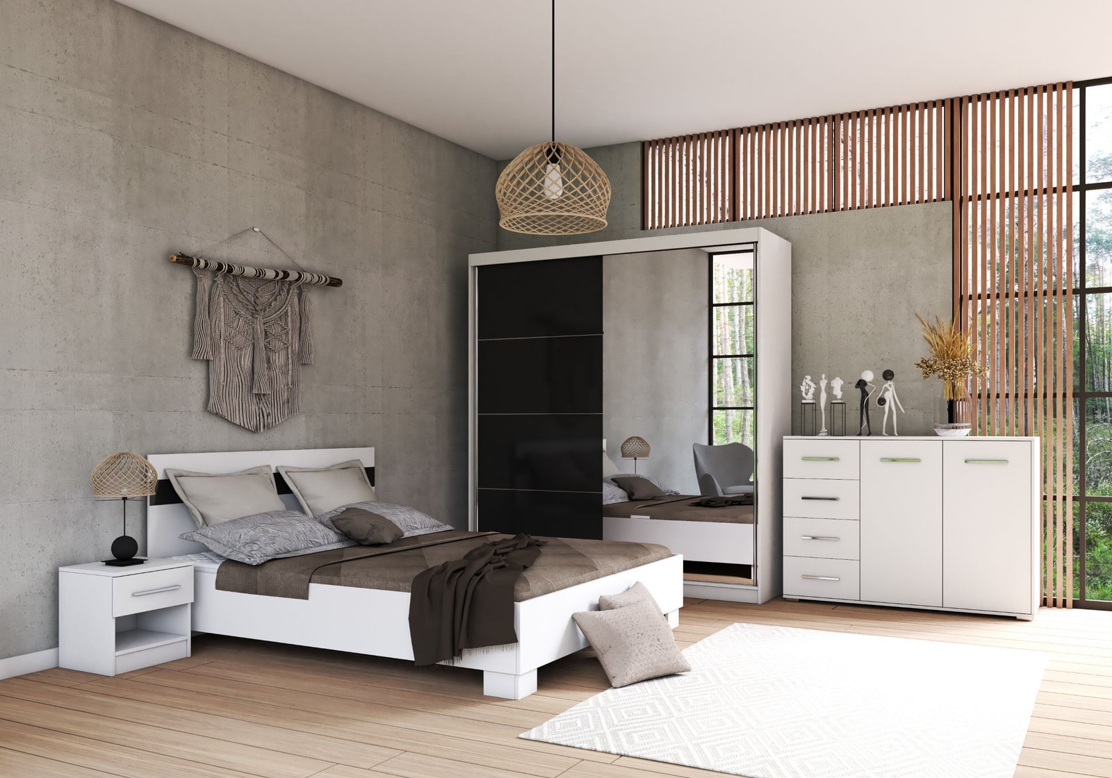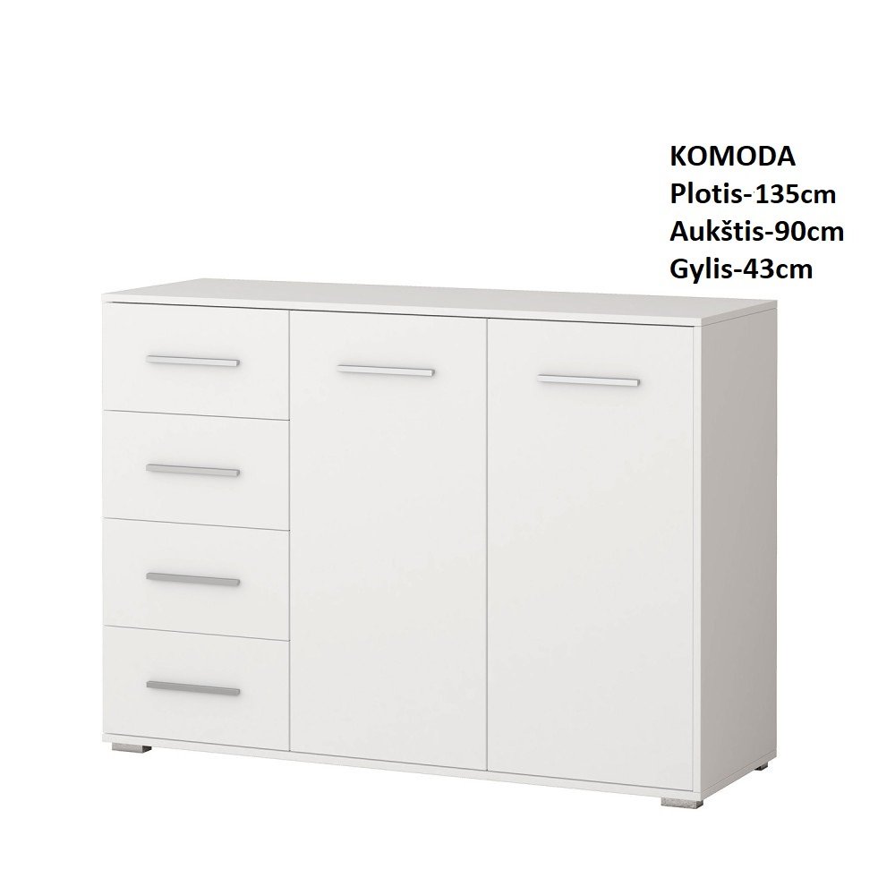 K-tą sudaro: 183cm durų spinta,lova 160 –be čiužinio, 2 naktinės spintelės,komoda 135 cm