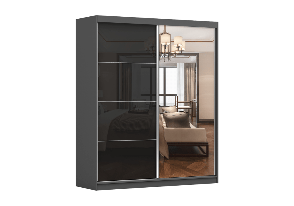 Spalva:  Korpusas SONOMA ĄŽUOLAS, BALTA, PILKA , JUODA.                                                                                          Durys JUODA-BLIZGI .Stumdoma spinta su veidrodžiu (2 durys) (183×218,  203×218,  233×218).
