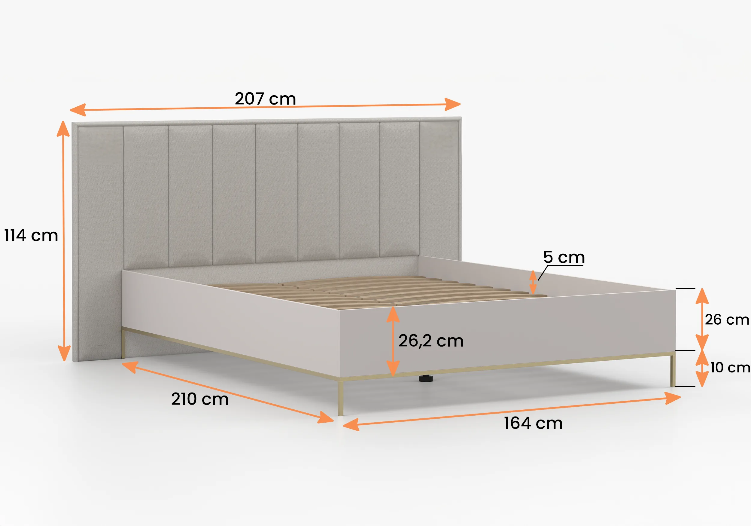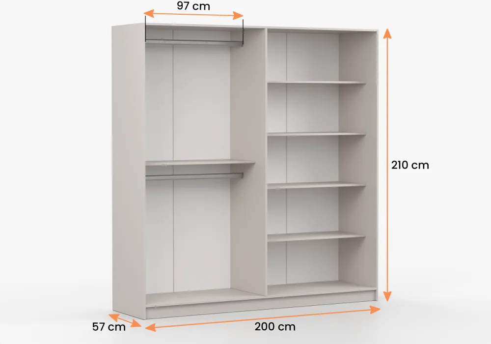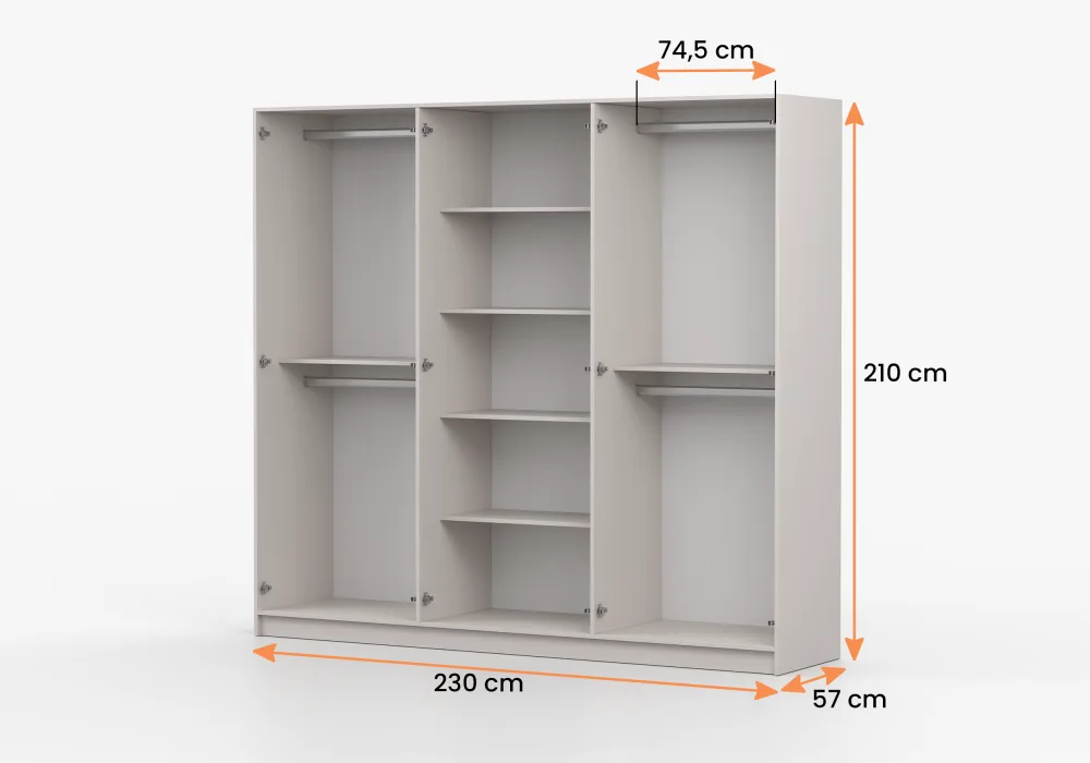 Tradicinio atidarymo spintos (4, 6 durų) (200, 230×210).Miegamajame yra 4 arba 6 durų spinta su dekoratyvinėmis auksinėmis rankenomis. KASHMIR lova pasižymi minkštu, apmuštu galvūgaliu, suteikiančiu stiliaus ir elegancijos. Lovos miegojimo dalis (160×200) yra puiki vieta atsipalaiduoti ir pailsėti. Komodos su dviem versijomis – su 4 stalčiais arba su 3 spintelėmis – yra puikus sprendimas jūsų asmeninių daiktų laikymui.  Naktinis staliukas, 50 cm pločio. Su 2 stalčiais ir auksinėmis rankenomis bei kojelėmis.K-to kaina nurodyta su 2m spinta ir komoda -70cm.