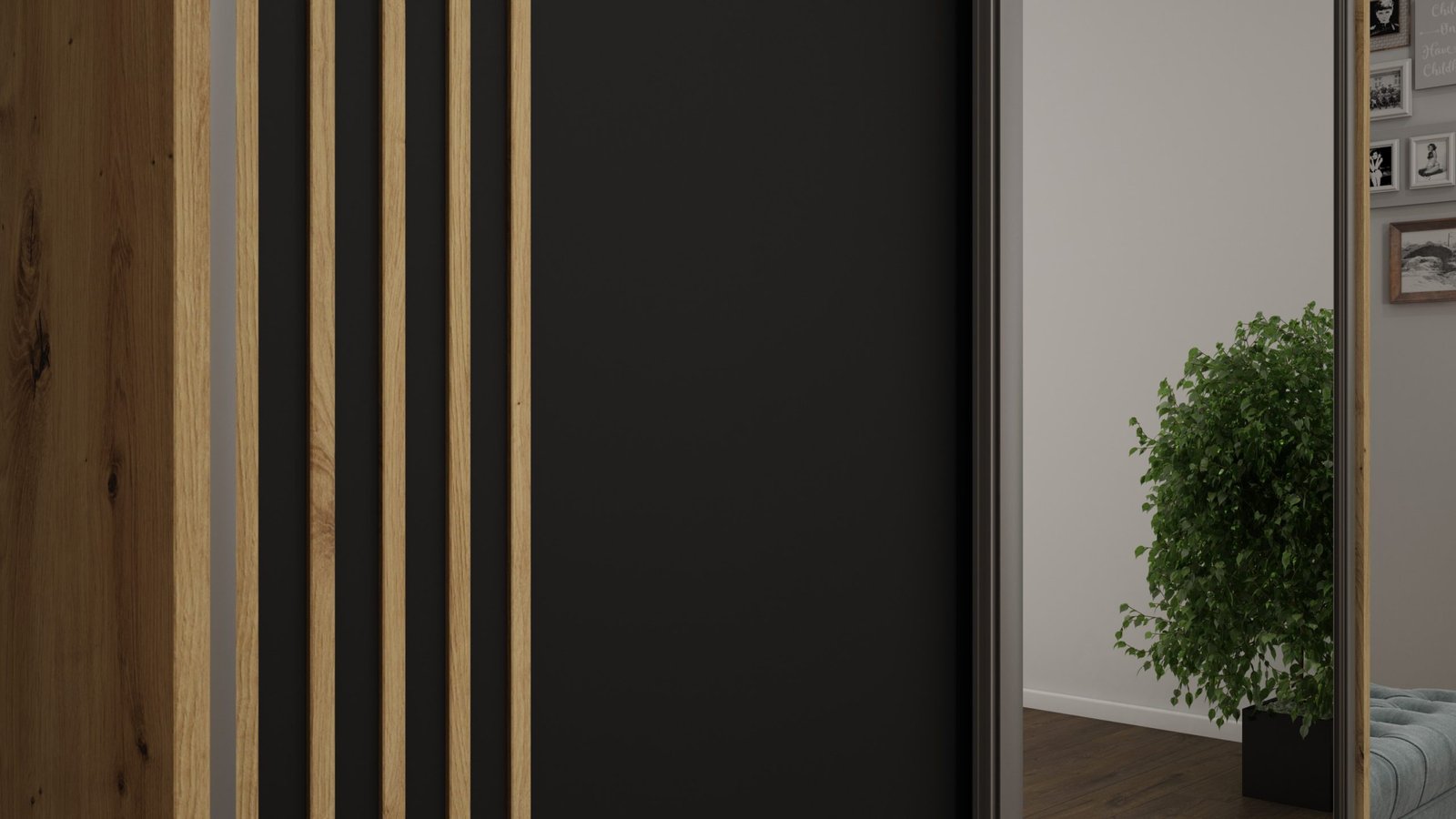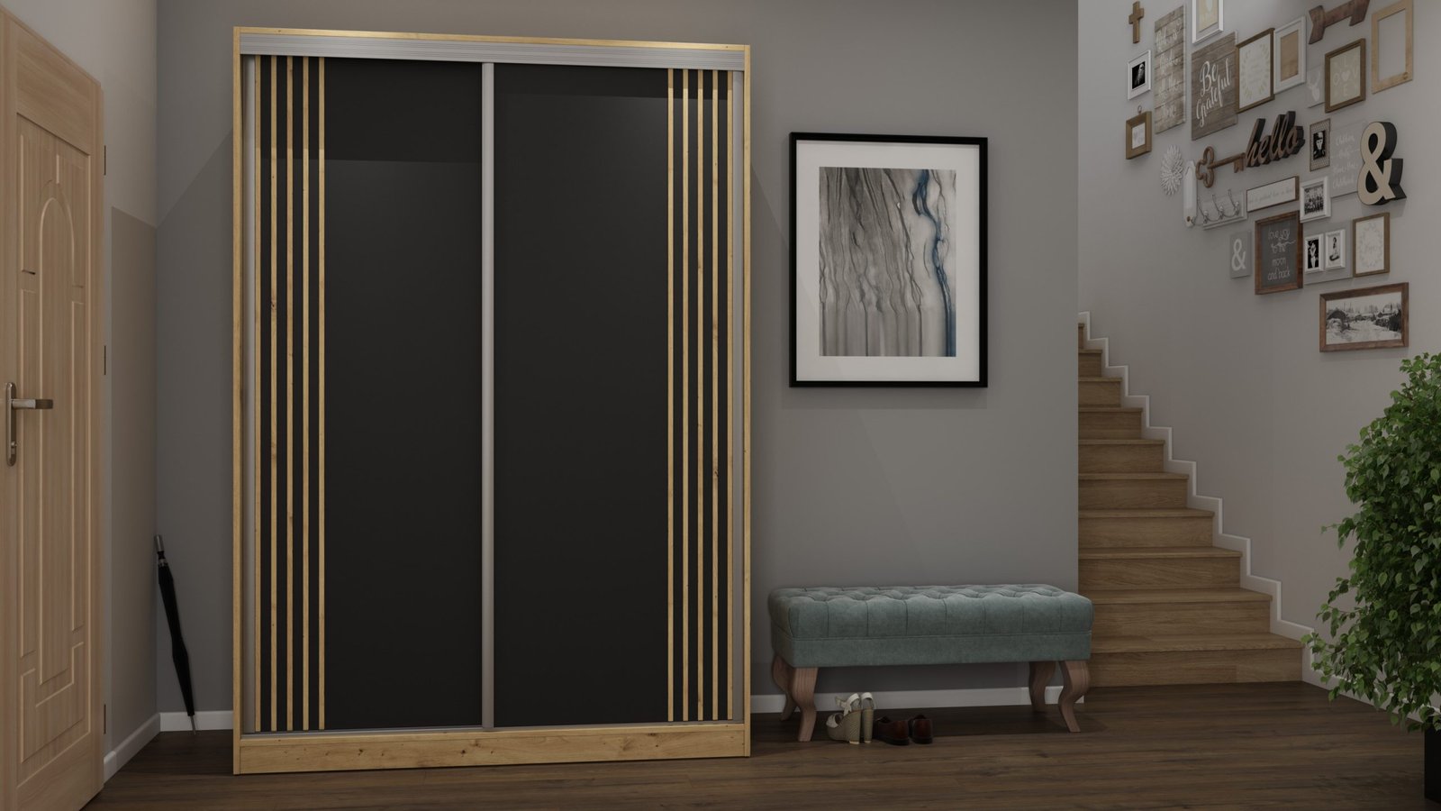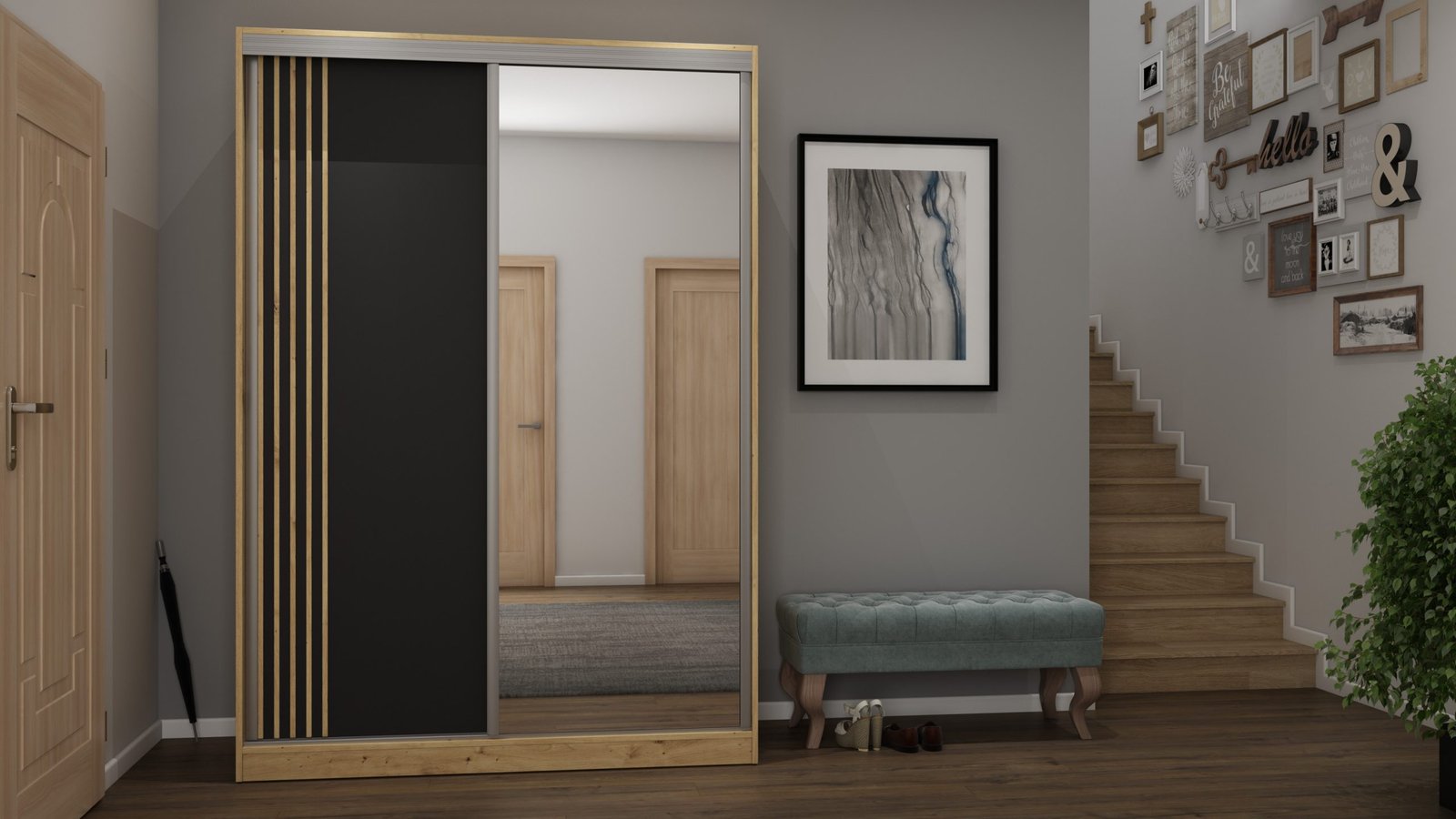 Dvigubi aliuminio bėgeliai su viršutine ir apatine kreipiančiąja sistema, dėka itin tvirtų metalinių vežimėlių su rutuliniais guoliais. Aliuminio rankenos per visą durų aukštį leidžia lengvai judinti duris, nerizikuojant jų sulenkti. Buferiniai šepetėliai apsaugo nuo smūgių į spintelės šonus.Viršutinis vežimėlio pozicionierius užtikrina, kad uždarytos durys būtų vienoje lygyje su spintelės šonu ir pačios neatsidarytų.Prie durų priklijuotos dekoratyvinės aliuminio stiklinimo juostos.Aliuminio H jungtys (pasirinktuose modeliuose) užtikrina, kad skirtingos durų spalvos puikiai derėtų. Spalva-LAMELE. Su veidrodžiu kaina-  960 Eur