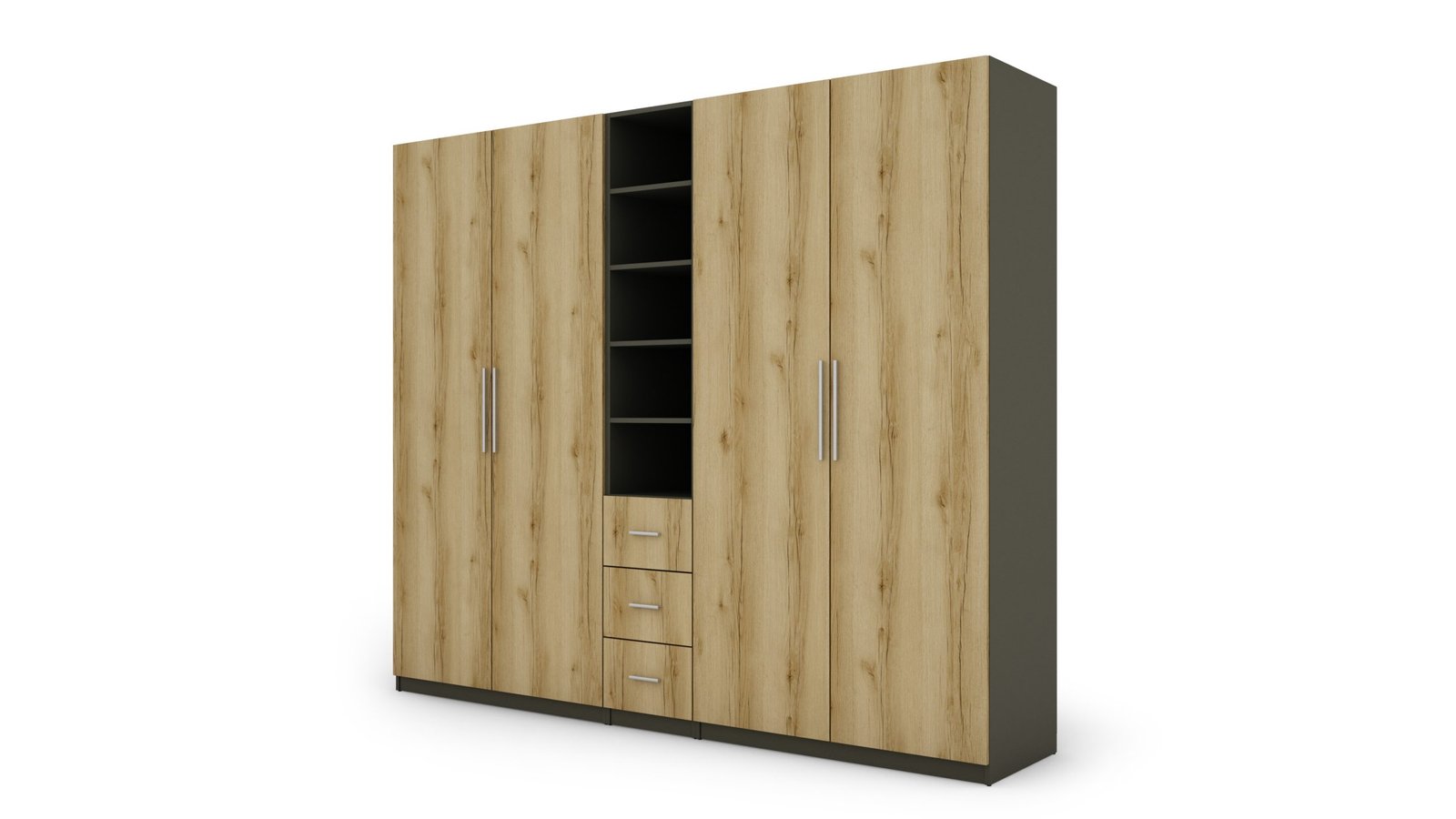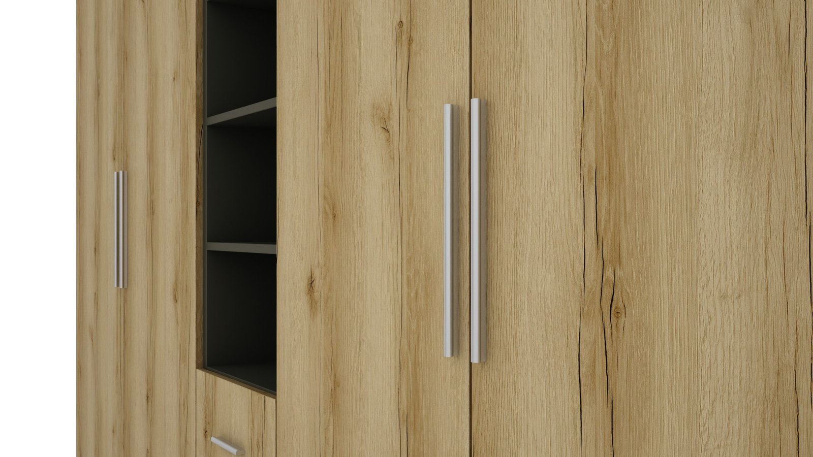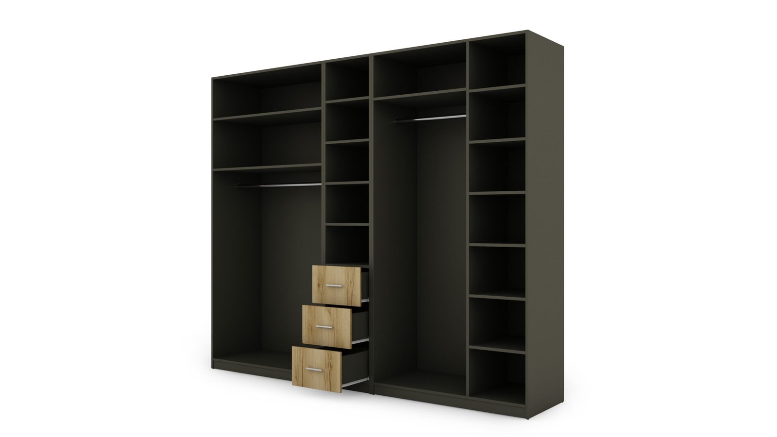 Strypas drabužių pakaboms. Nemažai lentynų. 3 išoriniai stalčiai. Spinta pagaminta iš aukščiausios kokybės 18 mm dvipusės laminuotos plokštės iš Pfleiderer. PVC apvadas. Galinės sienos pagamintos iš HDF plokštės, laminuotos iš vienos pusės panašios į baldo korpuso spalvos.