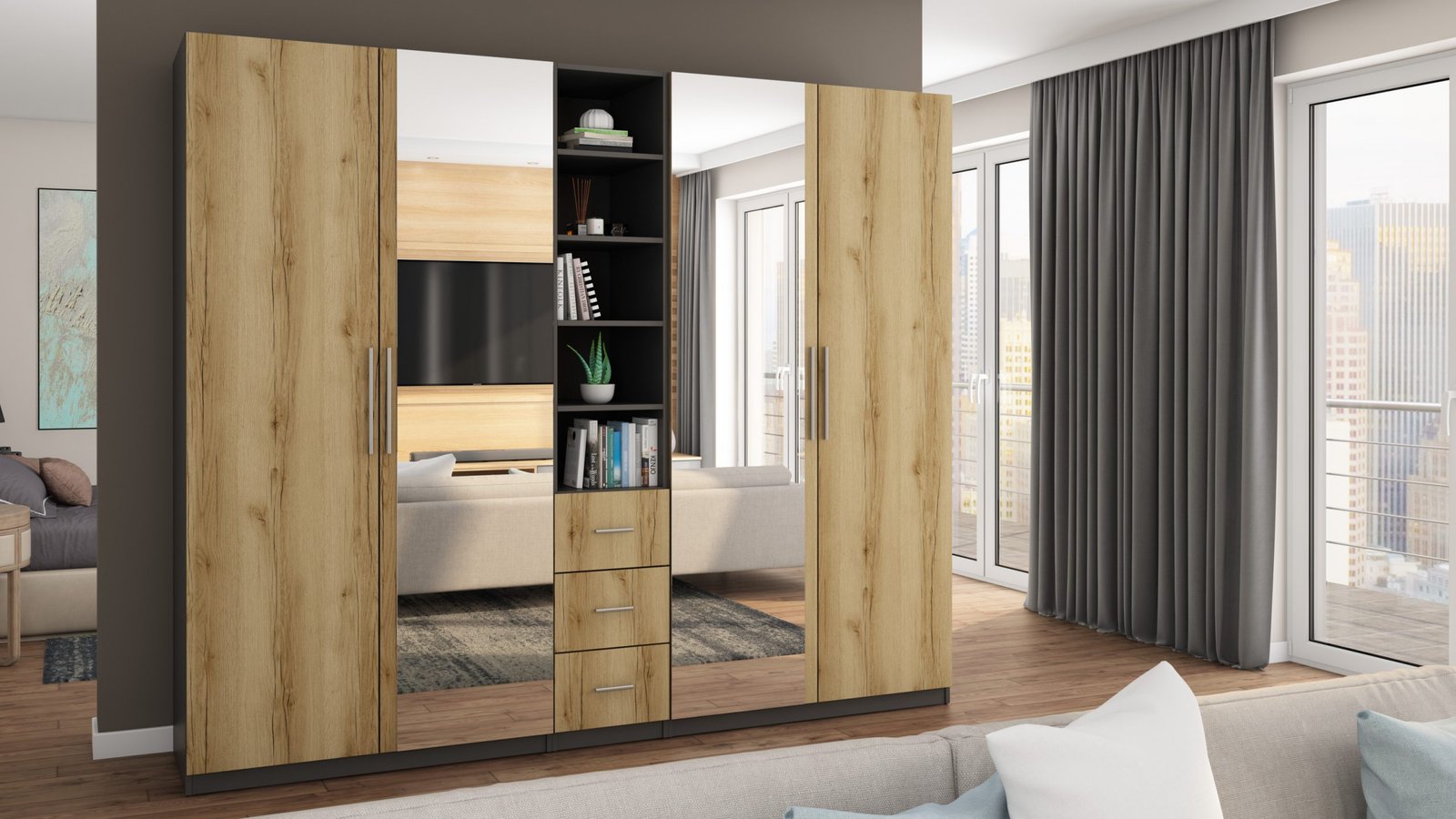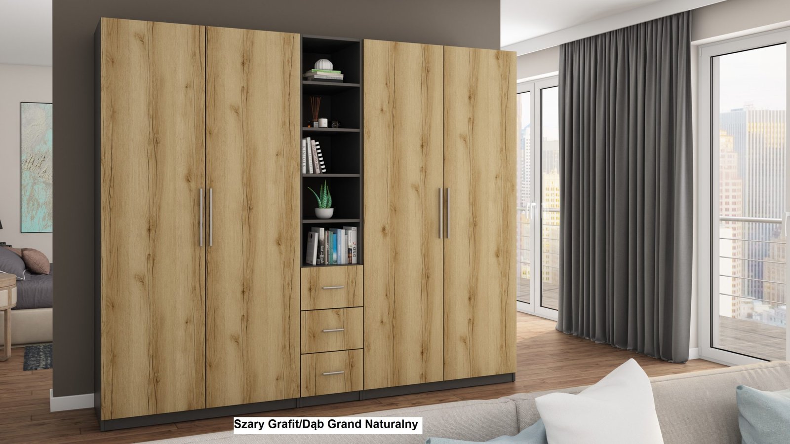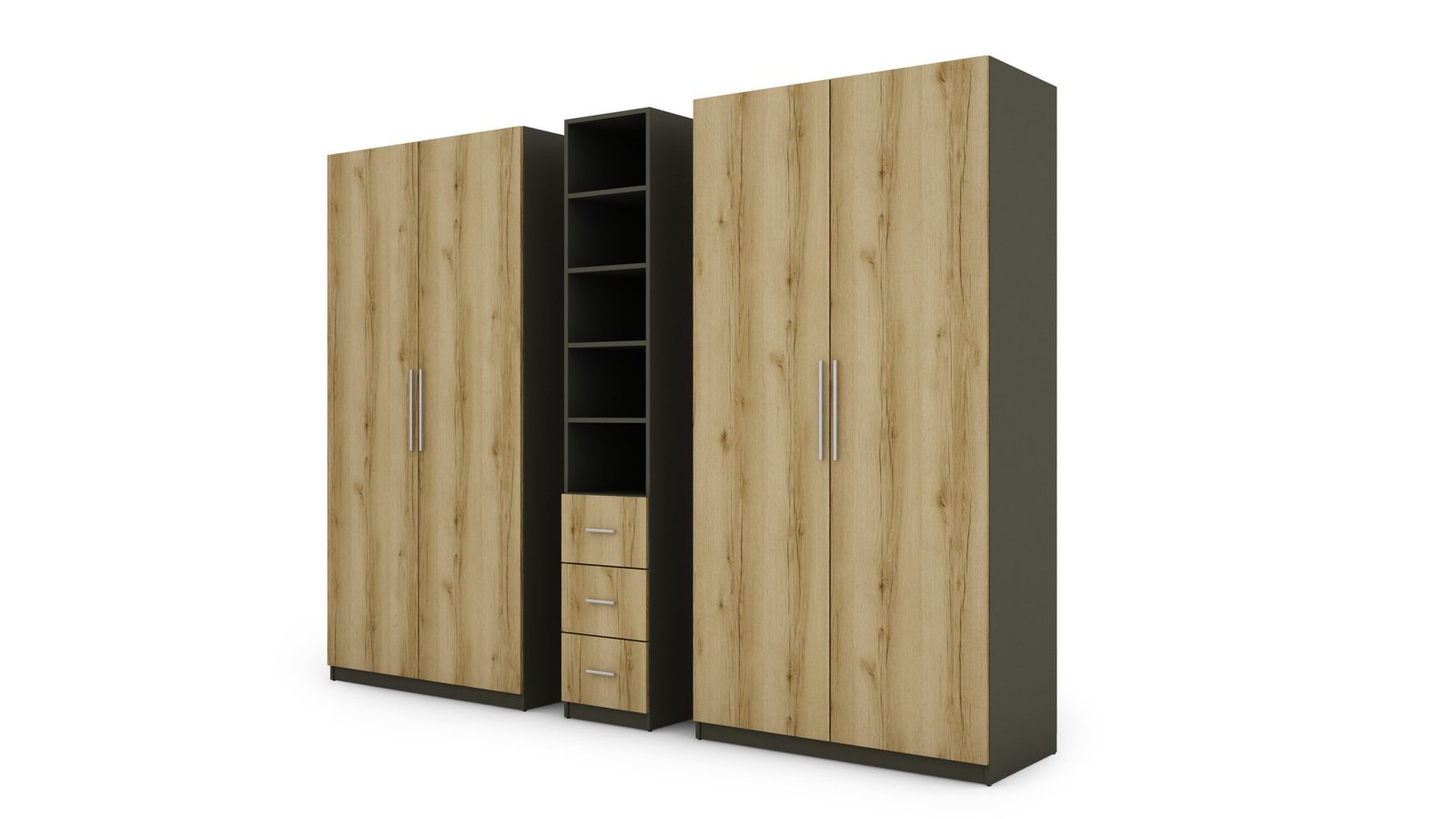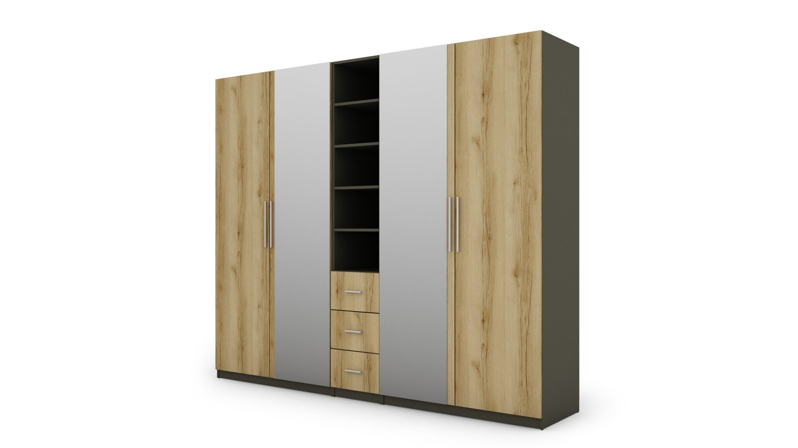 Strypas drabužių pakaboms. Nemažai lentynų. 3 išoriniai stalčiai. Spinta pagaminta iš aukščiausios kokybės 18 mm dvipusės laminuotos plokštės iš Pfleiderer. PVC apvadas. Galinės sienos pagamintos iš HDF plokštės, laminuotos iš vienos pusės panašios į baldo korpuso spalvos.