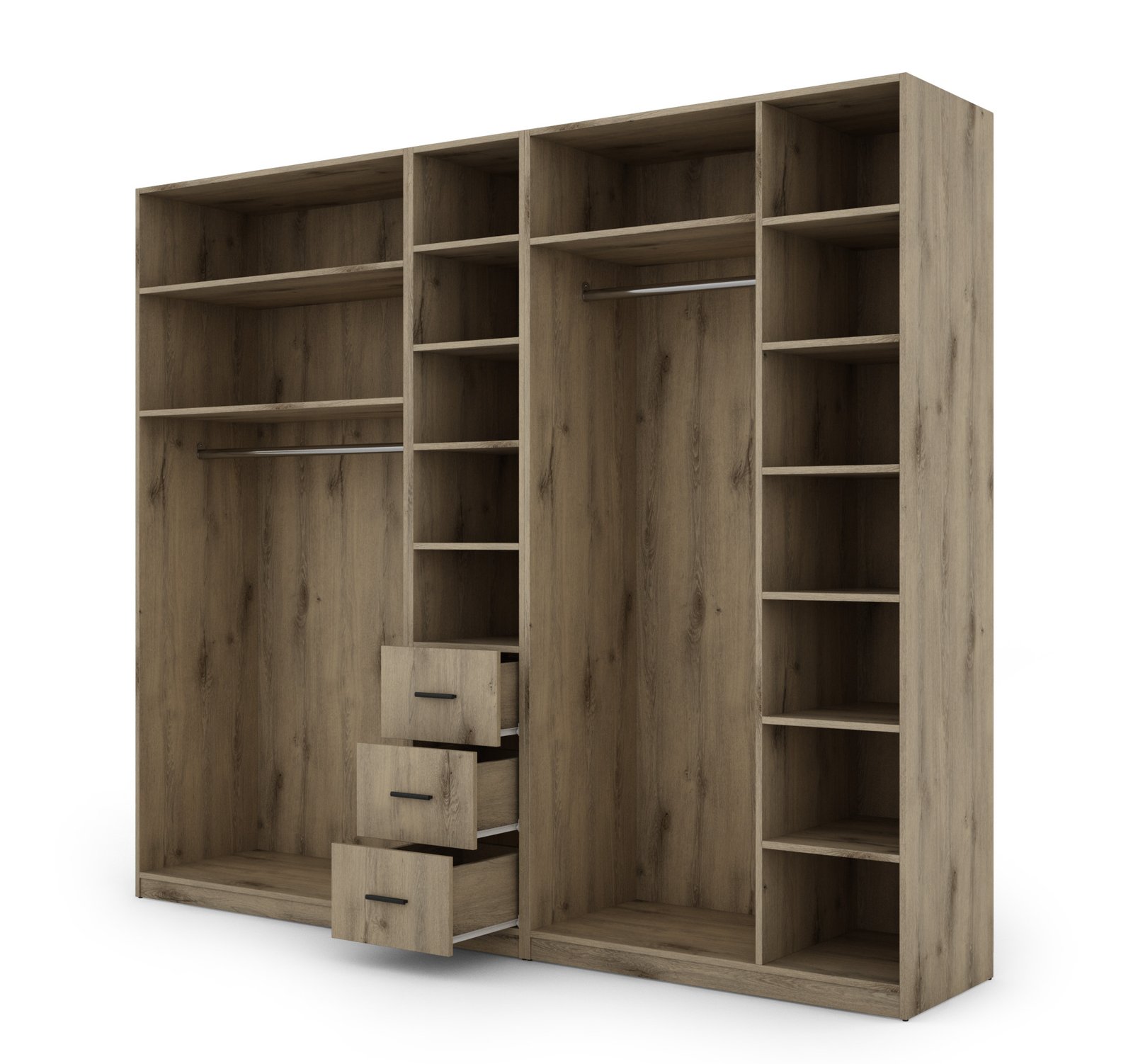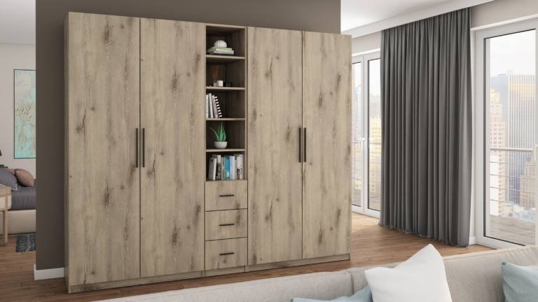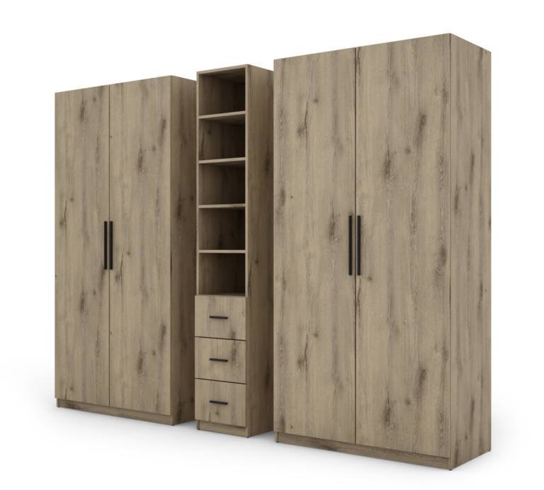 Strypas drabužių pakaboms. Nemažai lentynų. 3 išoriniai stalčiai. Spinta pagaminta iš aukščiausios kokybės 18 mm dvipusės laminuotos plokštės iš Pfleiderer. PVC apvadas. Galinės sienos pagamintos iš HDF plokštės, laminuotos iš vienos pusės panašios į baldo korpuso spalvos. Spintos spalva –Dąb Lumberjack Frost