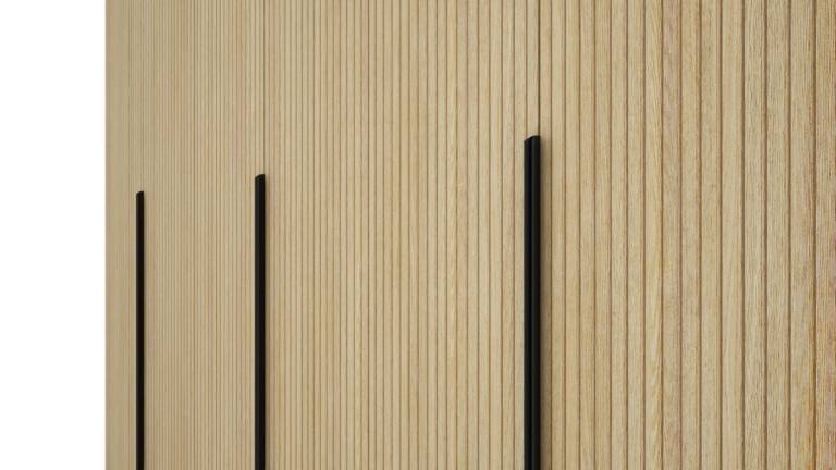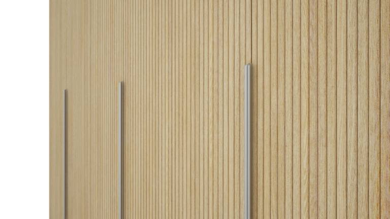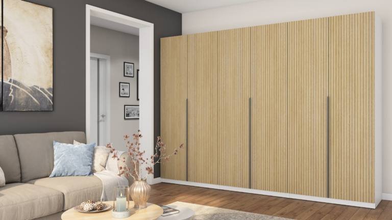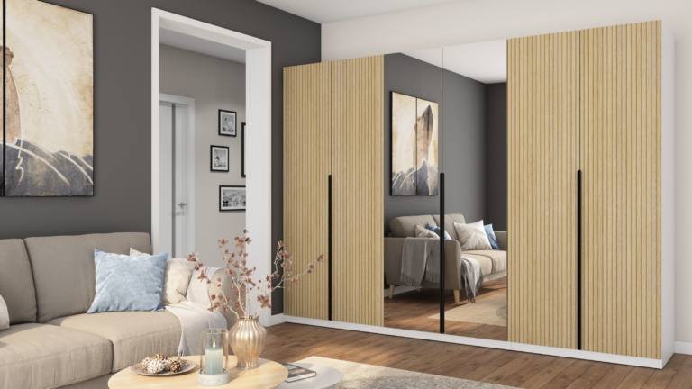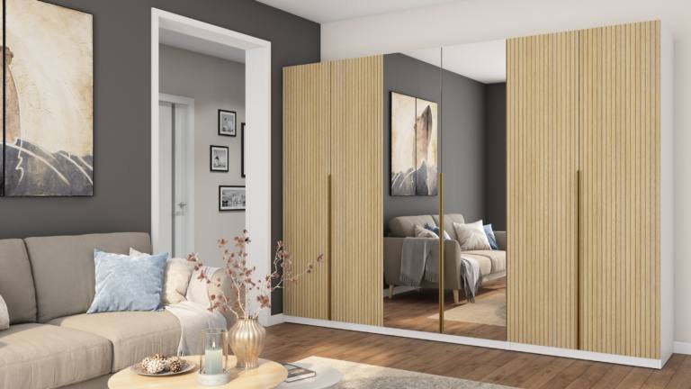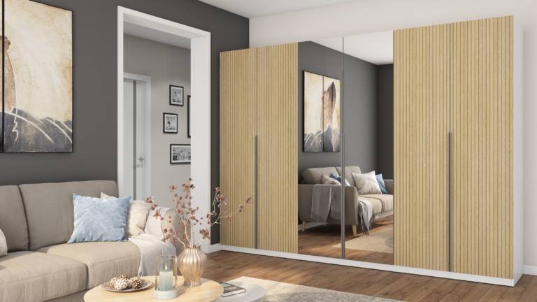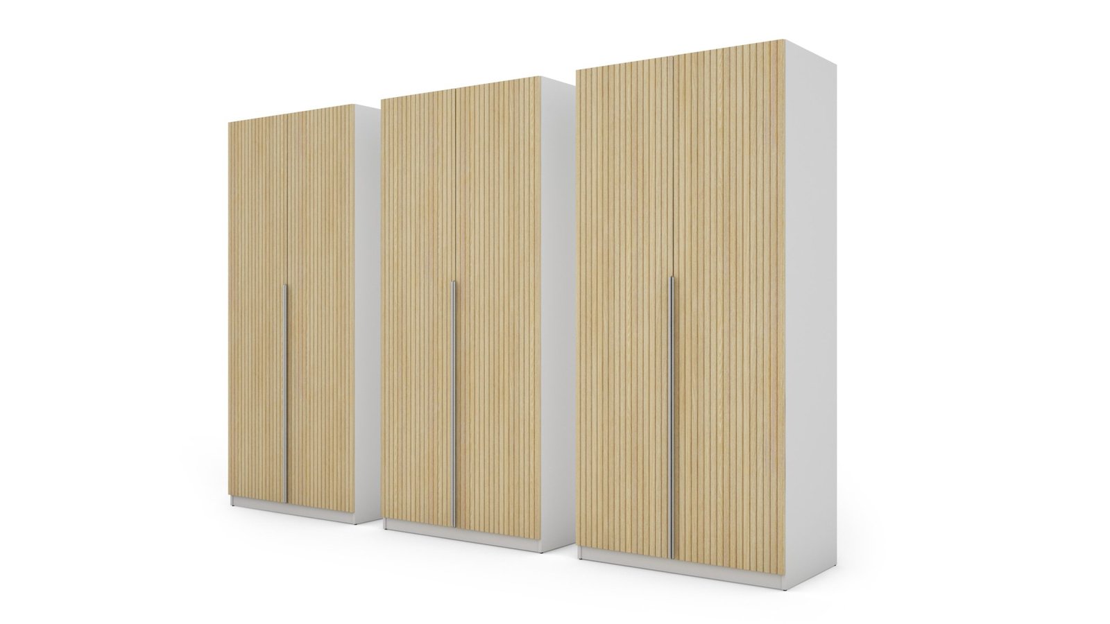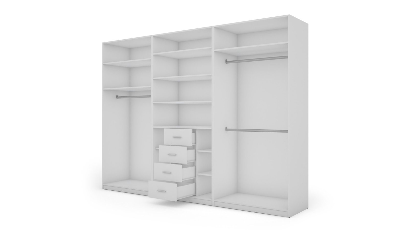 Strypai drabužių pakaboms. Nemažai lentynų. 4 vidiniai stalčiai. Spinta pagaminta iš aukščiausios kokybės 18 mm dvipusės laminuotos plokštės iš Pfleiderer. PVC apvadas. Galinės sienos pagamintos iš HDF plokštės, laminuotos iš vienos pusės panašios į baldo korpuso spalvos.Spintos spalva- Biel/Dąb Gaja Lamel