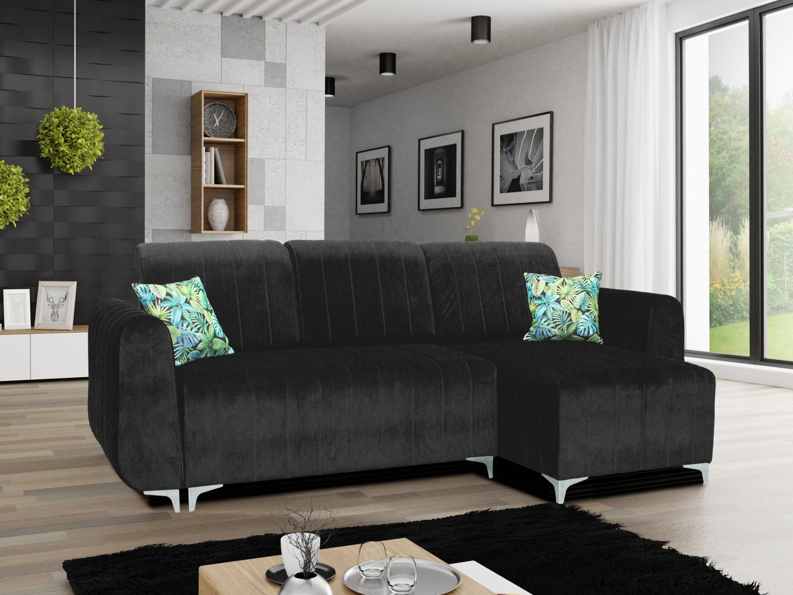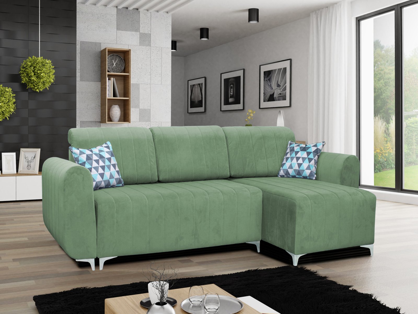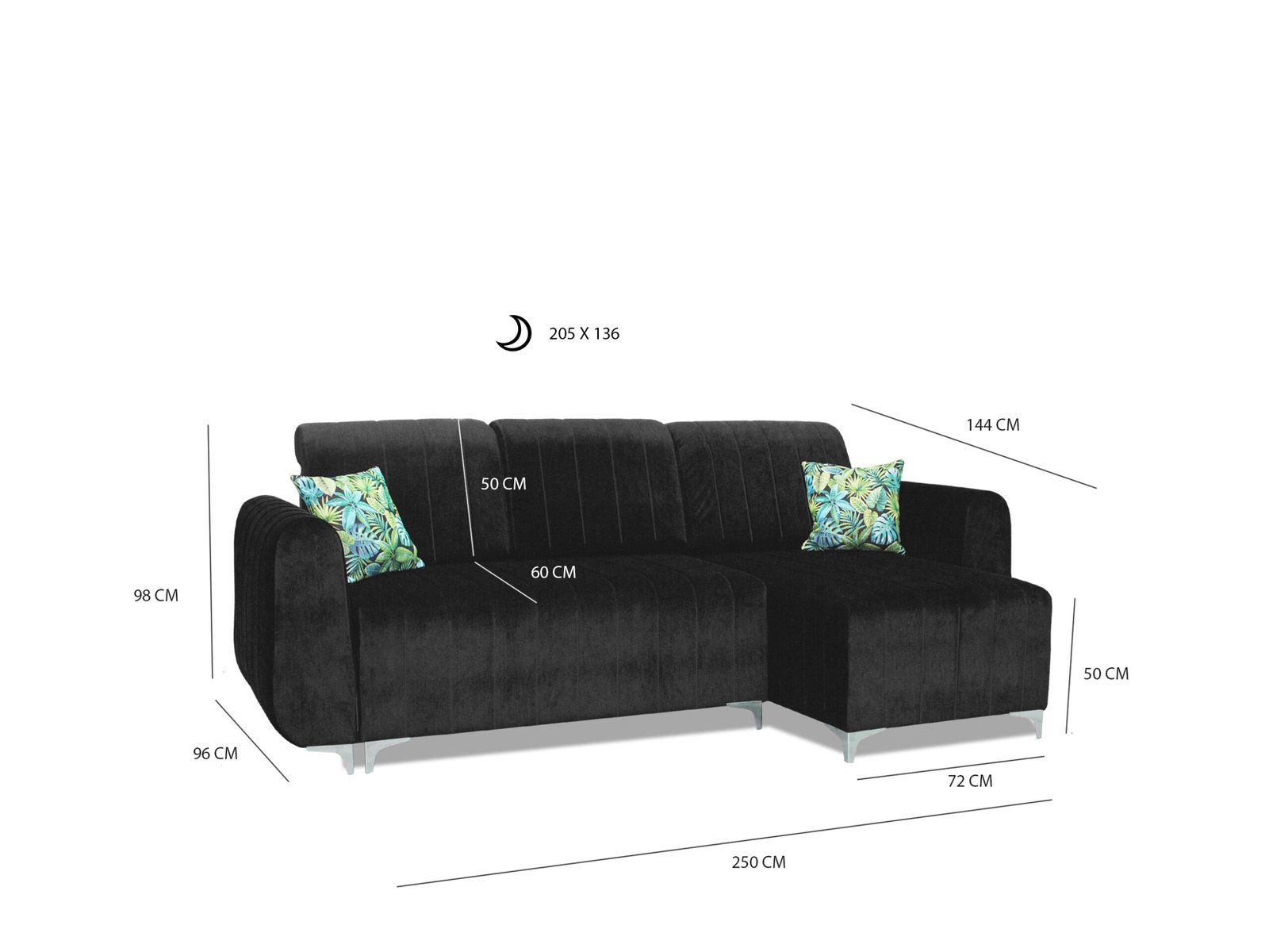Svetainės kampas yra 144 X 250 cm pločio, turi patalynės dėžę ir miegojimo 136X205 funkciją. Kampas turi dvigubas spyruokles, apačioje yra zigzag spyruoklės, viršutiniame sluoksnyje yra kūginės-gyvatėlės formos spyruoklės. Galite užsakyti kairės arba dešinės pusės kampą.