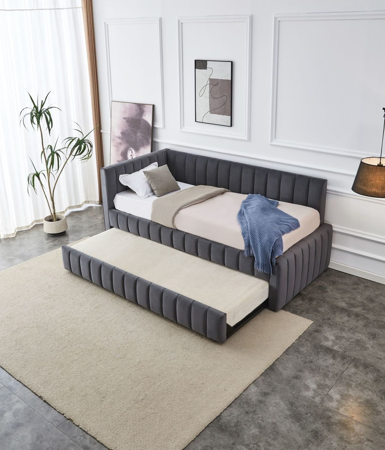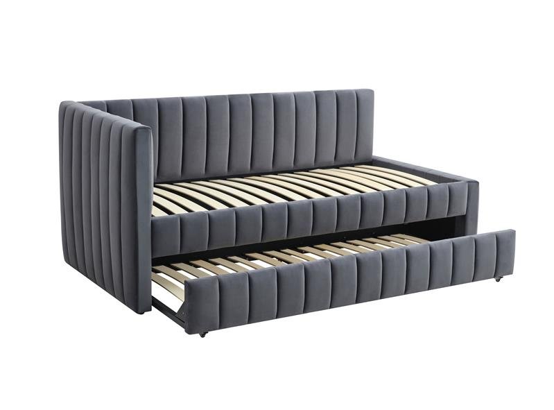 Lova su ištraukiamu apatiniu čiužiniu, dešininis/kairinis surinkimas, medžiaga: aksominis audinys – BLUVEL, spalva: pelenų pilka #14, * lovos kaina nurodyta  be čiužinio,.Galite pasirinkti kategorijoje čiužiniai. NEAPOL čiužinys – apatinei lovai (maksimalus apatinio čiužinio aukštis: 12 cm)putų čiužinys, matmenys: 200/90/12 cm, medžiaga: įdėklas – baltos putos T18, užvalkalas – poliesteris + medvilnė, spalva: mėlyna- kaina 80 eur