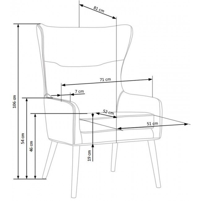 - Matmenys (plotis/gylis/aukštis/sėdimosios dalies aukštis): 71/81/106/46 cm
