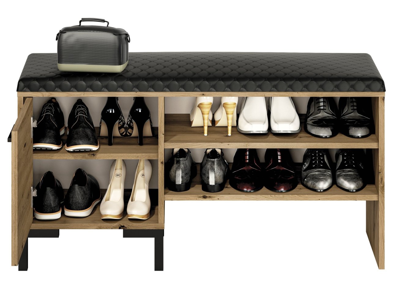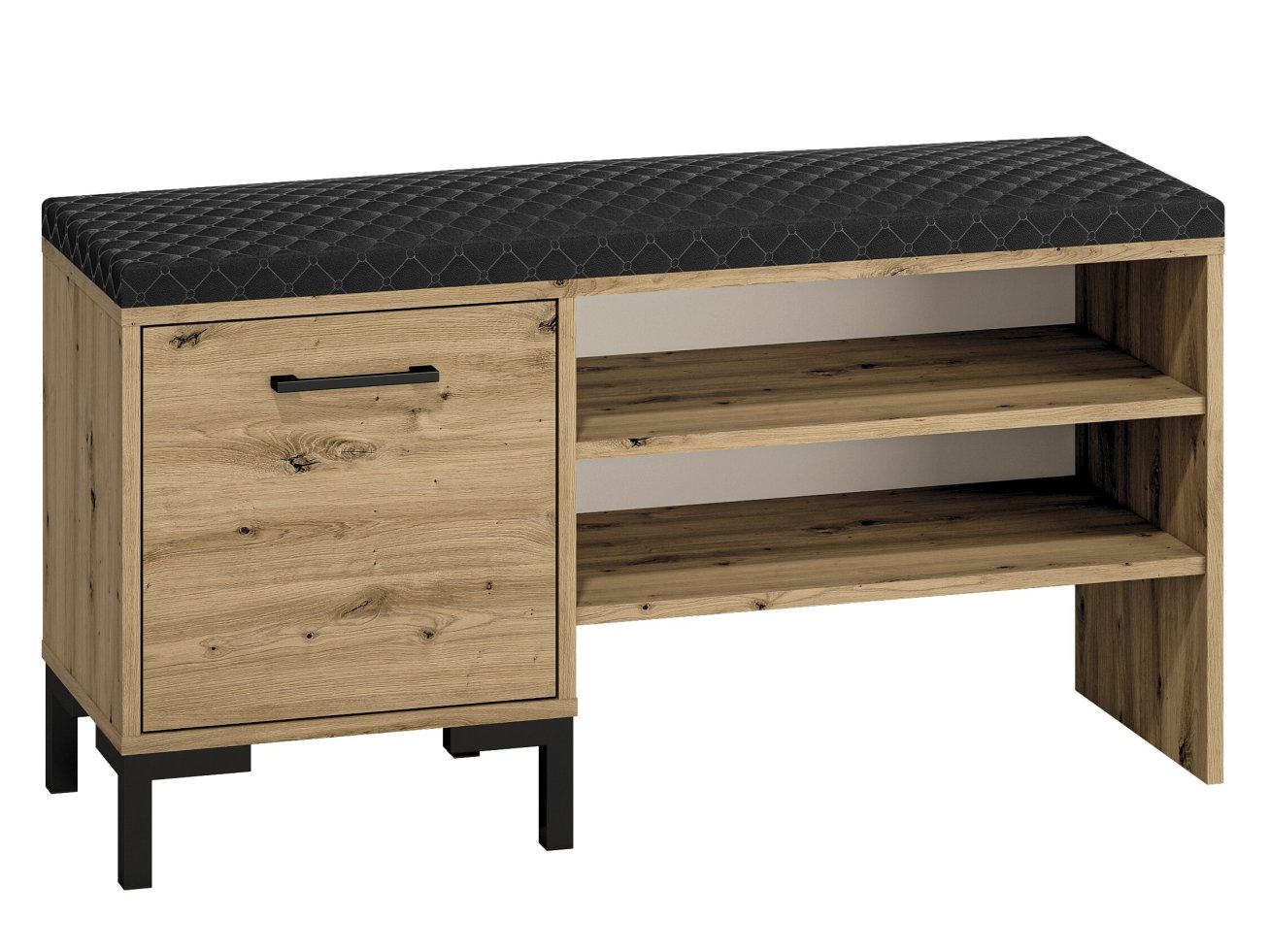- Ši batų spintelė yra puikus sprendimas, kad jūsų koridorius būtų tvarkingas. Daugybė lentynų sutalpins daugybę batų porų – šiuo sprendimu neabejotinai džiaugsis visa šeima. Be to, dėl aukštų spintelės kojų nebus jokių problemų išlaikyti spintelę švarią. Tai moderni ir elegantiška prieškambario spintelė ,spalva „Artisan Oak“ dekoras su juodomis rankenomis ir kojomis yra idealus sprendimas šiuolaikiškam interjerui. Gerai apgalvotas dizainas suteiks vietos susidėti batams.
