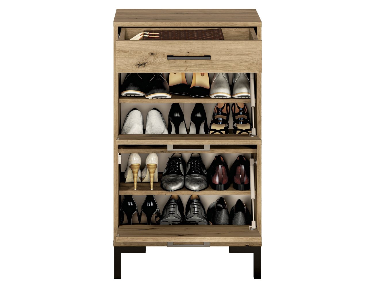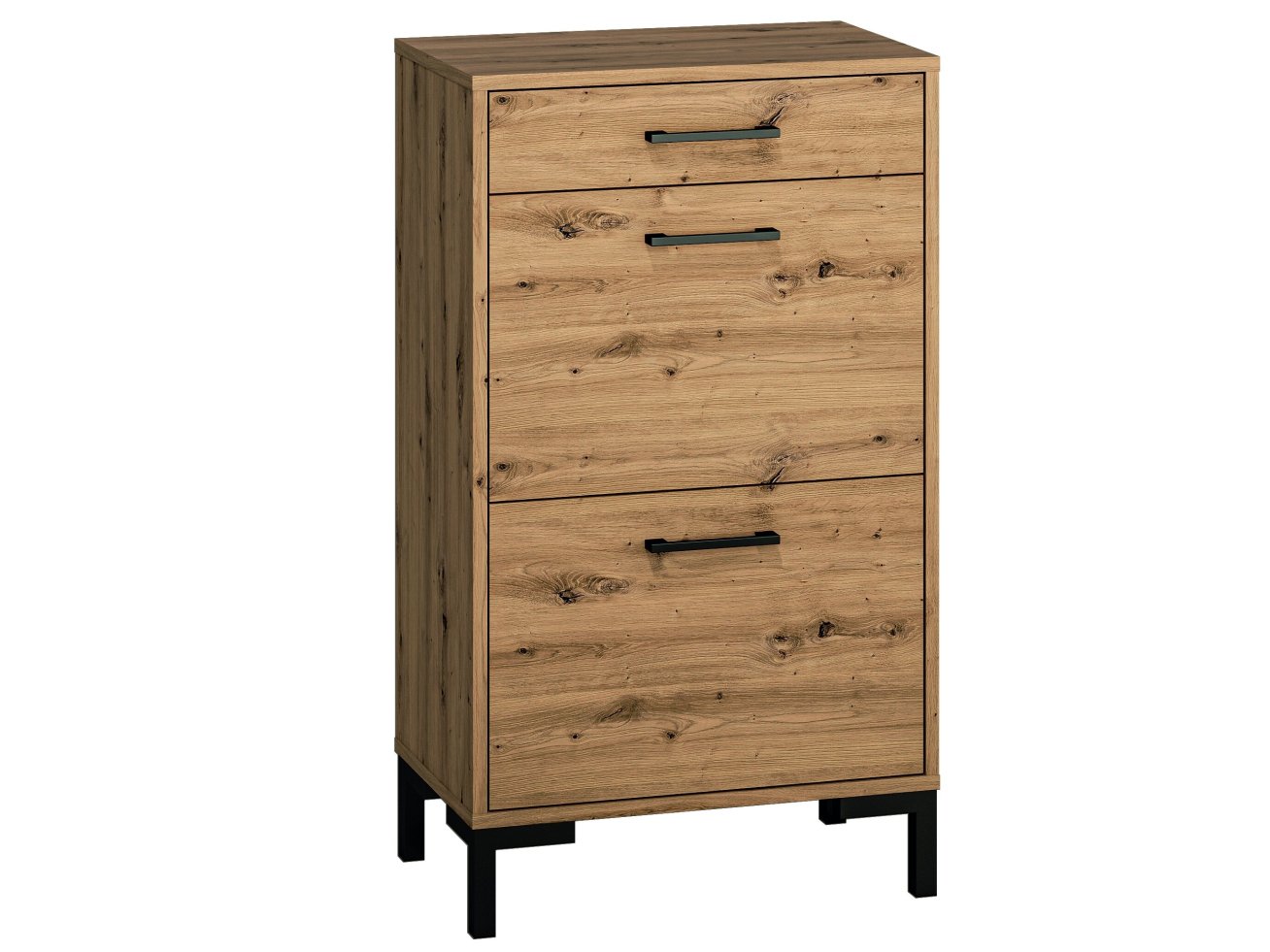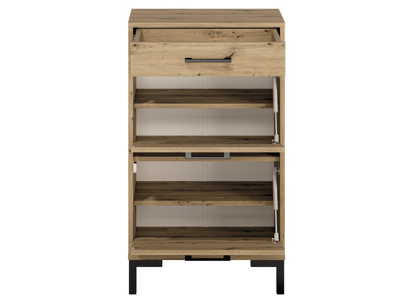 - Ši batų spintelė yra puikus sprendimas, kad jūsų koridorius būtų tvarkingas. Daugybė lentynų sutalpins daugybę batų porų – šiuo sprendimu neabejotinai džiaugsis visa šeima. Be to, dėl aukštų spintelės kojų nebus jokių problemų išlaikyti spintelę švarią. Tai moderni ir elegantiška prieškambario spintelė ,spalva „Artisan Oak“ dekoras su juodomis rankenomis ir kojomis yra idealus sprendimas šiuolaikiškam interjerui. Gerai apgalvotas kaladėlių dizainas suteiks vietos susidėti batams.