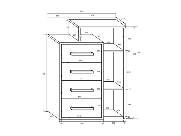 - Komoda (plotis/aukštis/gylis): 64 cm / 86 cm / 41 cm