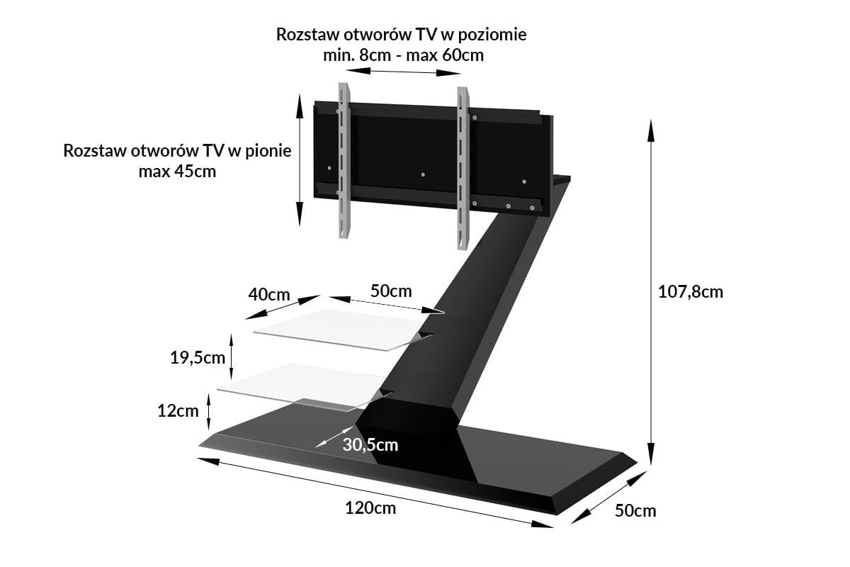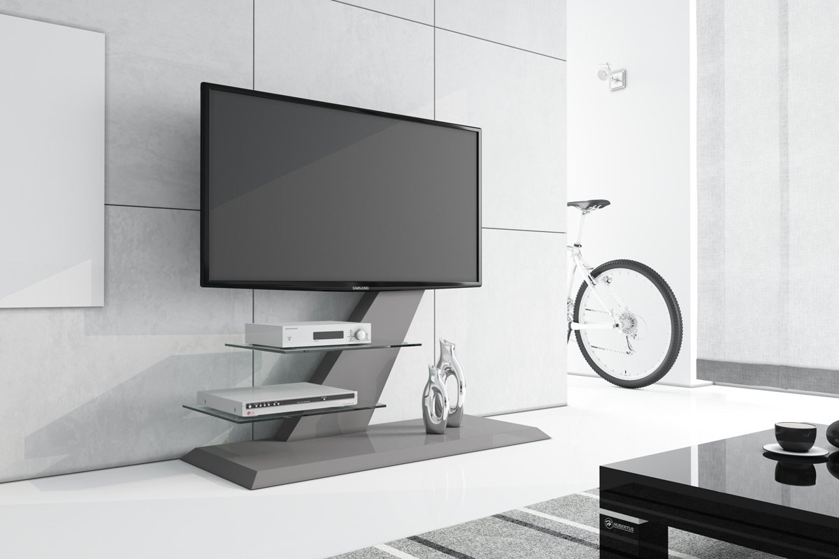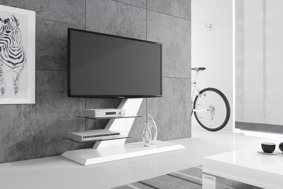 Televizoriaus stalas – futuristinio dizaino modelis, ant kurio galima pakabinti iki 55 colių LCD, LED ar plazminį ekraną. Pasvirusios prizmės formos stulpelis suteikia unikalų charakterį,