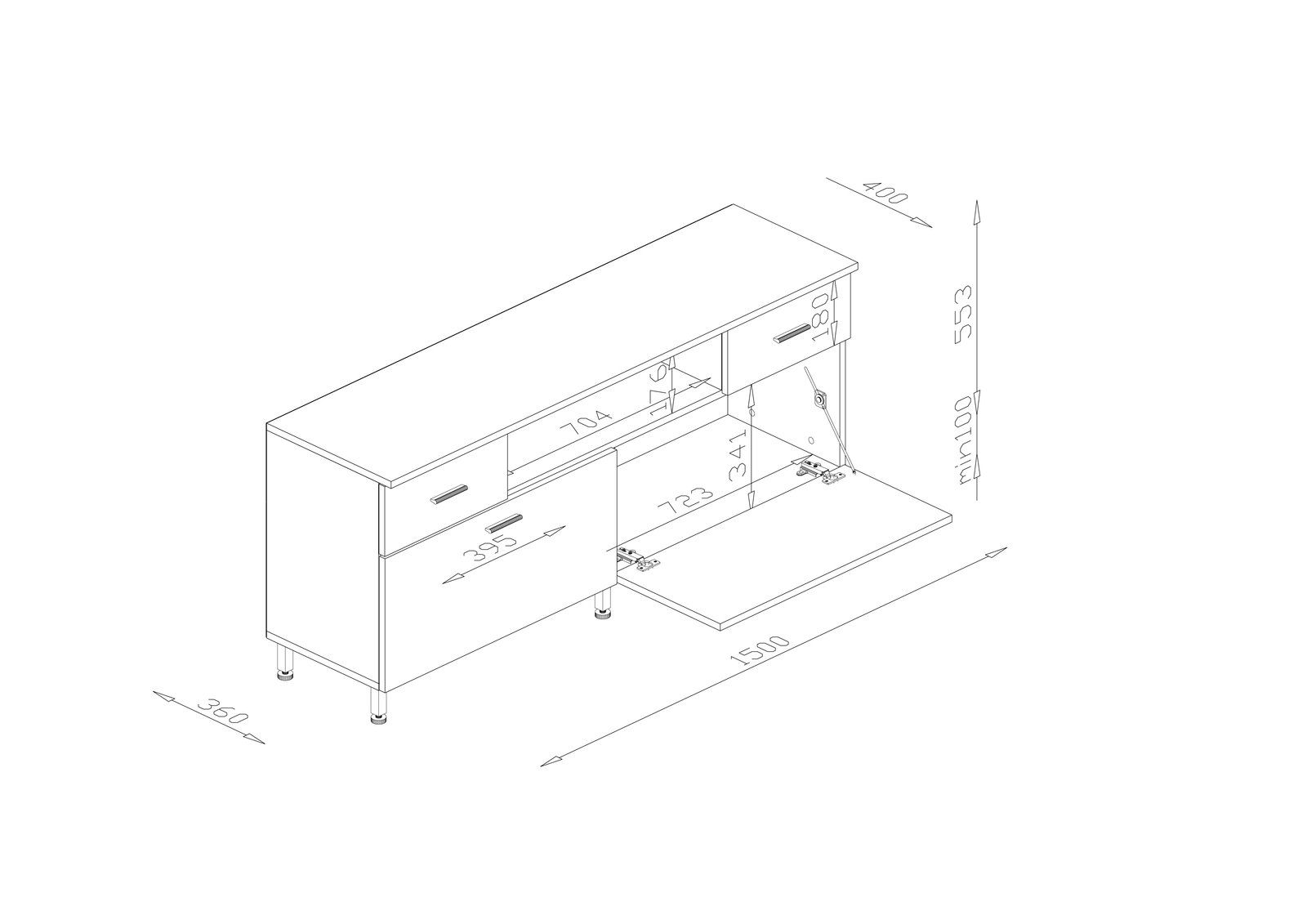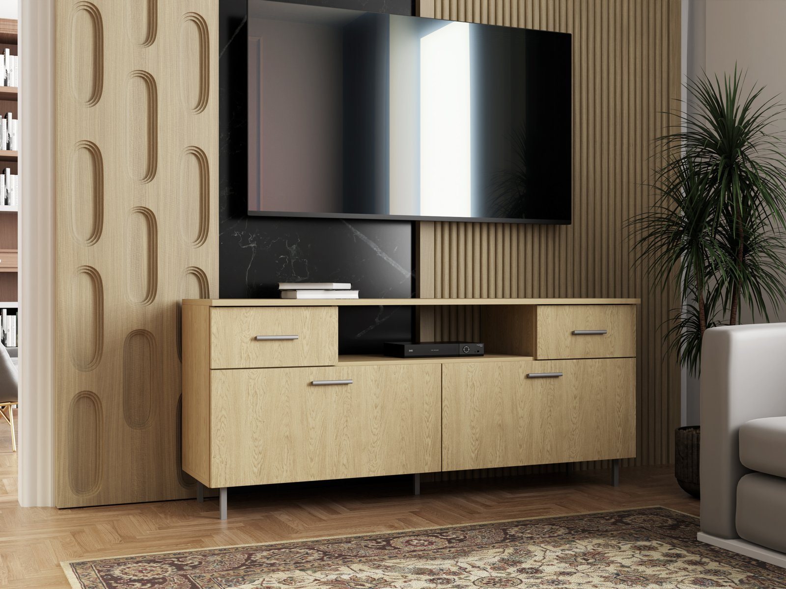 Šis 150 cm pločio televizoriaus staliukas – puikus pasirinkimas ieškantiems funkcionalaus ir estetiškai patrauklaus baldo mažesnėms erdvėms. Dėl kompaktiško dizaino jis puikiai tinka miegamiesiems, svetainėms, vaikų kambariams ar svečių kambariams. Nepaisant mažo dydžio, jis siūlo stebėtinai daug vietos daiktams susidėti ir atrodo puikiai. Tvirta konstrukcija ir gerai apgalvotas išdėstymas šį staliuką paverčia ne tik televizoriaus staliuku, bet ir puikiu būdu sutvarkyti smulkius kasdienius daiktus. Jis puikiai tinka apatiniams drabužiams, aksesuarams, žaislams ar elektronikai laikyti. Ant viršaus galima laikyti nuotraukas, augalus, dekoracijas ar kitus daiktus, kurie suteikia kambariui asmeniškumo. Staliukas tiekiamas tik kaip laisvai pastatomas įrenginys. Tvirtos kojelės užtikrina saugų ir patogų kasdienį naudojimą. Jį galite lengvai pastatyti net ir ankštose erdvėse, taip sukurdami papildomos vietos daiktams susidėti neprarandant stiliaus. Staliukas pagamintas iš aukštos kokybės medžiagų, užtikrinančių jo patvarumą ir atsparumą kasdieniam naudojimui. Pagamintas Lenkijoje, kruopščiai atkreipiant dėmesį į detales, jis derina modernų dizainą su vietinės meistriškumo tvirtumu. Baldai pagaminti iš aukščiausios kokybės, 18 mm storio dvipusės laminuotos „Woodeco“ (anksčiau „Pfleiderer“) plokštės. Visi elementai yra klijuoti itin patvariais 0,8 mm PVC apvadais, kad būtų atsparūs drėgmei ir nedideliems smūgiams. Galinės plokštės pagamintos iš 3 mm storio vienpusės laminuotos HDF plokštės (atitinkančios baldo korpuso spalvą).Svarbi informacija: Komplekte yra visas priedų rinkinys su aiškiomis surinkimo instrukcijomis. Baldai parduodami supakuoti. Papildomai galima užsisakyti: Pilno ištraukimo stalčiai su savaiminio užsidarymo mechanizmais ir švelniai užsidarančiais durelių vyriais!