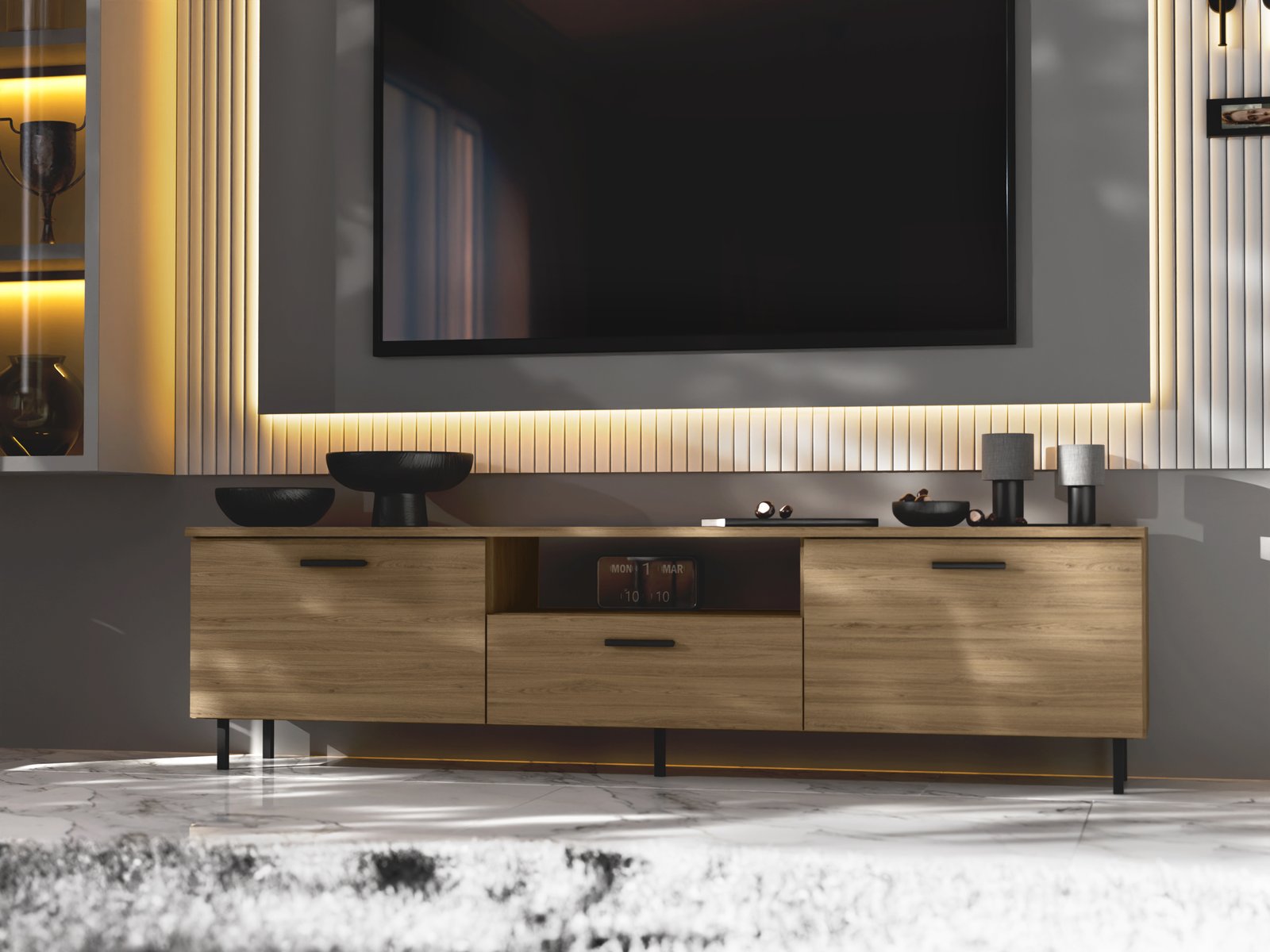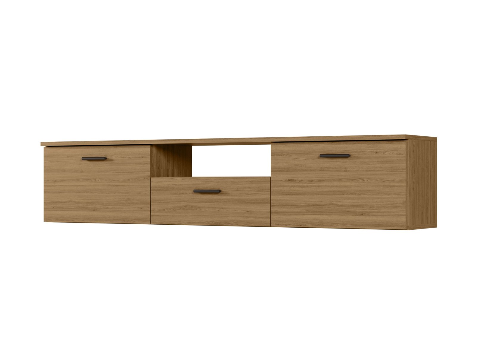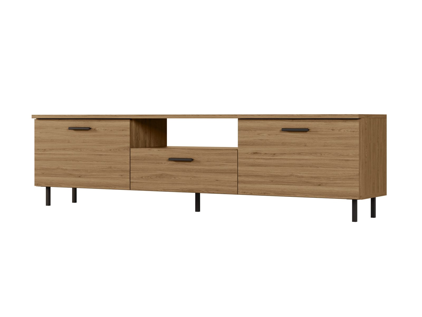 Šis 180 cm ilgio televizoriaus staliukas – puikus pasirinkimas tiems, kurie vertina modernų dizainą ir apgalvotą funkcionalumą. Šis elegantiškas baldas sukurtas svetainėms, kuriose pramogų zona turi atrodyti vientisai, estetiškai patraukliai ir tvarkingai. Jis puikiai tinka kaip televizoriaus staliukas, tačiau jo paskirtis gerokai viršija pagrindinę jo funkciją.Dėl gerai apgalvoto dizaino staliukas siūlo daug vietos daiktams susidėti. Viduje galite lengvai susitvarkyti savo televizoriaus įrangą, konsoles, diskus, laidus ir kitus priedus, kuriuos pravartu turėti po ranka, bet nebūtinai gerai matomoje vietoje. Erdviame viduje taip pat telpa smulkūs kasdieniai daiktai, tekstilė, dokumentai ir net elegantiški stalo įrankiai.spintelę galima pastatyti ant pridedamų kojelių arba pakabinti ant sienos. Baldai pagaminti iš aukščiausios kokybės, 18 mm storio dvipusės laminuotos „Woodeco“ (anksčiau „Pfleiderer“) plokštės. Visi elementai yra klijuoti itin patvariais 0,8 mm PVC apvadais, kad būtų atsparūs drėgmei ir nedideliems smūgiams. Galinės plokštės pagamintos iš 3 mm storio vienpusės laminuotos HDF plokštės (atitinkančios baldo korpuso spalvą).Svarbi informacija: Komplekte yra visas priedų rinkinys su aiškiomis surinkimo instrukcijomis. Baldai parduodami supakuoti. Spalva: dab carpenter