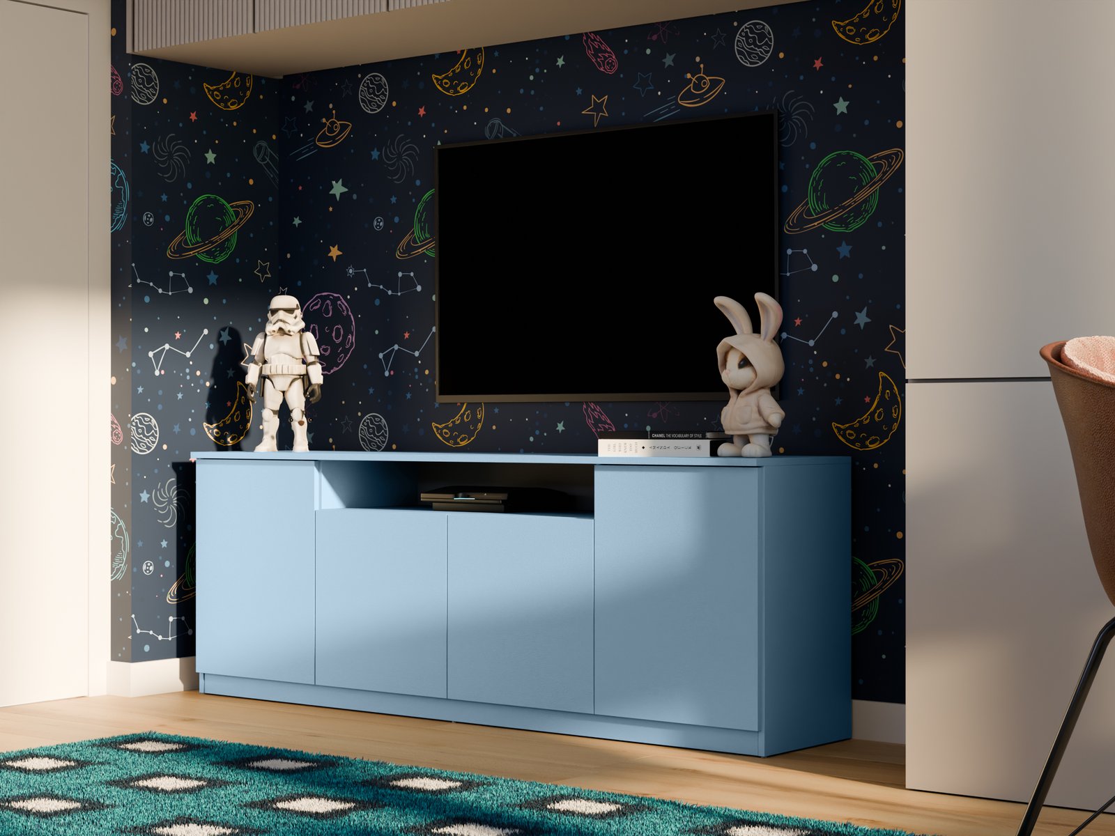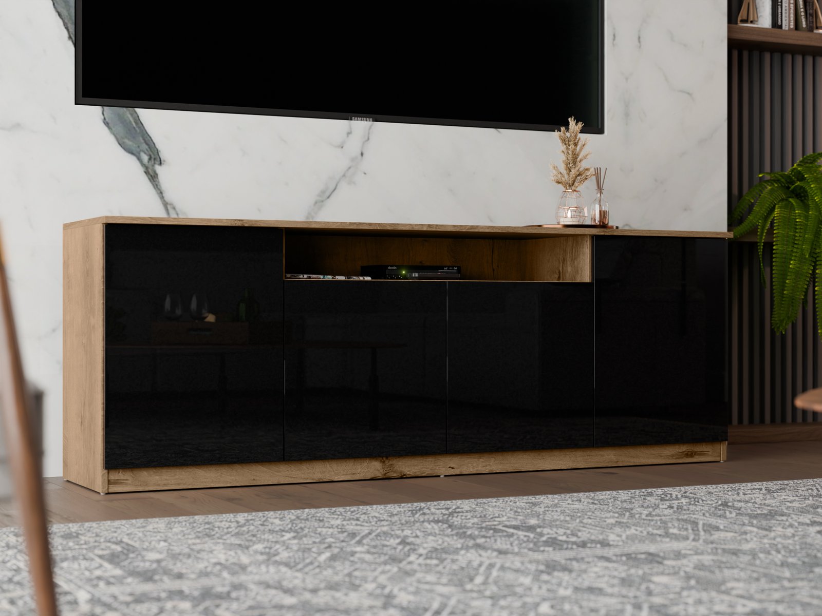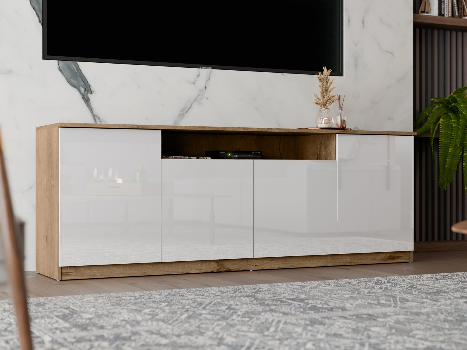 Šis 200 cm pločio RTV yra modernus baldas, puikiai derinantis minimalistinį dizainą su kasdieniu funkcionalumu. Dėl gerai apgalvoto dizaino ji puikiai tinka įvairioms gyvenamosioms erdvėms. Tai gali būti praktiškas miegamojo, elegantiškos svetainės, modernaus jaunimo kambario ar net biuro papildymas. Nepriklausomai nuo jos paskirties, ji suteikia interjerui tvarkos, lengvumo ir šiuolaikiškumo. TIP ON sistema leidžia atidaryti spinteles ir stalčius be rankenėlių. Tiesiog švelniai paspauskite priekinę dalį, kad patektumėte į vidų. Šis sprendimas yra ne tik patogus, bet ir labai estetiškas. Tai suteikia baldui švarią, darnią išvaizdą, be matomų rankenėlių ar išsikišusių elementų. RTV fasadai yra trijų apdailos variantų. Galite rinktis iš ryškaus blizgaus, elegantiško matinio arba nesenstančio, lygaus paviršiaus. Be to, siūlome galimybę užsisakyti bet kokios spalvos. Tiek fasadai, tiek korpusas gali būti derinami prie jūsų interjero spalvos, todėl galite sukurti baldą, kuris puikiai papildys jūsų dekorą. Tai puikus sprendimas, jei vertinate individualų stilių ir harmoniją savo interjere. RTV vidus yra labai erdvus. Joje tilps viskas, ko reikia, kad būtų po ranka, bet nepastebimai. Platus stalviršis puikiai tinka dekoratyviniams daiktams eksponuoti. Galite laikyti kelionių suvenyrus, nuotraukų rėmelius, mėgstamas knygas, vazoninius augalus ar lempą, kad erdvė būtų šilčiau. Baldai pagaminti iš aukščiausios kokybės, 18 mm storio, dvipusės laminuotos plokštės iš „Woodeco“ (anksčiau „Pfleiderer“). Visi elementai suklijuoti itin patvariu 0,8 mm storio PVC kraštu, kad būtų atsparūs drėgmei ir nedideliems smūgiams. Galinės sienelės pagamintos iš 3 mm storio, vienpusės laminuotos HDF plokštės (atitinkančios baldo korpuso spalvą). Svarbi informacija: Komplekte yra visas priedų rinkinys su aiškiomis surinkimo instrukcijomis. Baldai parduodami supakuoti. Papildomai: Pilno ištraukimo stalčiai su savaiminio užsidarymo funkcija ir švelniai užsidarančiomis durelių vyriais! PIRMOS nuotraukos spalva:rožinė, dąb lefkas -juoda , balta, šv. mėlyna,dąb lefkas / balta blizgi