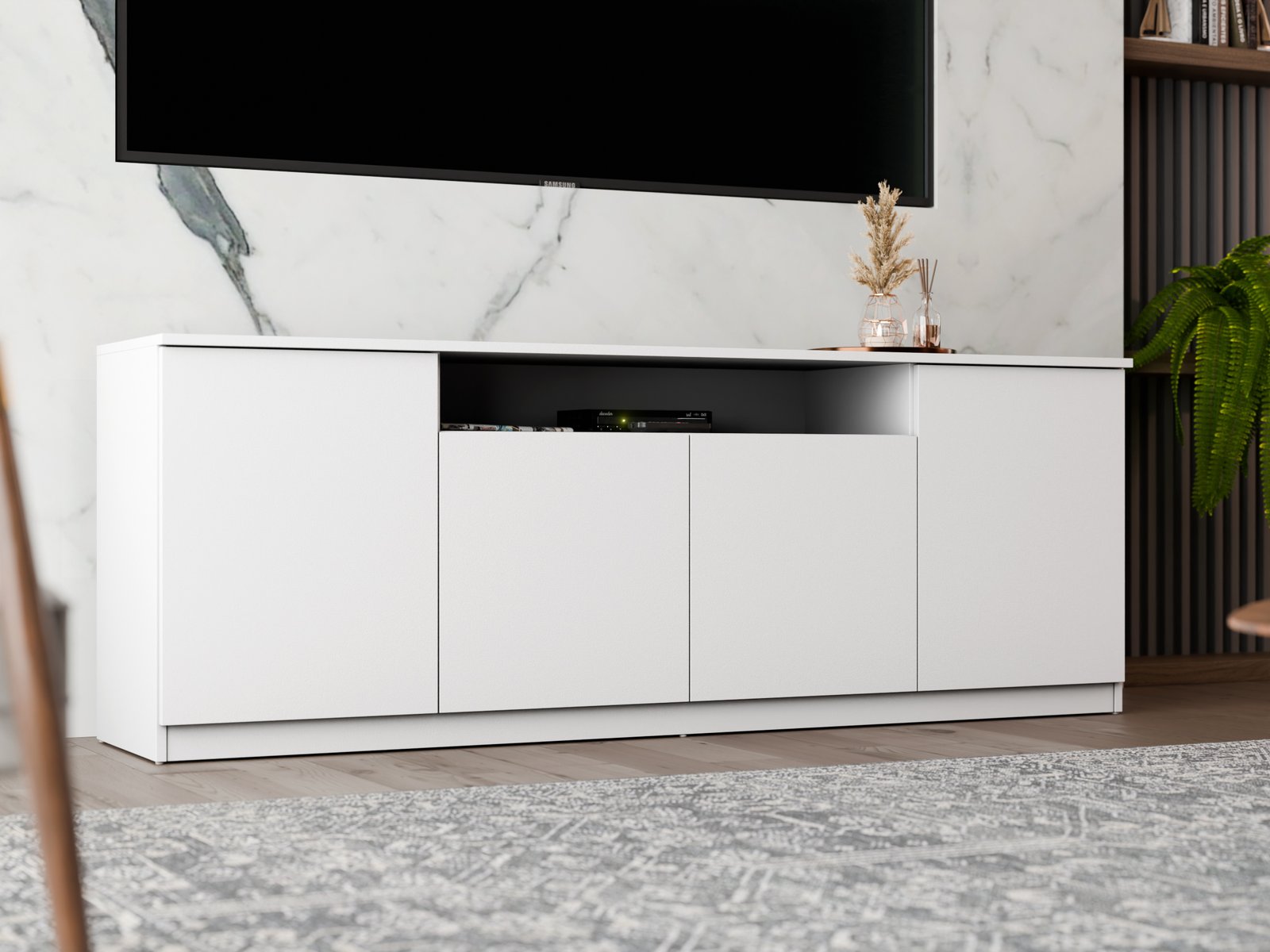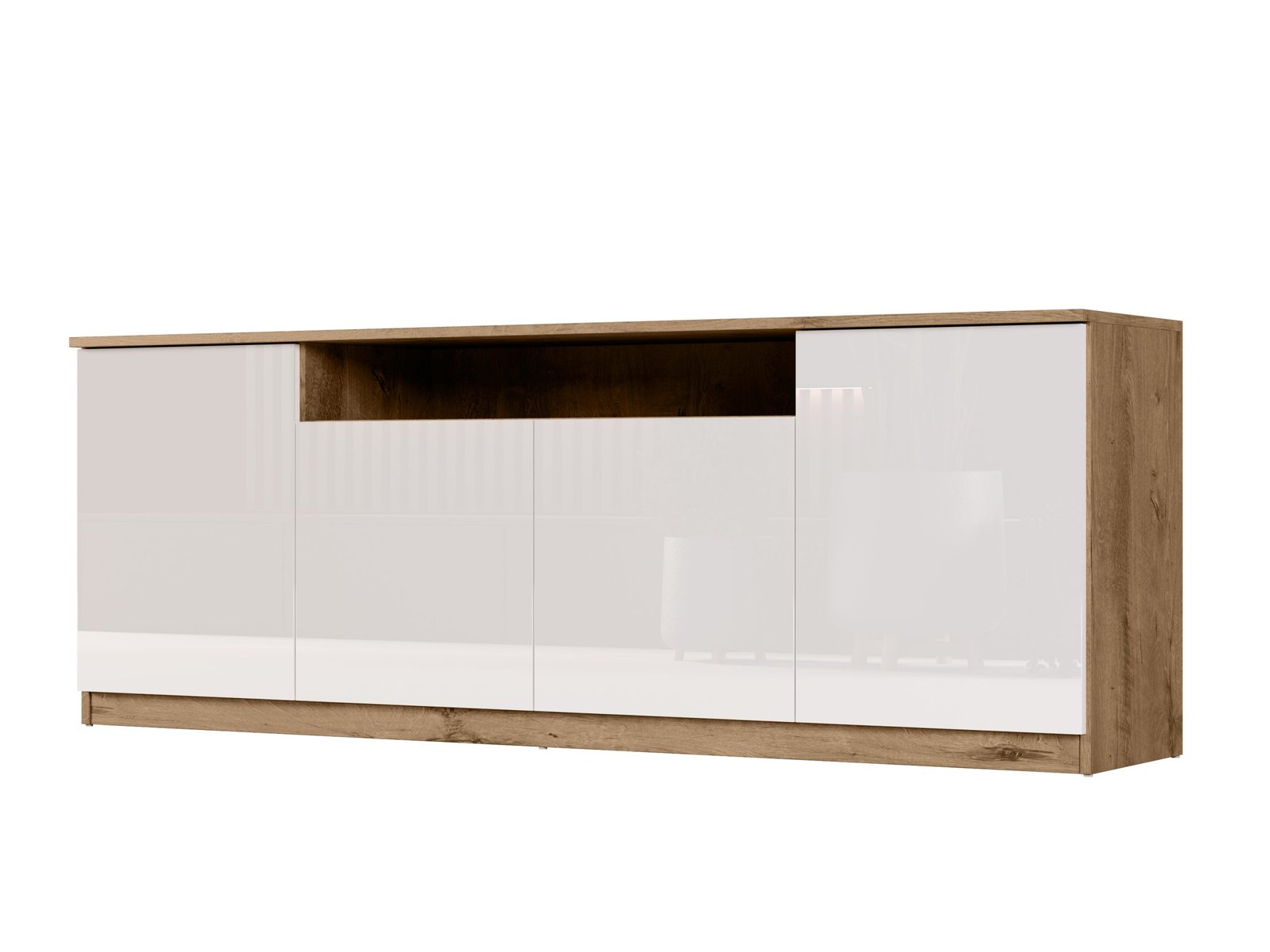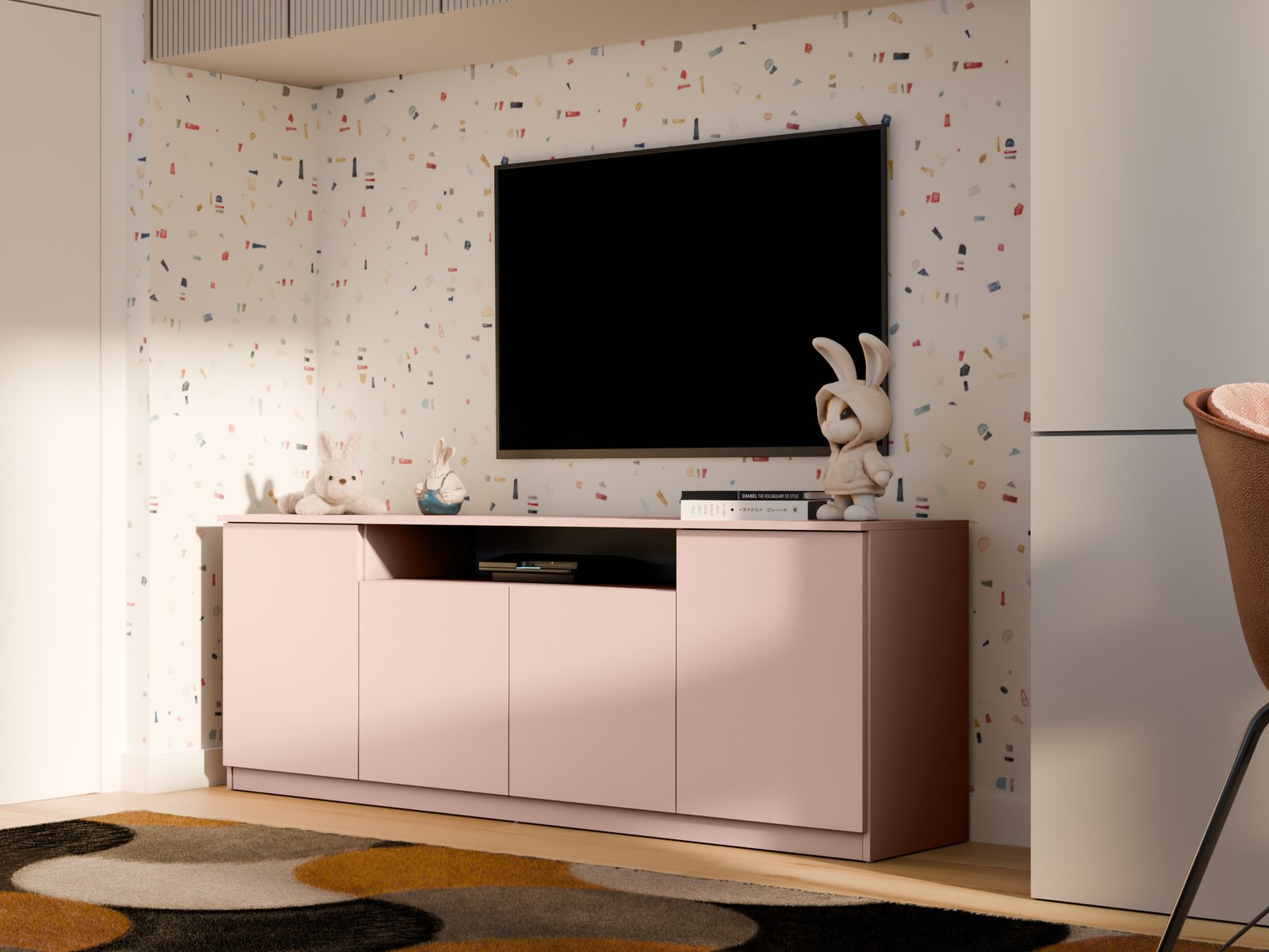 Šis 200 cm pločio RTV yra modernus baldas, puikiai derinantis minimalistinį dizainą su kasdieniu funkcionalumu. Dėl gerai apgalvoto dizaino ji puikiai tinka įvairioms gyvenamosioms erdvėms. Tai gali būti praktiškas miegamojo, elegantiškos svetainės, modernaus jaunimo kambario ar net biuro papildymas. Nepriklausomai nuo jos paskirties, ji suteikia interjerui tvarkos, lengvumo ir šiuolaikiškumo. TIP ON sistema leidžia atidaryti spinteles ir stalčius be rankenėlių. Tiesiog švelniai paspauskite priekinę dalį, kad patektumėte į vidų. Šis sprendimas yra ne tik patogus, bet ir labai estetiškas. Tai suteikia baldui švarią, darnią išvaizdą, be matomų rankenėlių ar išsikišusių elementų. RTV fasadai yra trijų apdailos variantų. Galite rinktis iš ryškaus blizgaus, elegantiško matinio arba nesenstančio, lygaus paviršiaus. Be to, siūlome galimybę užsisakyti bet kokios spalvos. Tiek fasadai, tiek korpusas gali būti derinami prie jūsų interjero spalvos, todėl galite sukurti baldą, kuris puikiai papildys jūsų dekorą. Tai puikus sprendimas, jei vertinate individualų stilių ir harmoniją savo interjere. RTV vidus yra labai erdvus. Joje tilps viskas, ko reikia, kad būtų po ranka, bet nepastebimai. Platus stalviršis puikiai tinka dekoratyviniams daiktams eksponuoti. Galite laikyti kelionių suvenyrus, nuotraukų rėmelius, mėgstamas knygas, vazoninius augalus ar lempą, kad erdvė būtų šilčiau. Baldai pagaminti iš aukščiausios kokybės, 18 mm storio, dvipusės laminuotos plokštės iš „Woodeco“ (anksčiau „Pfleiderer“). Visi elementai suklijuoti itin patvariu 0,8 mm storio PVC kraštu, kad būtų atsparūs drėgmei ir nedideliems smūgiams. Galinės sienelės pagamintos iš 3 mm storio, vienpusės laminuotos HDF plokštės (atitinkančios baldo korpuso spalvą). Svarbi informacija: Komplekte yra visas priedų rinkinys su aiškiomis surinkimo instrukcijomis. Baldai parduodami supakuoti. Papildomai: Pilno ištraukimo stalčiai su savaiminio užsidarymo funkcija ir švelniai užsidarančiomis durelių vyriais! PIRMOS nuotraukos spalva:rožinė, dąb lefkas -juoda , balta, šv. mėlyna,dąb lefkas / balta blizgi