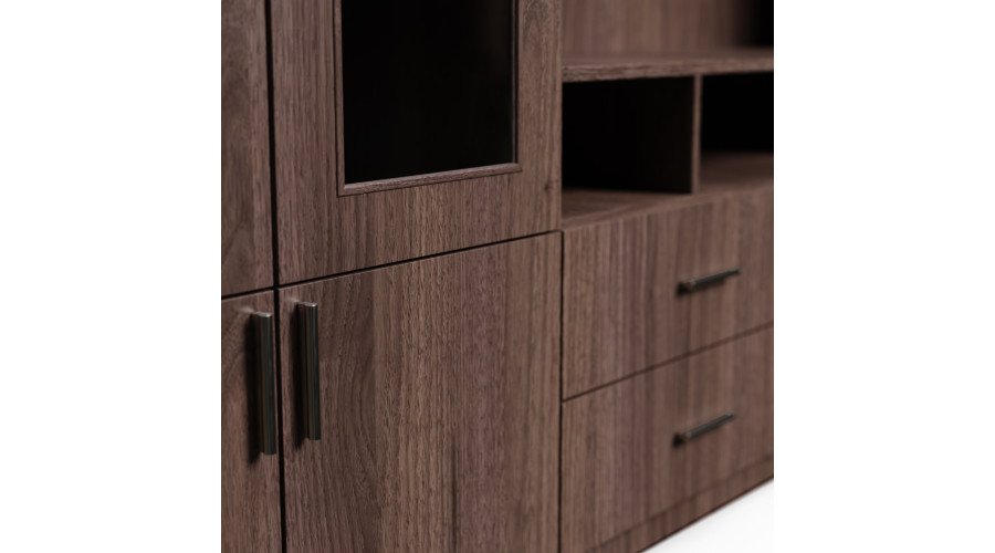Ieškote baldo, kuris tilptų viską ir vis tiek atrodytų puikiai? Ši sekcija yra puikus pasirinkimas tiems, kurie vertina modernų stilių, funkcionalumą ir puikiai organizuotą erdvę. Įspūdingo 303 cm pločio ir 240 cm aukščio sekcija suteikia daug vietos daiktams susidėti, neužgriozdindama erdvės. Tai idealus sprendimas tiek didelėms, tiek vidutinio dydžio svetainėms. Apgalvotas daiktų laikymas.Daugiapakopės atviros lentynos puikiai tinka knygoms, dekoracijoms, kolekcionuojamiems daiktams, augalams ar nuotraukų rėmeliams. Dėl įvairių lentynų dydžių jas galite lengvai pritaikyti prie savo turinio, sukurdami namų bibliotekos ar elegantiškos ekspozicijos įvaizdį. Televizoriaus skyriuje patogiai pasidėkite televizorių, konsolę ir garso įrangą, o papildomos nišos ir lentynos padeda paslėpti laidus ir priedus.Įvairūs moduliai leidžia laikyti viską – nuo dokumentų ir žaidimų iki sezoninių dekoracijų – visada ranka pasiekiamoje vietoje.Baldas pagamintas iš aukščiausios kokybės, 18 mm storio, dvipusės laminuotos „Woodeco“ (anksčiau „Pfleiderer“) plokštės. Visi elementai, įskaitant ir apatinę pusę iš grindų pusės, yra klijuoti itin patvariu 0,8 mm storio PVC kraštu. Tai suteikia papildomą apsaugą nuo drėgmės valant grindis.