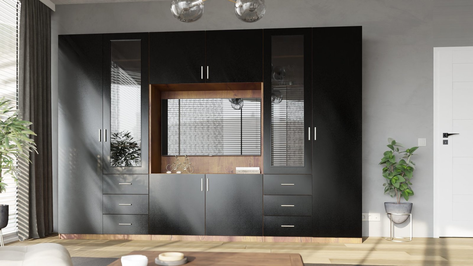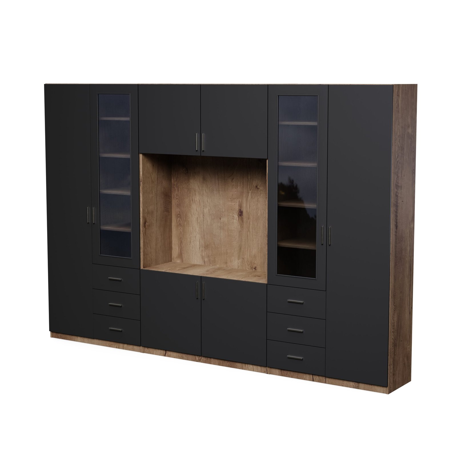 Ieškote baldo, kuris tilptų viską ir vis tiek atrodytų puikiai? Ši sekcija yra puikus pasirinkimas tiems, kurie vertina modernų stilių, funkcionalumą ir puikiai organizuotą erdvę. Įspūdingo 320 cm pločio ir 220 cm aukščio sekcija suteikia daug vietos daiktams susidėti, neužgriozdindama erdvės. Tai idealus sprendimas tiek didelėms, tiek vidutinio dydžio svetainėms. Apgalvotas daiktų laikymas.Daugiapakopės atviros lentynos puikiai tinka knygoms, dekoracijoms, kolekcionuojamiems daiktams, augalams ar nuotraukų rėmeliams. Dėl įvairių lentynų dydžių jas galite lengvai pritaikyti prie savo turinio, sukurdami namų bibliotekos ar elegantiškos ekspozicijos įvaizdį. Televizoriaus skyriuje patogiai pasidėkite televizorių, konsolę ir garso įrangą, o papildomos nišos ir lentynos padeda paslėpti laidus ir priedus.Įvairūs moduliai leidžia laikyti viską – nuo dokumentų ir žaidimų iki sezoninių dekoracijų – visada ranka pasiekiamoje vietoje.Baldas pagamintas iš aukščiausios kokybės, 18 mm storio, dvipusės laminuotos „Woodeco“ (anksčiau „Pfleiderer“) plokštės. Visi elementai, įskaitant ir apatinę pusę iš grindų pusės, yra klijuoti itin patvariu 0,8 mm storio PVC kraštu. Tai suteikia papildomą apsaugą nuo drėgmės valant grindis.