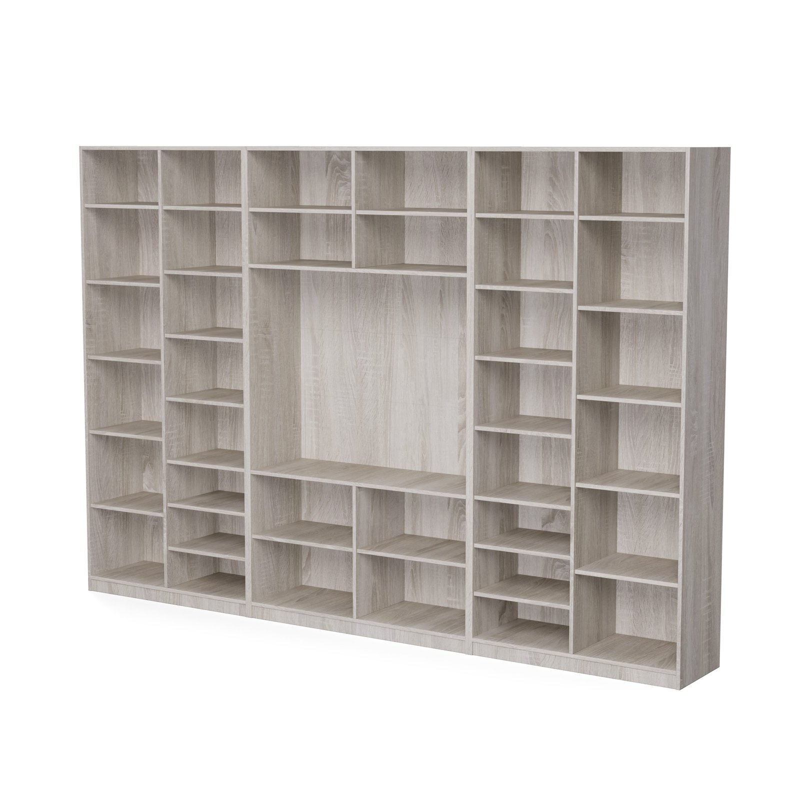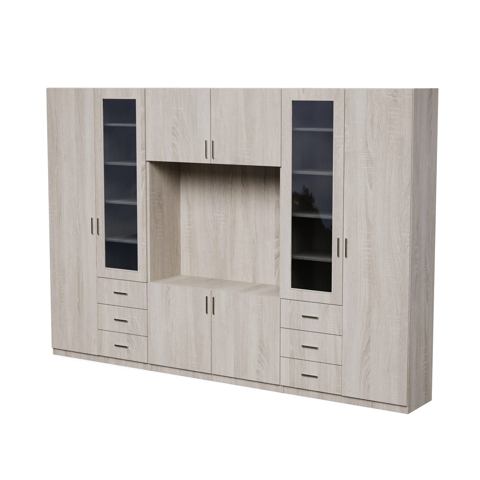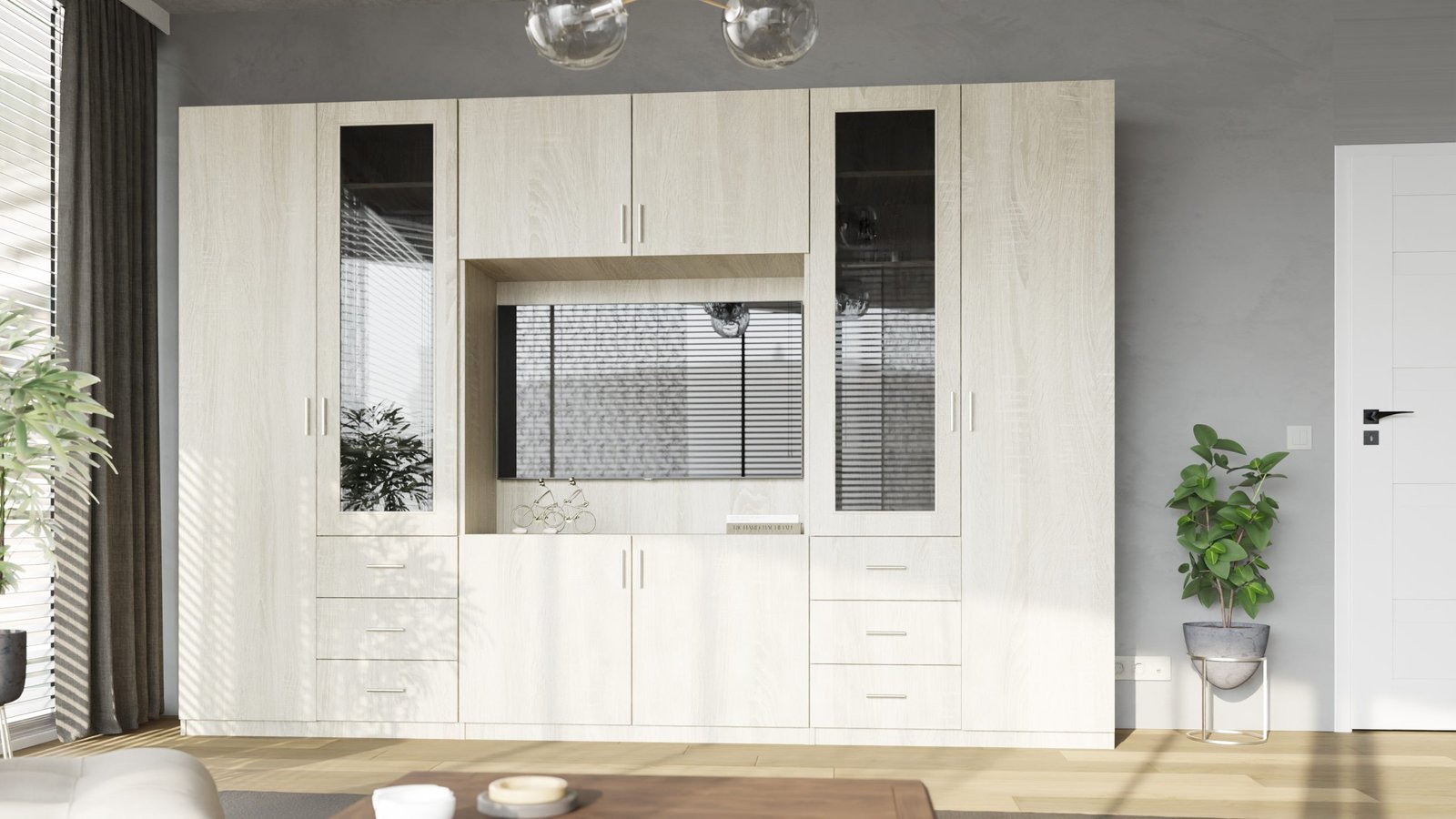 Ieškote baldo, kuris tilptų viską ir vis tiek atrodytų puikiai? Ši sekcija yra puikus pasirinkimas tiems, kurie vertina modernų stilių, funkcionalumą ir puikiai organizuotą erdvę. Įspūdingo 320 cm pločio ir 220 cm aukščio sekcija suteikia daug vietos daiktams susidėti, neužgriozdindama erdvės. Tai idealus sprendimas tiek didelėms, tiek vidutinio dydžio svetainėms. Apgalvotas daiktų laikymas.Daugiapakopės atviros lentynos puikiai tinka knygoms, dekoracijoms, kolekcionuojamiems daiktams, augalams ar nuotraukų rėmeliams. Dėl įvairių lentynų dydžių jas galite lengvai pritaikyti prie savo turinio, sukurdami namų bibliotekos ar elegantiškos ekspozicijos įvaizdį. Televizoriaus skyriuje patogiai pasidėkite televizorių, konsolę ir garso įrangą, o papildomos nišos ir lentynos padeda paslėpti laidus ir priedus.Įvairūs moduliai leidžia laikyti viską – nuo dokumentų ir žaidimų iki sezoninių dekoracijų – visada ranka pasiekiamoje vietoje.Baldas pagamintas iš aukščiausios kokybės, 18 mm storio, dvipusės laminuotos „Woodeco“ (anksčiau „Pfleiderer“) plokštės. Visi elementai, įskaitant ir apatinę pusę iš grindų pusės, yra klijuoti itin patvariu 0,8 mm storio PVC kraštu. Tai suteikia papildomą apsaugą nuo drėgmės valant grindis.