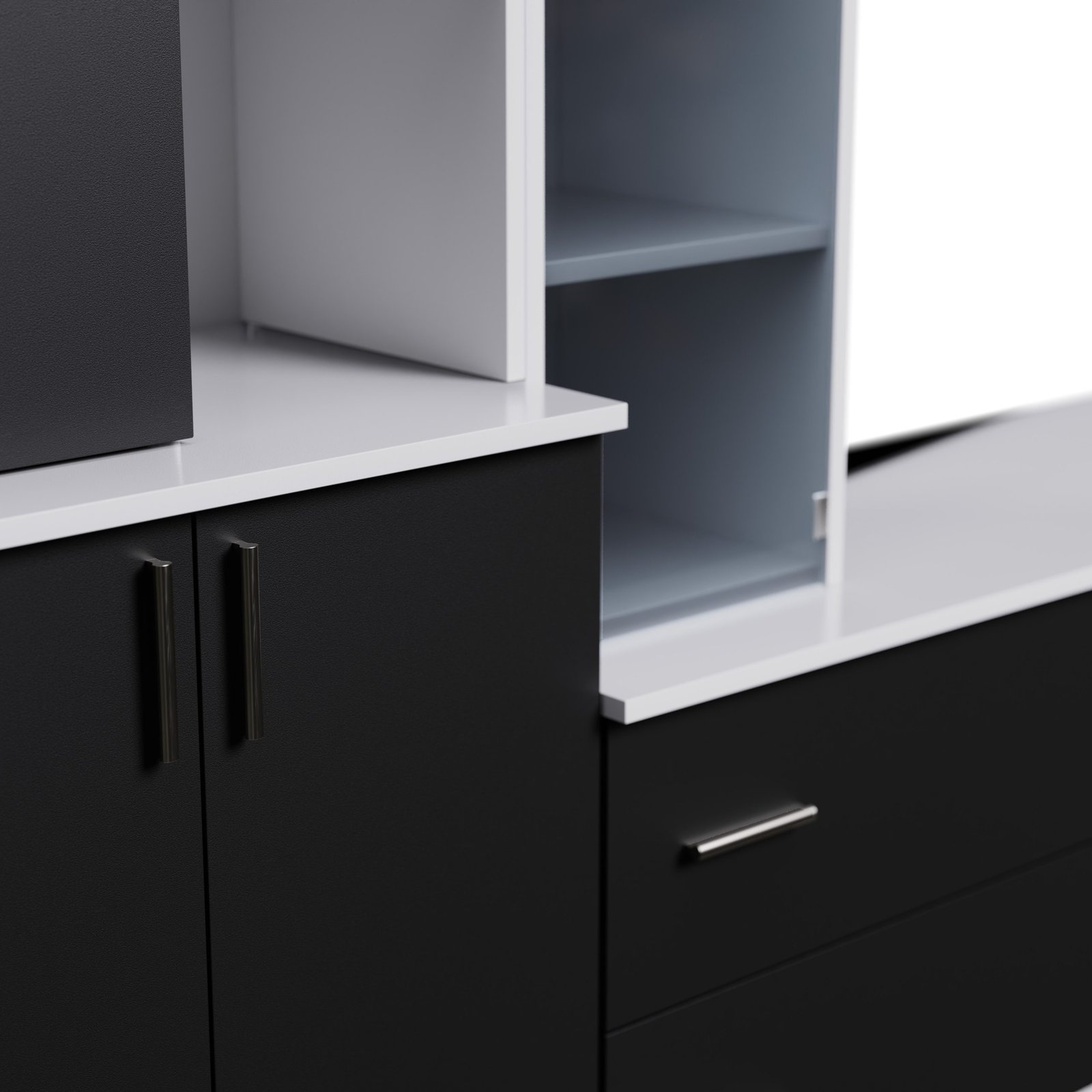 Ieškote elegantiško, funkcionalaus ir erdvaus baldo, kuris taptų jūsų svetainės širdimi? Rinkitės šią sekciją – įspūdingą dizainu ir erdvumu. 340 cm pločio ir 220 cm aukščio  atrodo išskirtinai ir suteikia daug vietos daiktams susidėti. Gerai apgalvota erdvė – gera organizacija Atviros lentynos – puiki vieta jūsų mėgstamiausiems dekoracijų elementams, knygoms, nuotraukų rėmeliams ar augalams. Jas galite išdėstyti taip, kad pabrėžtumėte interjero charakterį ir sukurtumėte jaukumo pojūtį. Uždaros spintelės ir fasadai leidžia laikyti viską, ko nenorite rodyti – nuo ​​dokumentų, stalo įrankių iki sezoninių aksesuarų. Viskas turi savo vietą, o jūs galite mėgautis nesudėtinga organizacija. Televizoriaus zona buvo sukurta galvojant apie modernias multimedijos sistemas – galite laisvai išdėstyti televizorių, priedėlį, konsolę ar garso kolonėlę, o papildomos lentynos ir spintelės padeda paslėpti laidus ir priedus. Spalva, deranti prie jūsų interjero. Baldai pagaminti iš aukščiausios kokybės, 18 mm storio, dvipusės laminuotos „Woodeco“ (anksčiau „Pfleiderer“) plokštės. Visi elementai, įskaitant ir apatinę pusę prie grindų, yra klijuoti itin patvariu 0,8 mm storio PVC kraštu. Tai suteikia papildomą apsaugą nuo drėgmės valant grindis. Galinės sienelės pagamintos iš 3 mm storio HDF plokštės, viena pusė lakuota (spalva, panaši į baldo korpuso).Ši parinktis suteikia galimybę rinktis standartinę arba aukščiausios kokybės furnitūrą. Spalva: biel czarny onyx