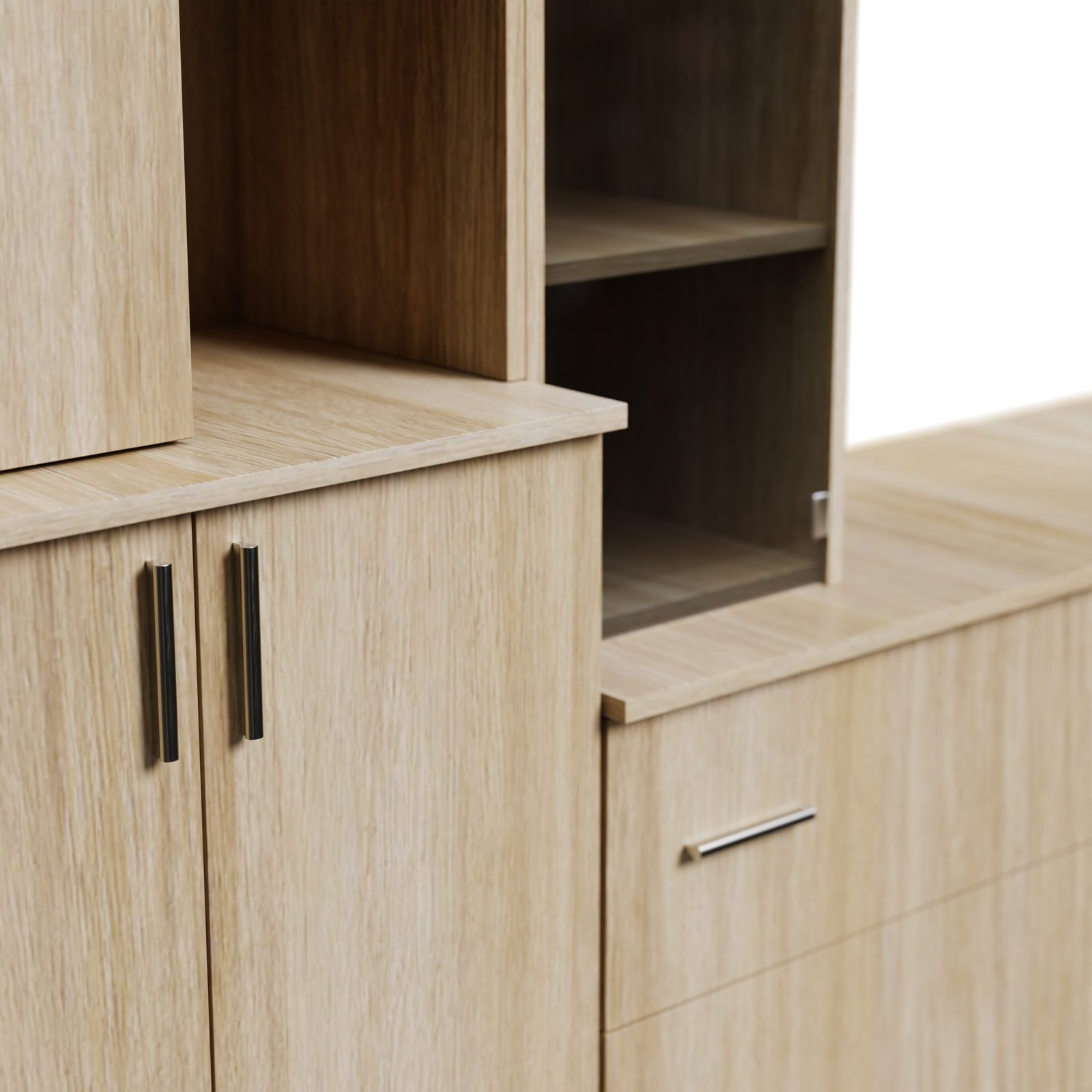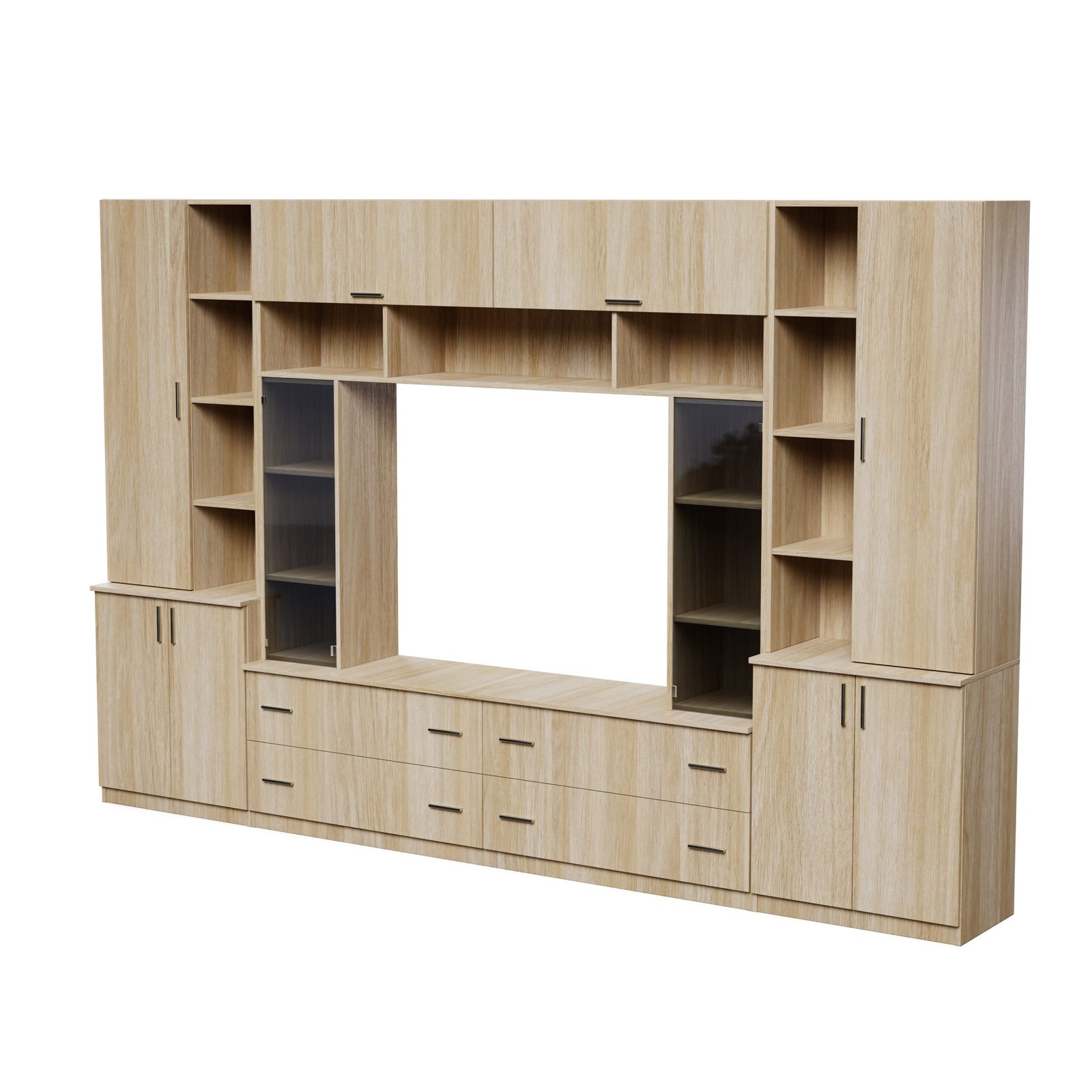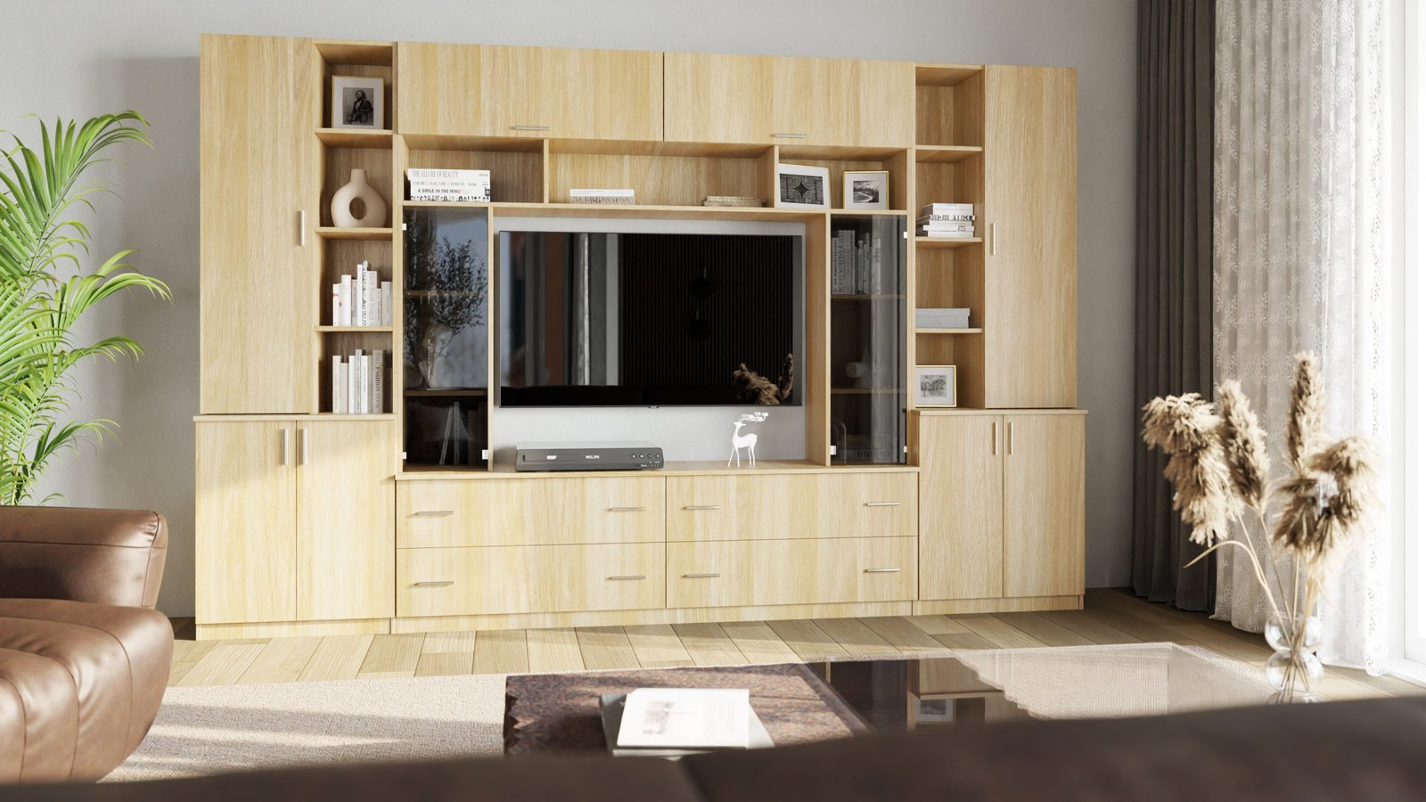 Ieškote elegantiško, funkcionalaus ir erdvaus baldo, kuris taptų jūsų svetainės širdimi? Rinkitės šią sekciją – įspūdingą dizainu ir erdvumu. 340 cm pločio ir 220 cm aukščio atrodo išskirtinai ir suteikia daug vietos daiktams susidėti. Gerai apgalvota erdvė – gera organizacija Atviros lentynos – puiki vieta jūsų mėgstamiausiems dekoracijų elementams, knygoms, nuotraukų rėmeliams ar augalams. Jas galite išdėstyti taip, kad pabrėžtumėte interjero charakterį ir sukurtumėte jaukumo pojūtį. Uždaros spintelės ir fasadai leidžia laikyti viską, ko nenorite rodyti – nuo dokumentų, stalo įrankių iki sezoninių aksesuarų. Viskas turi savo vietą, o jūs galite mėgautis nesudėtinga organizacija. Televizoriaus zona buvo sukurta galvojant apie modernias multimedijos sistemas – galite laisvai išdėstyti televizorių, priedėlį, konsolę ar garso kolonėlę, o papildomos lentynos ir spintelės padeda paslėpti laidus ir priedus. Spalva, deranti prie jūsų interjero. Baldai pagaminti iš aukščiausios kokybės, 18 mm storio, dvipusės laminuotos „Woodeco“ (anksčiau „Pfleiderer“) plokštės. Visi elementai, įskaitant ir apatinę pusę prie grindų, yra klijuoti itin patvariu 0,8 mm storio PVC kraštu. Tai suteikia papildomą apsaugą nuo drėgmės valant grindis. Galinės sienelės pagamintos iš 3 mm storio HDF plokštės, viena pusė lakuota (spalva, panaši į baldo korpuso).Ši parinktis suteikia galimybę rinktis standartinę arba aukščiausios kokybės furnitūrą. Spalva: dab amerikanski