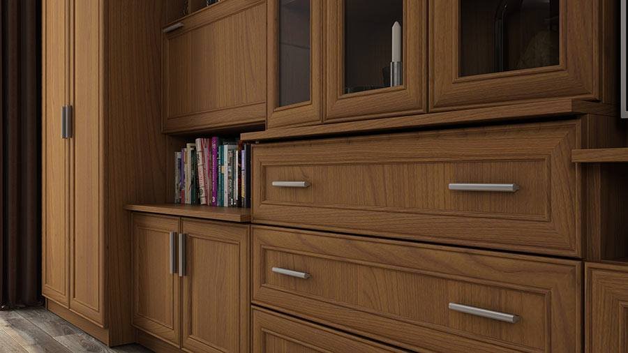 - sekciją sudaro dviejų durų spinta, pastatoma lentyna su spintelėmis, vitrina, RTV spintelė, pakabinama lentyna, vienų durų spinta;
