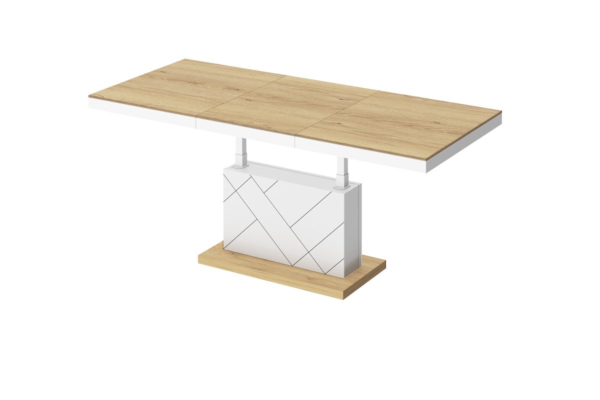 Naujiena mūsų pasiūlyme. Šis kavos staliukas yra idealus pasirinkimas ieškantiems funkcionalaus baldo. Dėl galimybės prailginti ir pakelti stalviršį, staliuką galime paversti stalu vos keliais paprastais žingsniais. Galima prailginti nuo 120 iki 170 cm. Aukštis laisvai reguliuojamas nuo 56 iki 76 cm. Visas staliukas pagamintas iš aukščiausios kokybės medžiagų. Pagrindinė medžiaga čia yra MDF plokštė, padengta blizgiu akriliniu kilimėliu.