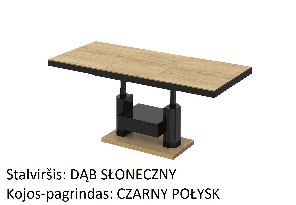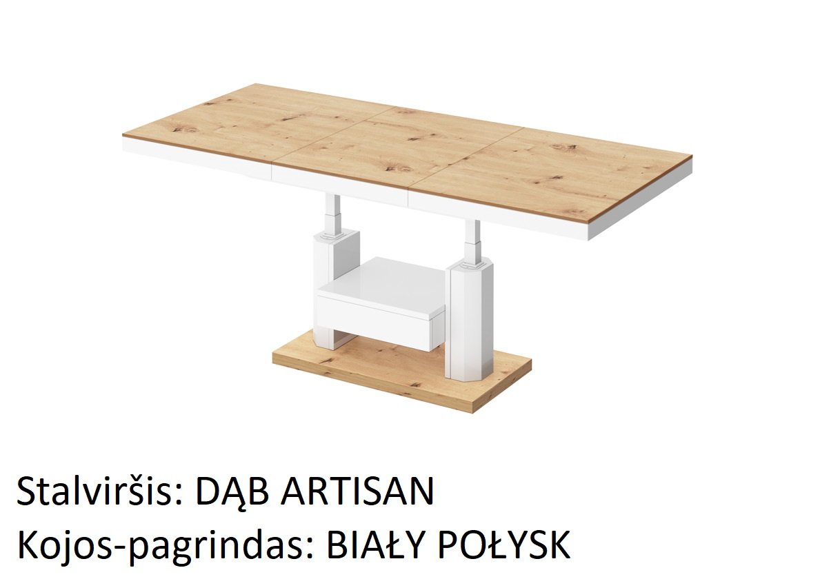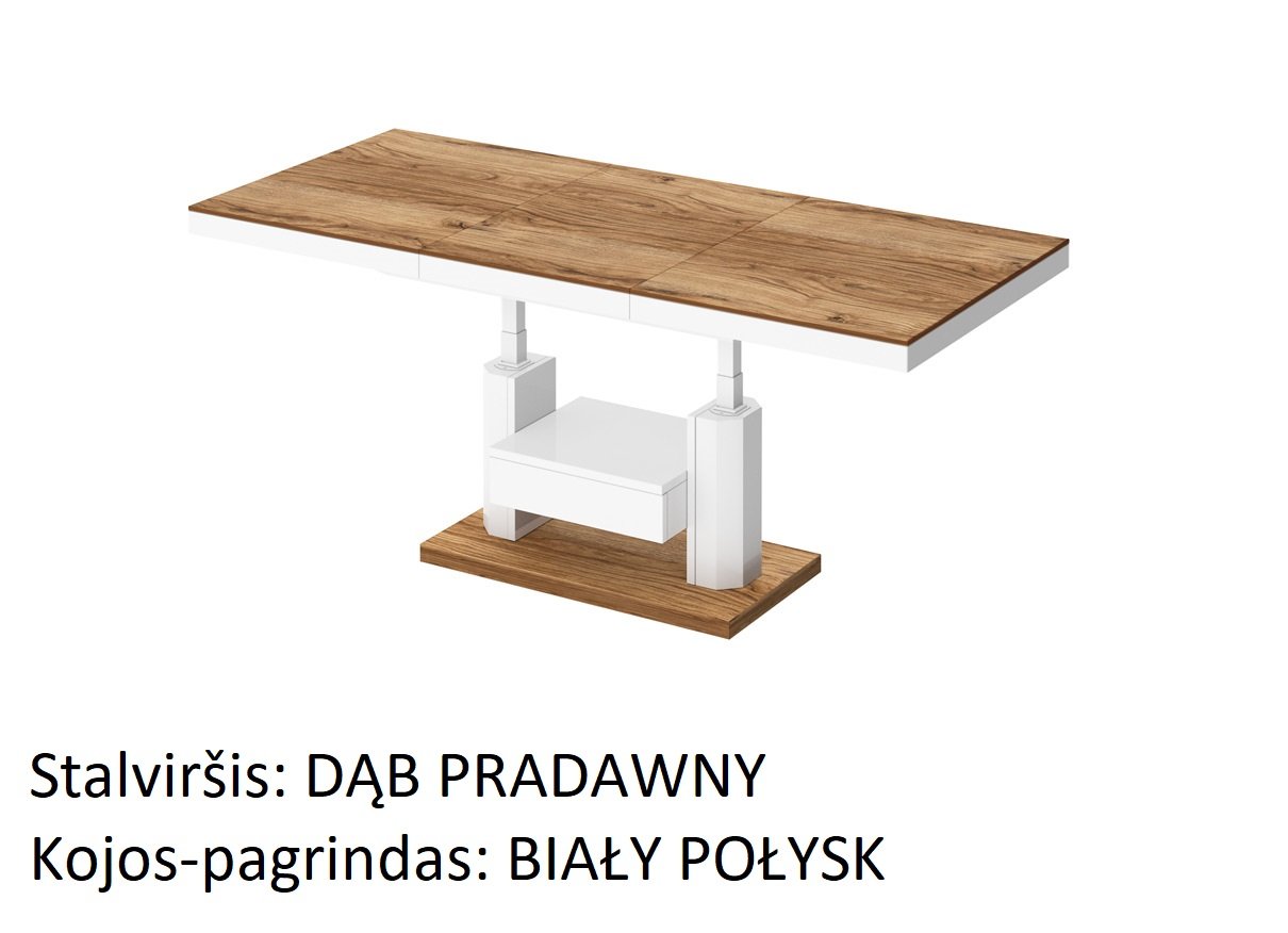 Naujiena mūsų pasiūlyme. Šis kavos staliukas yra idealus pasirinkimas ieškantiems funkcionalaus baldo. Dėl galimybės prailginti ir pakelti stalviršį, staliuką galime paversti stalu vos keliais paprastais žingsniais. Galima prailginti nuo 120 iki 170 cm. Aukštis laisvai reguliuojamas nuo 56 iki 76 cm. Visas staliukas pagamintas iš aukščiausios kokybės medžiagų. Pagrindinė medžiaga čia yra MDF plokštė, padengta blizgiu akriliniu kilimėliu. Galima įsigyti kelių madingų spalvų versijų.