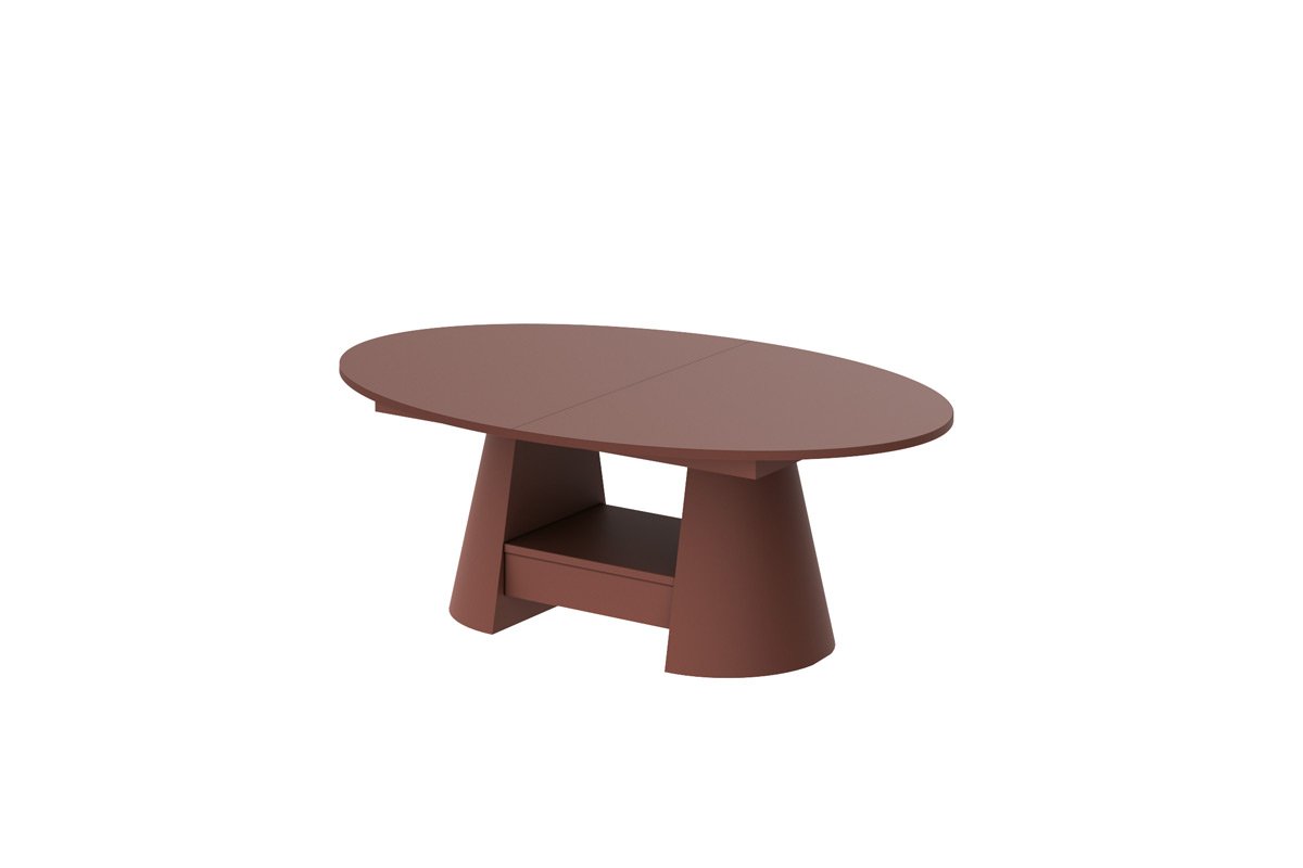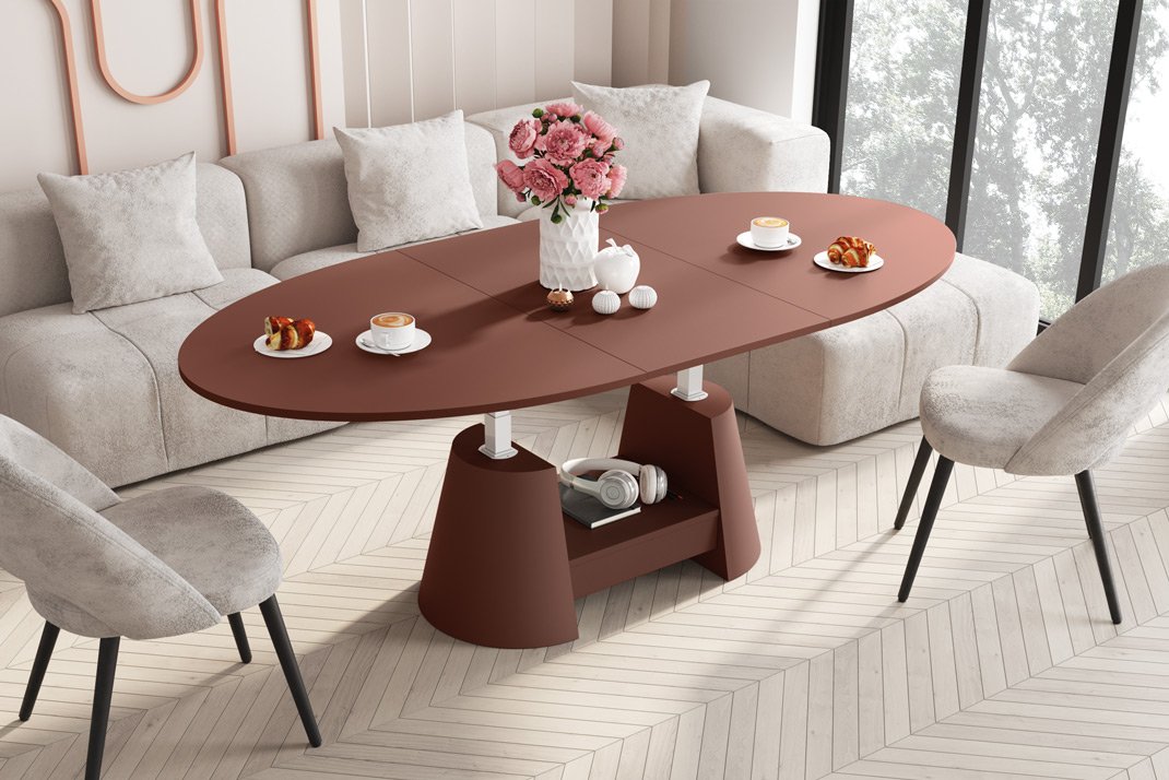Šis kavos stalas sukurtas moderniam interjerui, kuriame svarbiausia yra stilius ir praktiškumas. Ovali forma ir aukštos kokybės apdaila suteikia subtilios prabangos, pabrėžiant unikalų baldo charakterį. Kavos stalas išsiskiria unikaliu pagrindo dizainu. Jį sudaro dvi dekoratyvinės kolonos su subtilia, briaunota struktūra, suteikiančia baldui tekstūros ir gylio bei užtikrinančios stabilų atramą stalviršiui. Tarp kolonų yra praktiškas stalčius ir lentyna, puikiai tinkantys laikyti smulkius daiktus, tokius kaip žurnalai, knygos ar aksesuarai. Tačiau svarbiausia, kad yra pilnai funkcionalus kavos staliukas. Dėl išplėtimo ir pakėlimo funkcijos jis greitai transformuojasi iš elegantiško kavos staliuko į pilno dydžio stalą, puikiai tinkantį didesniems susitikimams ar valgymams. Kavos stalo aukštį galima lengvai ir greitai reguliuoti nuo 55 iki 75 cm, naudojant pneumatinius keltuvus.SPALVA-BORDO