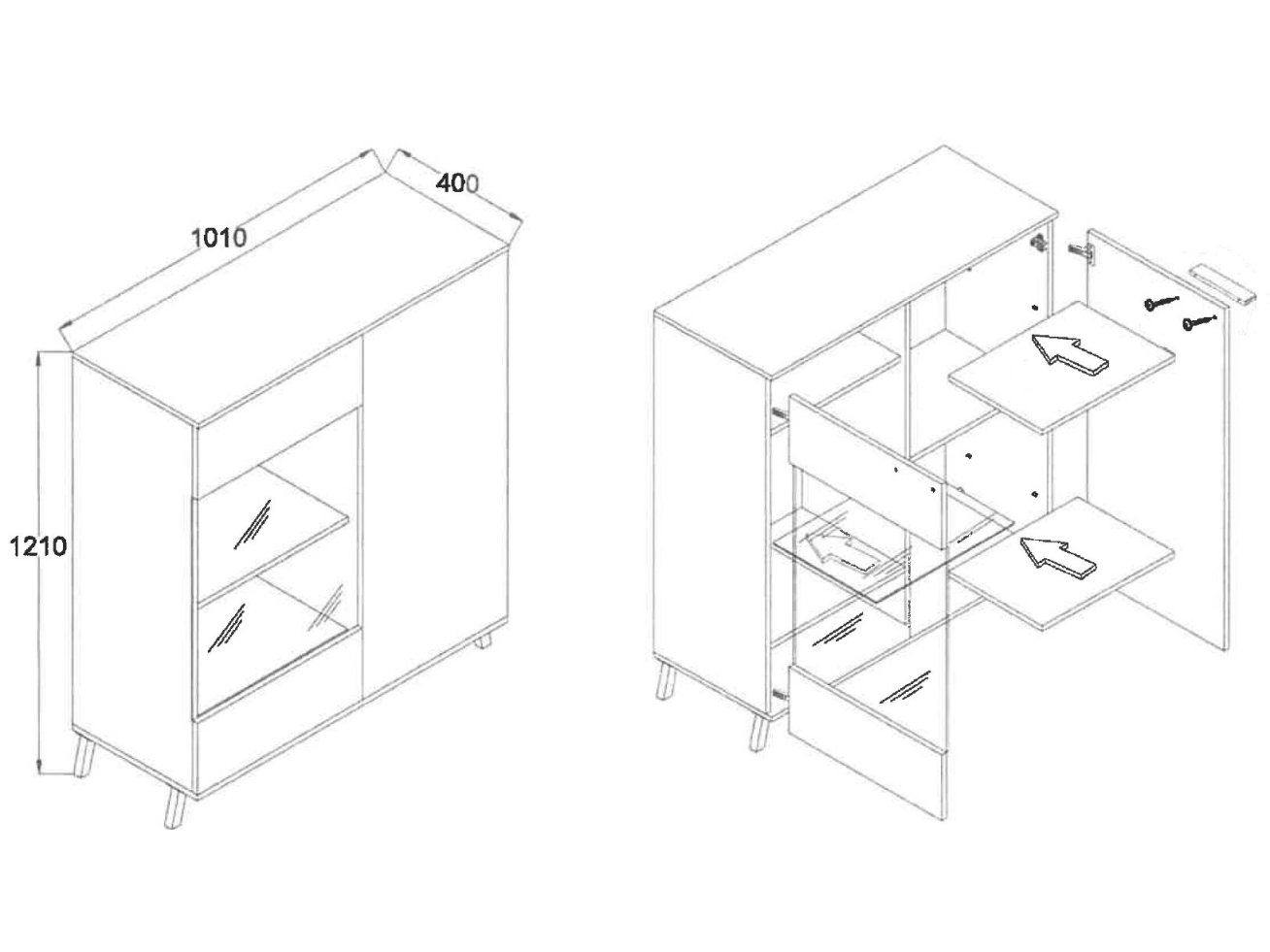 - Medžiaga: Laminuota medžio drožlių plokštė – (LMDP), stiklas.