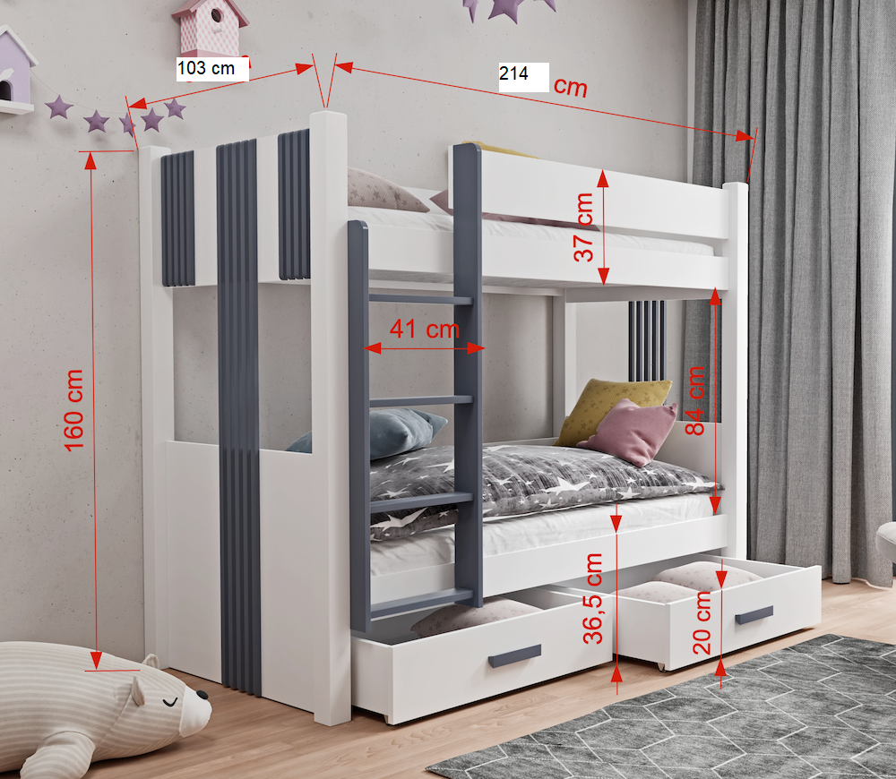 Lova pagaminta iš pušies medienos, padengtos baltu akrilo/dąb akrilo apdaila(pirmoji nuotrauka) ir dekoruota balta plokšte. Trys lako sluoksniai suteikia paviršiui atsparumą pažeidimams ir dėmėms. Apatinėje dalyje yra du erdvūs stalčiai. Galima rinktis iš medžio ir plokštės spalvų.Galima kopėtėles pasirinkti iš kairės ar dešinės pusės. Čiužiniai į lovą neįeina ir turi būti užsakomi atskirai.