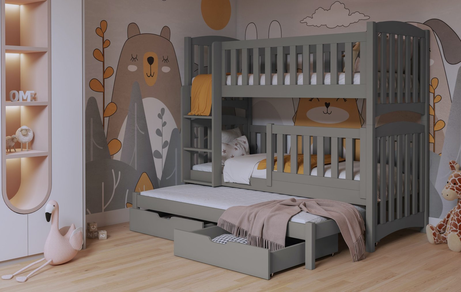 Sukurdama gamykla  dviaukštę lovą, ne tik ypatingą dėmesį skyrė  jų naudojimo saugumui, bet ir funkcionalumui bei estetikai. Pušis yra tobula medžiaga, atitinkanti visus šiuos reikalavimus. Jis ypač gerai veikia žemose dviaukštėse lovose, kurių dėka kiekvienas vaikas gali susitvarkyti savo lovą, lengvai išsitraukti antrą lovą ir išimti patalynę iš stalčiaus. Šios medžiagos tvirtumas itin svarbus dirbant su aukštomis lovomis. Komfortas ir maksimalus erdvės išnaudojimas  yra dideli privalumai ir yra gamyklos sudėtos pastangas, kad būtų užtikrintas jų saugumas. Trijų vietų pušinė lova – puikus sprendimas, kai norisi namuose turėti papildomą lovą netikėtam svečiui. Lova pagaminta  iš pušies medienos, balto akrilo (pagrindinė nuotrauka). Trys lako sluoksniai padaro paviršių atsparų pažeidimams ir nešvarumams. Apatinėje dalyje yra du erdvūs stalčiai. Galimos medienos spalvos žemiau. Čiužinukai -poroloniniai – 8 cm .