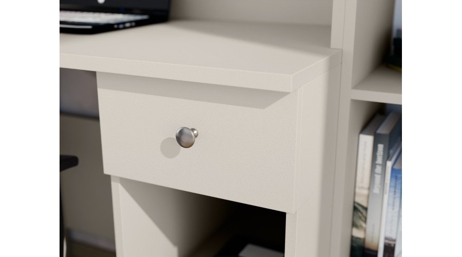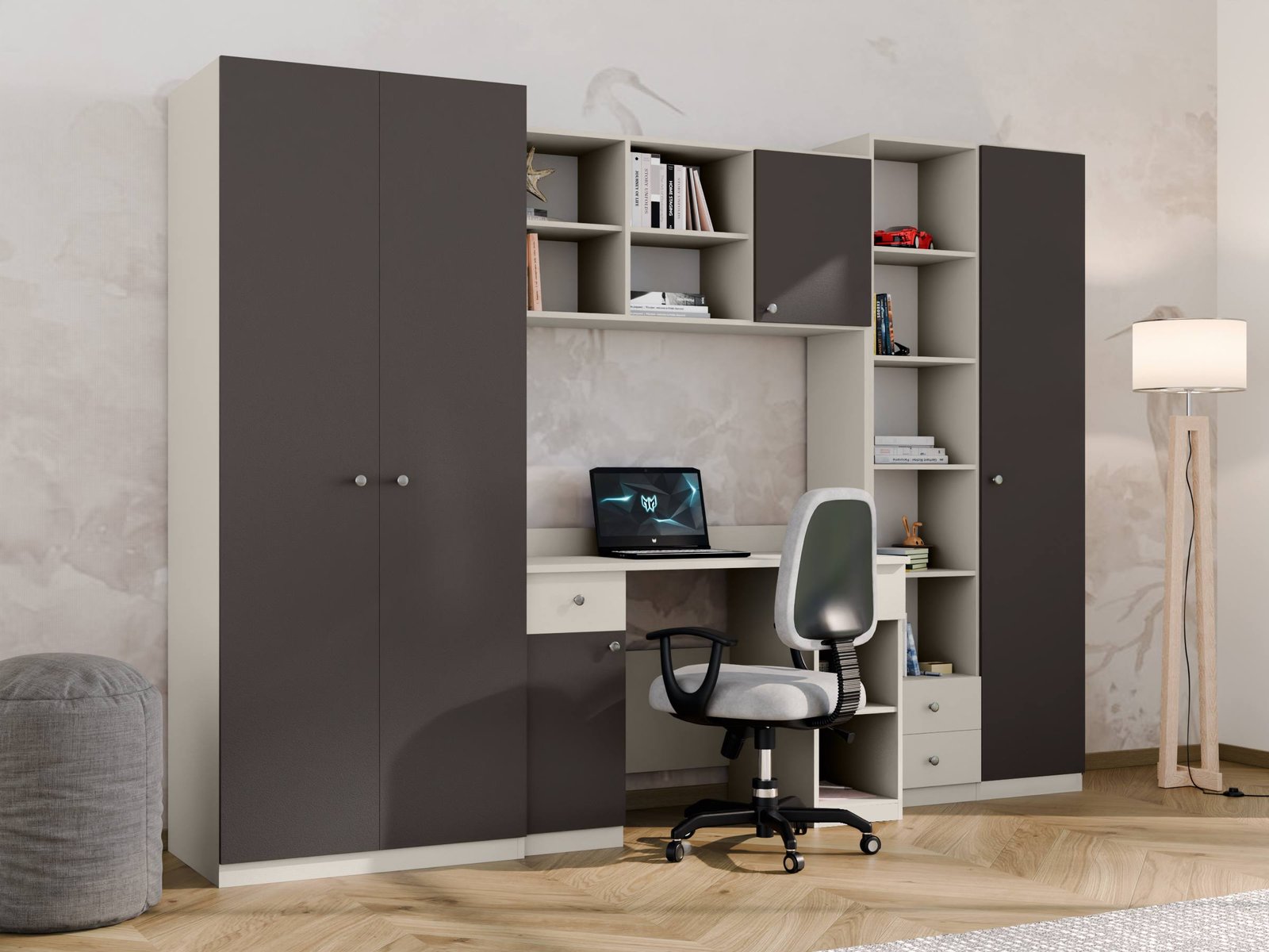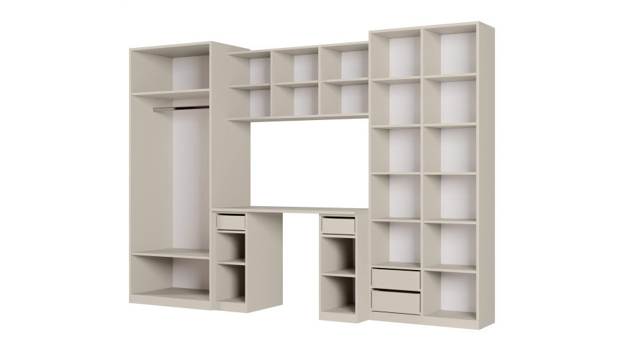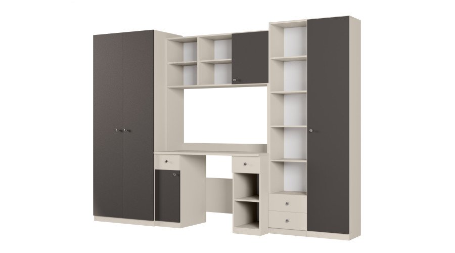 Vaikų ir paauglių sekcija yra išbaigtas ir funkcionalus sprendimas, puikiai tinkantis vaiko ar paauglio kambariui. Sukurtas sukurti patogią erdvę mokymuisi, daiktų laikymui ir kasdieniam poilsiui, komplektas išlaiko modernų vaizdą ir lengvą, erdvų pojūtį. Sekciją sudaro plati spinta, praktiškas stalas, daugybė lentynų ir spintelių su subtiliais, pastelinių spalvų fasadais. Tai užtikrina, kad visi daiktai, tokie kaip drabužiai, knygos, sąsiuviniai, žaislai ir mokyklinės prekės, turėtų savo erdvę, todėl lengviau palaikyti tvarką kambaryje. Stalas su ergonomiška darbo vieta puikiai tinka tiek mokymuisi, tiek darbui kompiuteriu, o atviros lentynos virš jo leidžia eksponuoti dekoracijas ar mėgstamas knygas. Modernus kašmiro ir pastelinės  pilkai grafito spalvų derinys suteikia komplektui draugišką, erdvų pojūtį, kuris puikiai papildo vaikų ir paauglių interjerą. Ši sekcija derina estetiką su funkcionalumu ir gerai tarnaus jums daugelį metų, augant kartu su jūsų vaiku ir prisitaikant prie jo kintančių poreikių. Visas blokas yra gerai apgalvotų matmenų – plotis 280 cm, aukštis 200 cm ir gylis 32–53 cm – todėl idealiai tinka tiek mažesniems, tiek didesniems kambariams. Baldai pagaminti iš aukščiausios kokybės, 18 mm storio, dvipusės laminuotos „Woodeco“ (anksčiau „Pfleiderer“) plokštės. Visi elementai, įskaitant ir apatinį kraštą iš grindų pusės, yra klijuoti itin patvariu 0,8 mm storio PVC kraštu. Tai suteikia papildomą apsaugą nuo drėgmės valant grindis. Galinės sienelės pagamintos iš 3 mm storio, vienpusės laminuotos HDF plokštės (atitinkančios baldo korpusą).