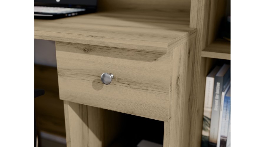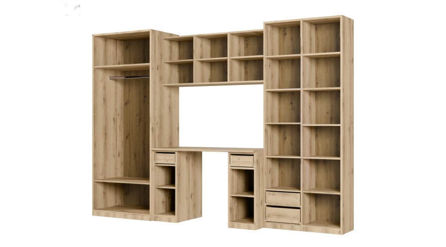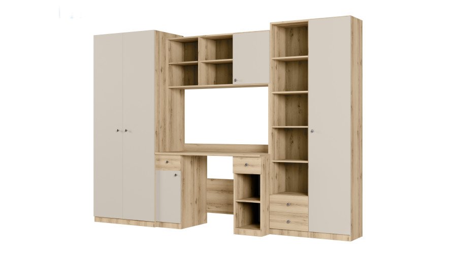 Vaikų ir paauglių sekcija yra išbaigtas ir funkcionalus sprendimas, puikiai tinkantis vaiko ar paauglio kambariui. Sukurtas sukurti patogią erdvę mokymuisi, daiktų laikymui ir kasdieniam poilsiui, komplektas išlaiko modernų vaizdą ir lengvą, erdvų pojūtį. Sekciją sudaro plati spinta, praktiškas stalas, daugybė lentynų ir spintelių su subtiliais, pastelinių spalvų fasadais. Tai užtikrina, kad visi daiktai, tokie kaip drabužiai, knygos, sąsiuviniai, žaislai ir mokyklinės prekės, turėtų savo erdvę, todėl lengviau palaikyti tvarką kambaryje. Stalas su ergonomiška darbo vieta puikiai tinka tiek mokymuisi, tiek darbui kompiuteriu, o atviros lentynos virš jo leidžia eksponuoti dekoracijas ar mėgstamas knygas. Modernus kašmiro ir pastelinės  ąž. grand spalvų derinys suteikia komplektui draugišką, erdvų pojūtį, kuris puikiai papildo vaikų ir paauglių interjerą. Ši sekcija derina estetiką su funkcionalumu ir gerai tarnaus jums daugelį metų, augant kartu su jūsų vaiku ir prisitaikant prie jo kintančių poreikių. Visas blokas yra gerai apgalvotų matmenų – plotis 280 cm, aukštis 200 cm ir gylis 32–53 cm – todėl idealiai tinka tiek mažesniems, tiek didesniems kambariams. Baldai pagaminti iš aukščiausios kokybės, 18 mm storio, dvipusės laminuotos „Woodeco“ (anksčiau „Pfleiderer“) plokštės. Visi elementai, įskaitant ir apatinį kraštą iš grindų pusės, yra klijuoti itin patvariu 0,8 mm storio PVC kraštu. Tai suteikia papildomą apsaugą nuo drėgmės valant grindis. Galinės sienelės pagamintos iš 3 mm storio, vienpusės laminuotos HDF plokštės (atitinkančios baldo korpusą).
