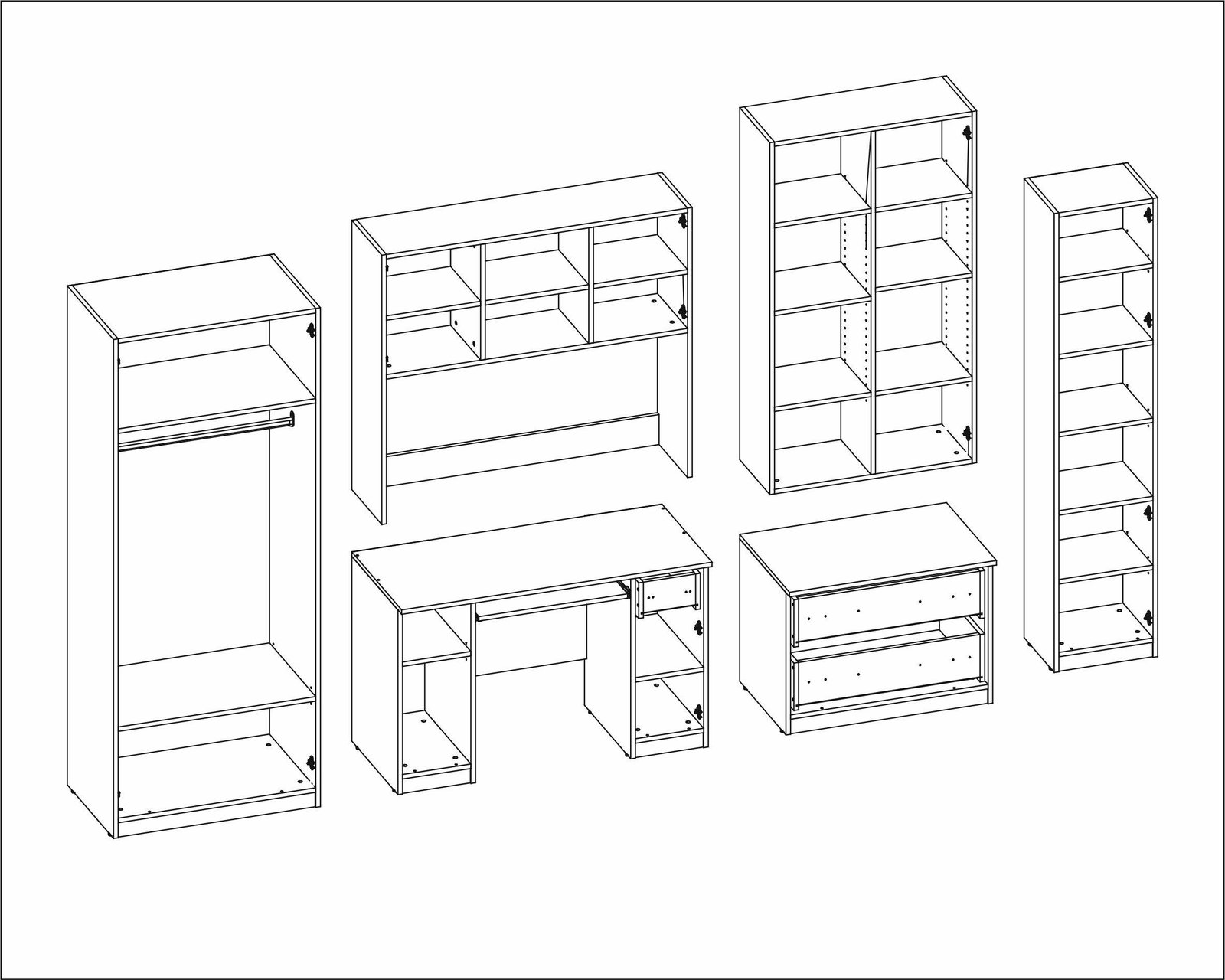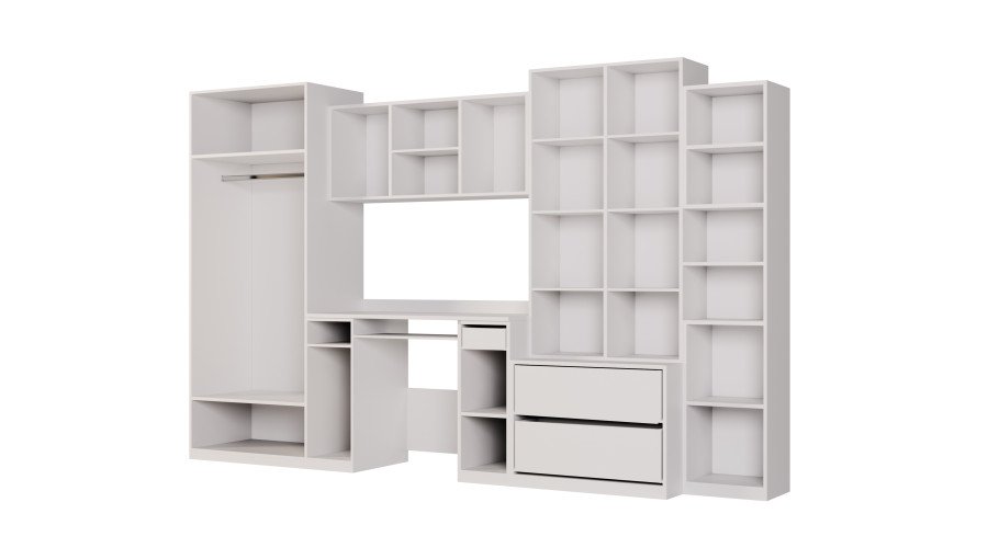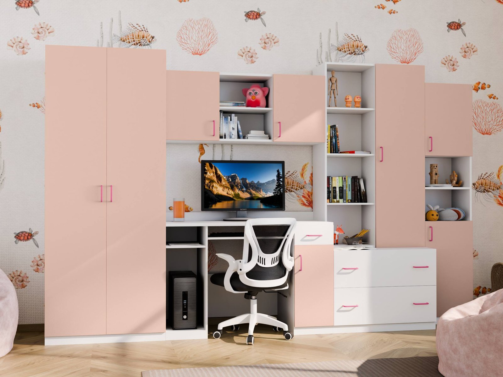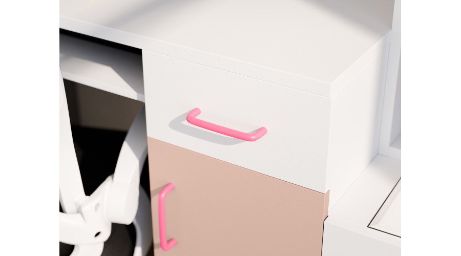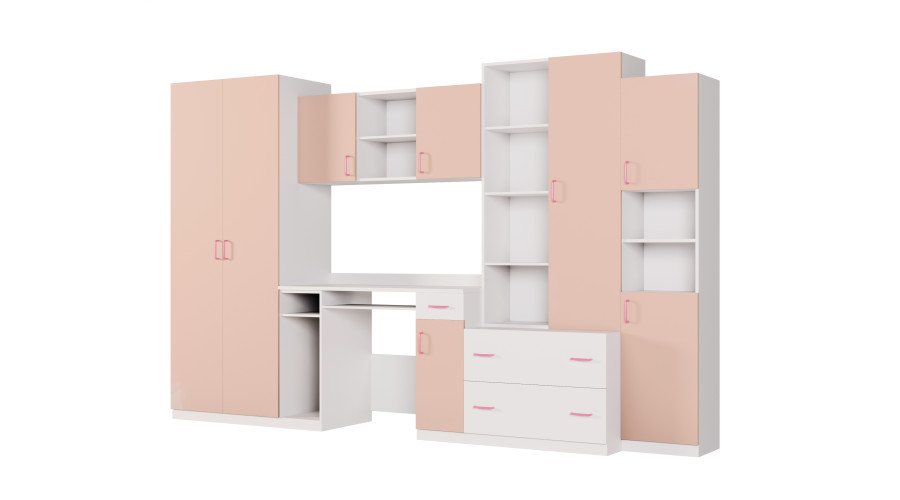 Vaikų ir paauglių sekcija yra išbaigtas ir funkcionalus sprendimas, puikiai tinkantis vaiko ar paauglio kambariui. Sukurtas sukurti patogią erdvę mokymuisi, daiktų laikymui ir kasdieniam poilsiui, komplektas išlaiko modernų vaizdą ir lengvą, erdvų pojūtį. Sekciją sudaro plati spinta, praktiškas stalas, daugybė lentynų ir spintelių su subtiliais, pastelinių spalvų fasadais. Tai užtikrina, kad visi daiktai, tokie kaip drabužiai, knygos, sąsiuviniai, žaislai ir mokyklinės prekės, turėtų savo erdvę, todėl lengviau palaikyti tvarką kambaryje. Stalas su ergonomiška darbo vieta puikiai tinka tiek mokymuisi, tiek darbui kompiuteriu, o atviros lentynos virš jo leidžia eksponuoti dekoracijas ar mėgstamas knygas. Modernus baltos ir pastelinės rožinės spalvų derinys suteikia komplektui draugišką, erdvų pojūtį, kuris puikiai papildo vaikų ir paauglių interjerą. Ši sekcija derina estetiką su funkcionalumu ir gerai tarnaus jums daugelį metų, augant kartu su jūsų vaiku ir prisitaikant prie jo kintančių poreikių. Visas blokas yra gerai apgalvotų matmenų – plotis 320 cm, aukštis 200 cm ir gylis 32–53 cm – todėl idealiai tinka tiek mažesniems, tiek didesniems kambariams. Baldai pagaminti iš aukščiausios kokybės, 18 mm storio, dvipusės laminuotos „Woodeco“ (anksčiau „Pfleiderer“) plokštės. Visi elementai, įskaitant ir apatinį kraštą iš grindų pusės, yra klijuoti itin patvariu 0,8 mm storio PVC kraštu. Tai suteikia papildomą apsaugą nuo drėgmės valant grindis. Galinės sienelės pagamintos iš 3 mm storio, vienpusės laminuotos HDF plokštės (atitinkančios baldo korpusą).