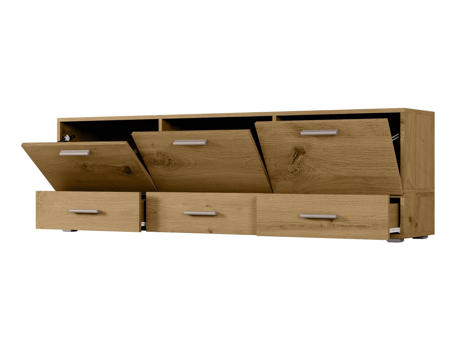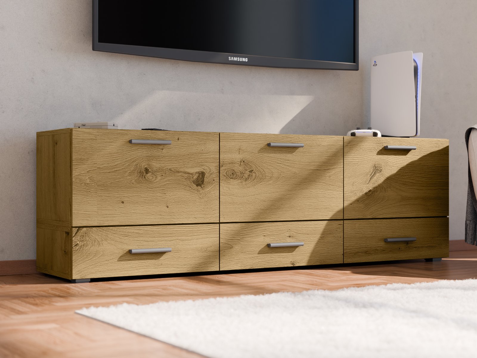 Ši  modulinė komoda – tai modernus baldas, atitinkantis šiuolaikinių vartotojų, ieškančių stiliaus ir funkcionalumo derinio, lūkesčius. Sukurta atsižvelgiant į besikeičiančius namų savininkų poreikius, ji puikiai tiks įvairiose erdvėse – nuo ​​jaukaus miegamojo iki elegantiškos svetainės, kūrybingo vaikų kambario ir net minimalistinio namų biuro. Vienas didžiausių komodos privalumų – lanksčios tvirtinimo galimybės. Ji gali stovėti tiesiai ant grindų, paremta pridedamomis moderniomis, žemomis kojelėmis, kurios suteikia jai lengvumo pojūtį ir užtikrina stabilumą. Arba, šio išmanaus dizaino, galite ją pakabinti ant sienos, sukurdami elegantišką, „plaukiojančio“ efektą. Modulinis dizainas suteikia visišką laisvę išdėstant stalčius ir dureles. Galite juos stumdyti į kairę ir į dešinę, keisti vietomis ir perkelti aukštyn ir žemyn, kurdami įvairias kompozicijas. Jei po kurio laiko nuspręsite, kad išdėstymą reikia pakeisti, tereikia kelių akimirkų, kad pertvarkytumėte komodą pagal savo naują idėją. Komoda ne tik puikiai atrodo, bet ir puikiai atlieka savo paskirtį. Jos viduje tilps viskas, ką norite turėti po ranka, bet nebūtinai gerai matomoje vietoje. Platus stalviršis suteikia puikią erdvę nuotraukoms, dekoracijoms, mėgstamoms knygoms ar kelionių suvenyrams eksponuoti. Komoda buvo suprojektuota ir pagaminta Lenkijoje, o galimybė užsisakyti ją bet kokios spalvų gamos leidžia lengvai priderinti prie bet kokio interjero. Baldai pagaminti iš aukščiausios kokybės, 18 mm storio, dvipusės laminuotos plokštės iš „Woodeco“ (anksčiau „Pfleiderer“). Visi elementai apklijuoti itin patvariu 0,8 mm storio PVC apvadu, kuris yra atsparus drėgmei ir nedideliems smūgiams.Galinės sienelės pagamintos iš 3 mm storio, vienpusės laminuotos HDF plokštės (atitinkančios baldo korpuso spalvą). Svarbi informacija: Komplekte yra visas priedų rinkinys su aiškiomis surinkimo instrukcijomis. Baldai parduodami supakuoti. Papildomai: Pilno ištraukimo stalčiai su savaiminio užsidarymo mechanizmais ir švelniai užsidarančiomis durelių vyriais! Spalva: artisan