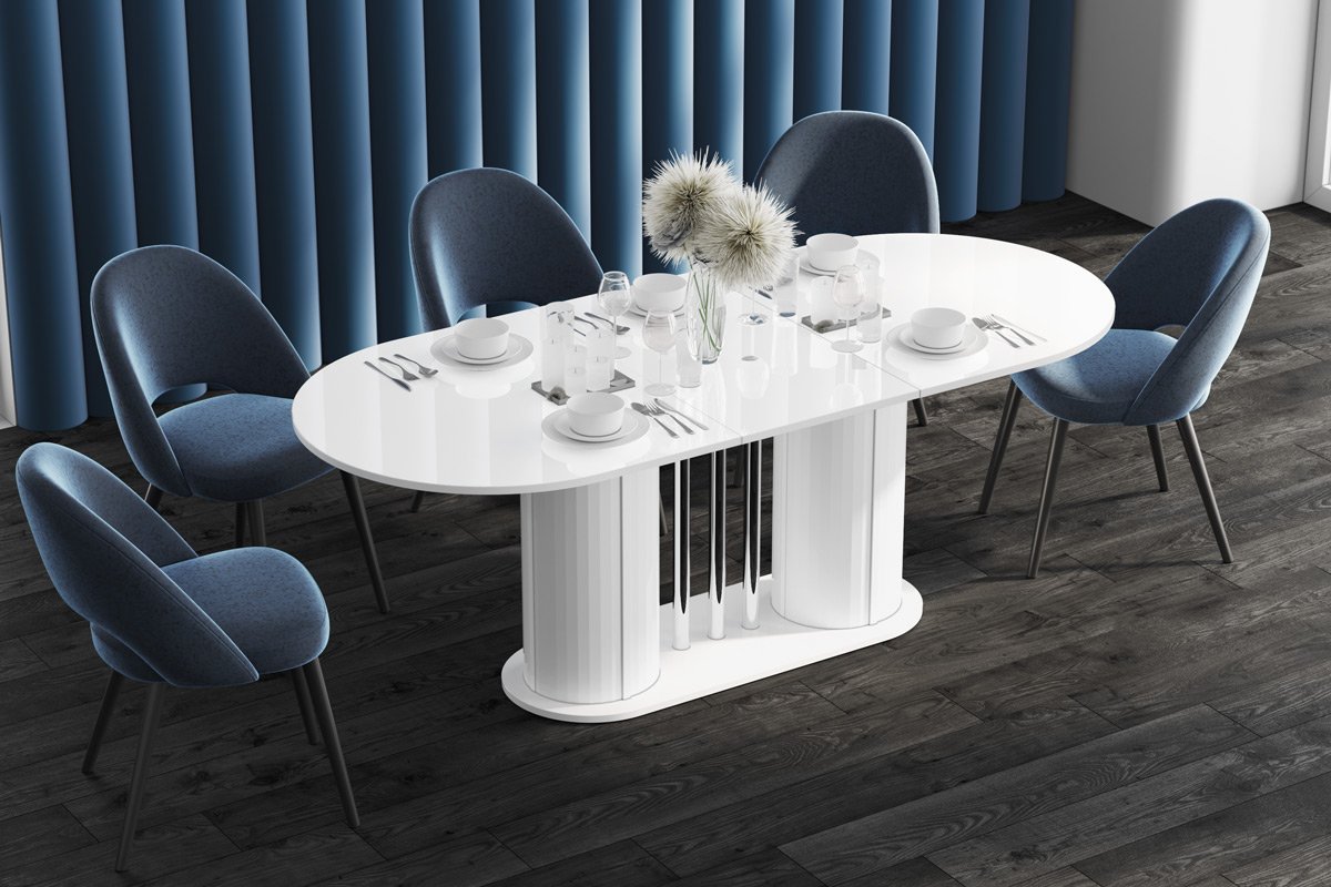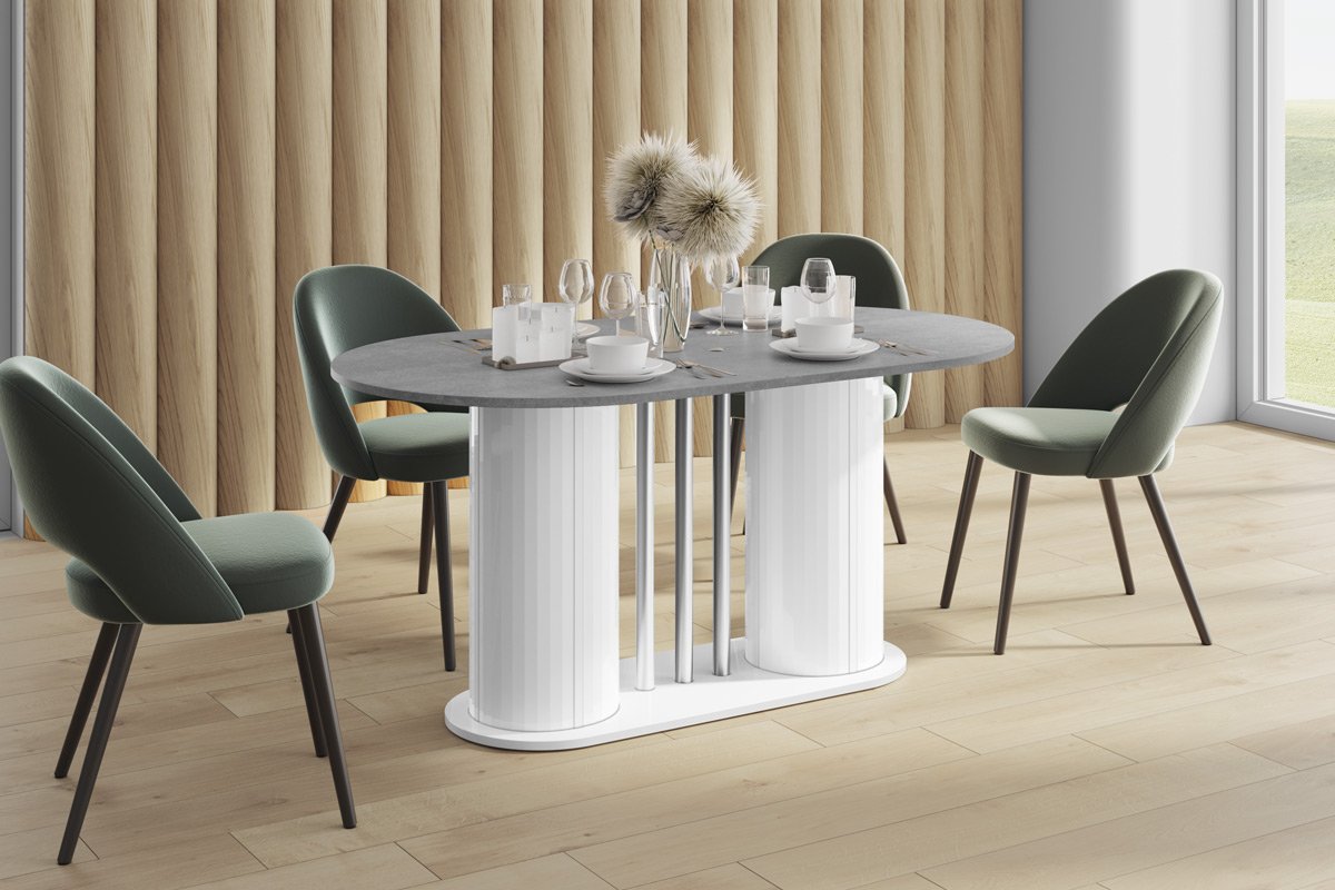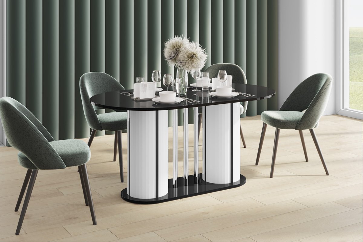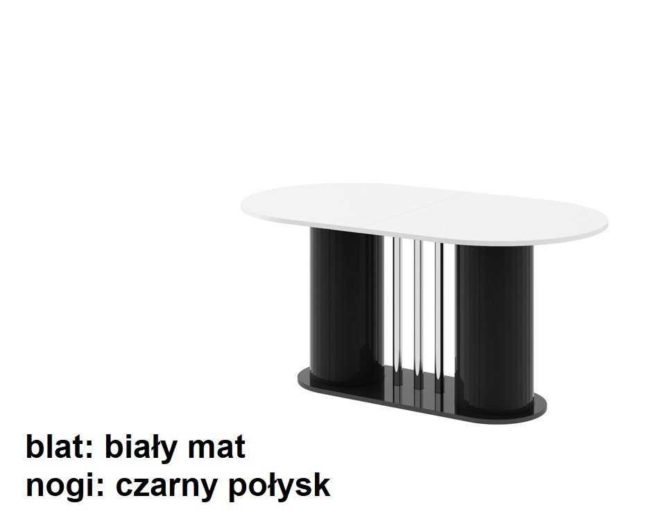 VIRTUVĖS stalas yra moderni forma, derinama su dideliu funkcionalumu. Ovalo formos stalviršis remiasi į dvi modernias kolonas, tarp kurių įkomponuoti elegantiški, dekoratyvūs, chromuoti vamzdeliai. Dėl to stalas sukuria subtilios ir rafinuotos konstrukcijos įspūdį, kartu yra labai tvirtas, tvirtas ir patvarus. Jo dizainas atspindi naujausias baldų dizaino tendencijas. Stalas yra labai praktiškas. Turi prailginimo funkciją nuo 160 cm iki 208 cm (vienas prailginimo įdėklas slepiasi po stalviršiu).Stalo konstrukcija, skirtingai nei klasikinio keturkojo modelio, yra itin stabili ir leidžia aplink jį laisvai išsidėstyti daugiau kėdžių.