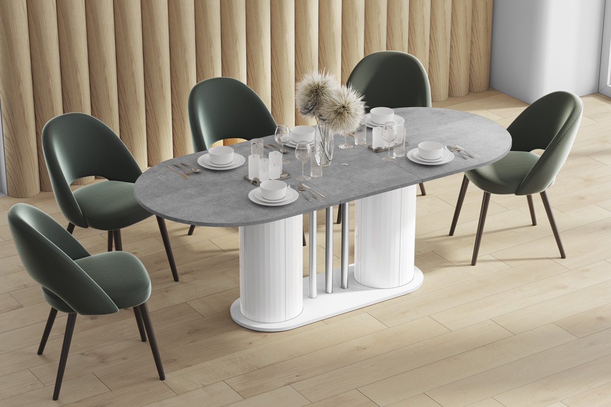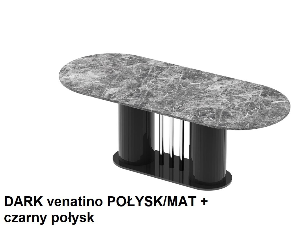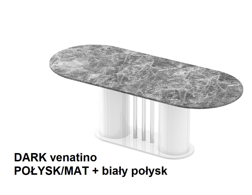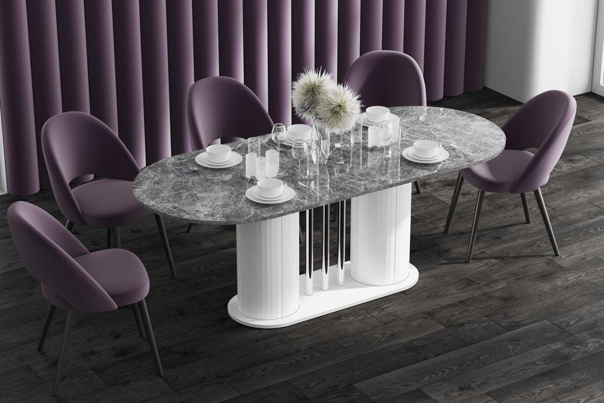 VIRTUVĖS stalas yra moderni forma, derinama su dideliu funkcionalumu. Ovalo formos stalviršis remiasi į dvi modernias kolonas, tarp kurių įkomponuoti elegantiški, dekoratyvūs, chromuoti vamzdeliai. Dėl to stalas sukuria subtilios ir rafinuotos konstrukcijos įspūdį, kartu yra labai tvirtas, tvirtas ir patvarus. Jo dizainas atspindi naujausias baldų dizaino tendencijas. Stalas yra labai praktiškas. Turi prailginimo funkciją nuo 160 cm iki 208 cm (vienas prailginimo įdėklas slepiasi po stalviršiu).Stalo konstrukcija, skirtingai nei klasikinio keturkojo modelio, yra itin stabili ir leidžia aplink jį laisvai išsidėstyti daugiau kėdžių.