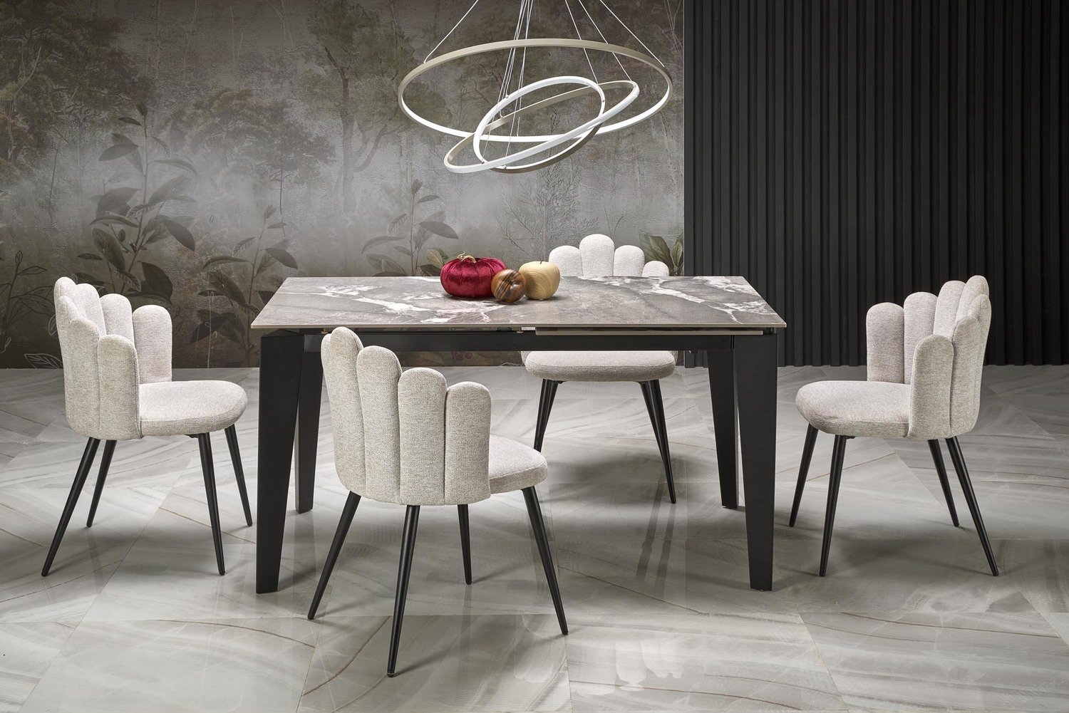 - stalas yra modernus, išskleidžiamas baldas, kuriame dera elegancija ir funkcionalumas. Naujoje spalvų versijoje jis atrodo išskirtinai stilingai – baltas marmurinis stalviršis suteikia interjerui prabangaus charakterio, o juodos, milteliniu būdu dažytos plieninės kojelės – modernų, industrinį akcentą. Sukepintas stalviršis yra labai atsparus įbrėžimams, aukštai temperatūrai ir drėgmei, todėl idealiai tinka kasdieniam naudojimui. Stabili konstrukcija užtikrina ilgaamžiškumą, o sulankstymo mechanizmas leidžia lengvai pritaikyti stalo dydį prie naudotojų poreikių.