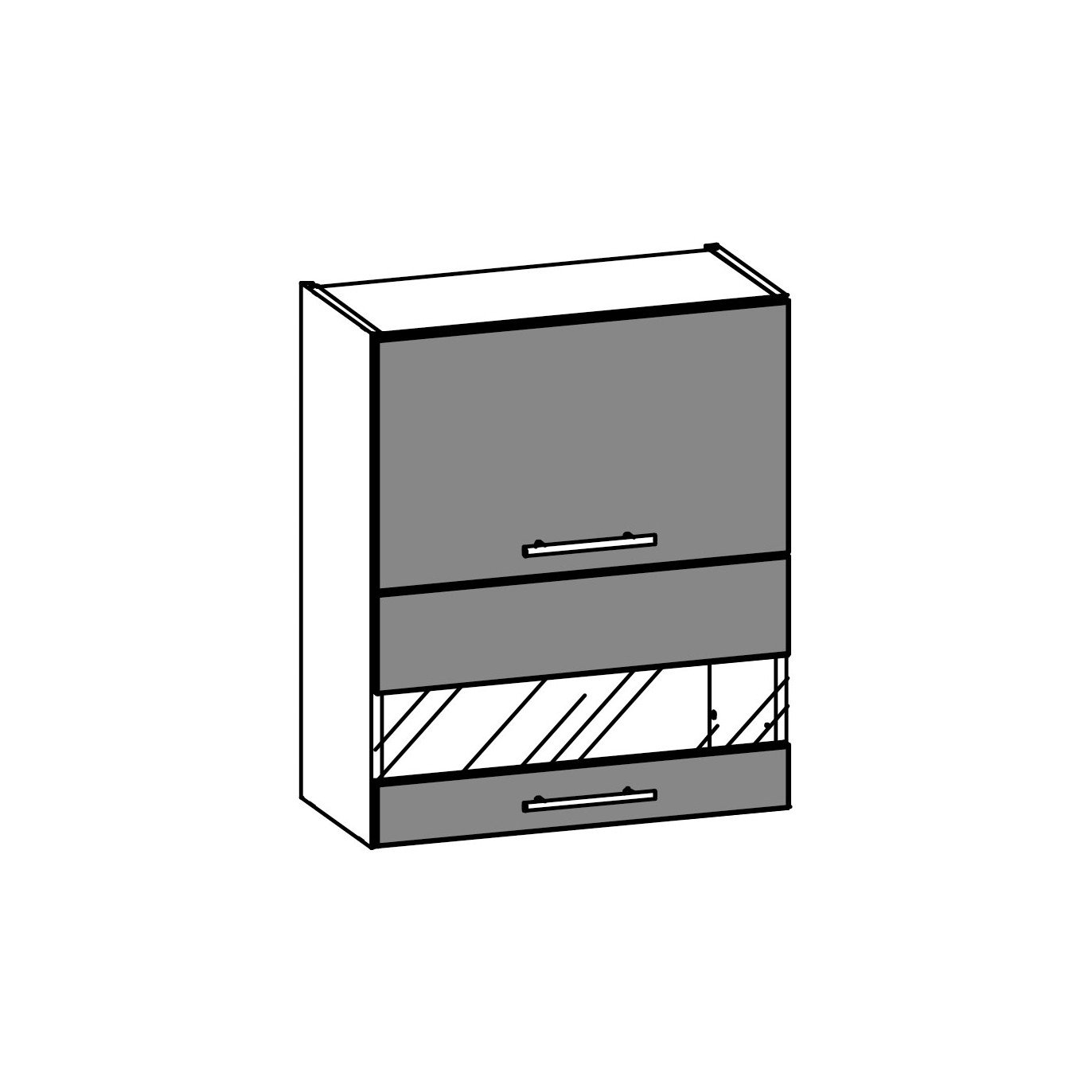 Spintelė pagamintos iš 16 mm laminuotos medžio drožlių plokštės (LMDP). Spintelės lentynos taip pat 16 mm storio. Korpuso spalva: Balta matinė .Durelių spalva: Pilka blizgi , Balta blizgi